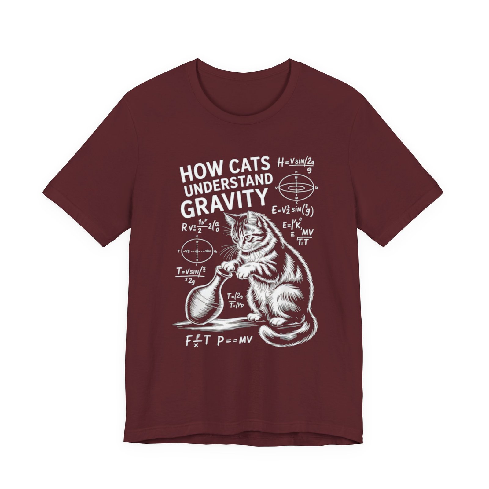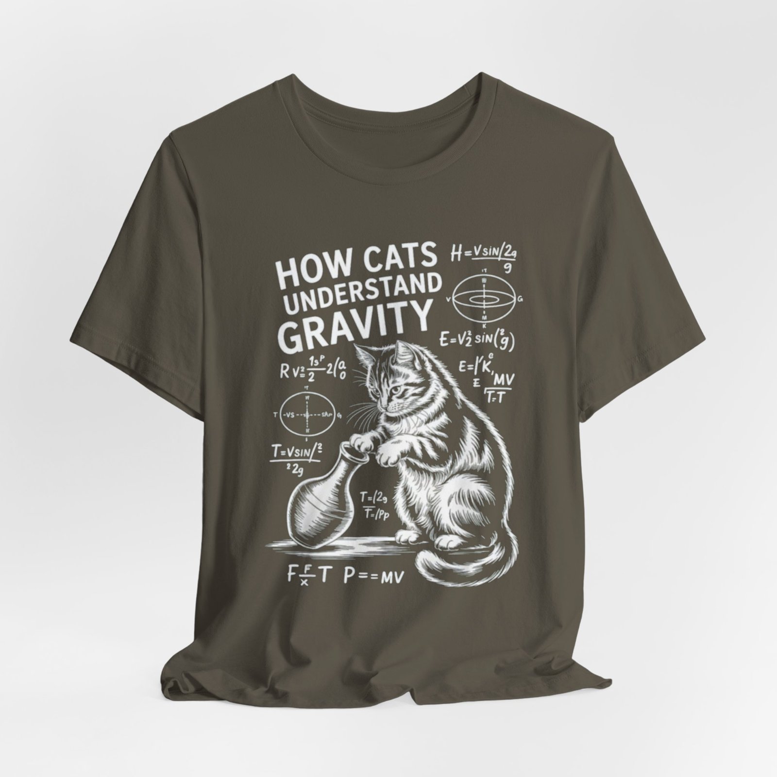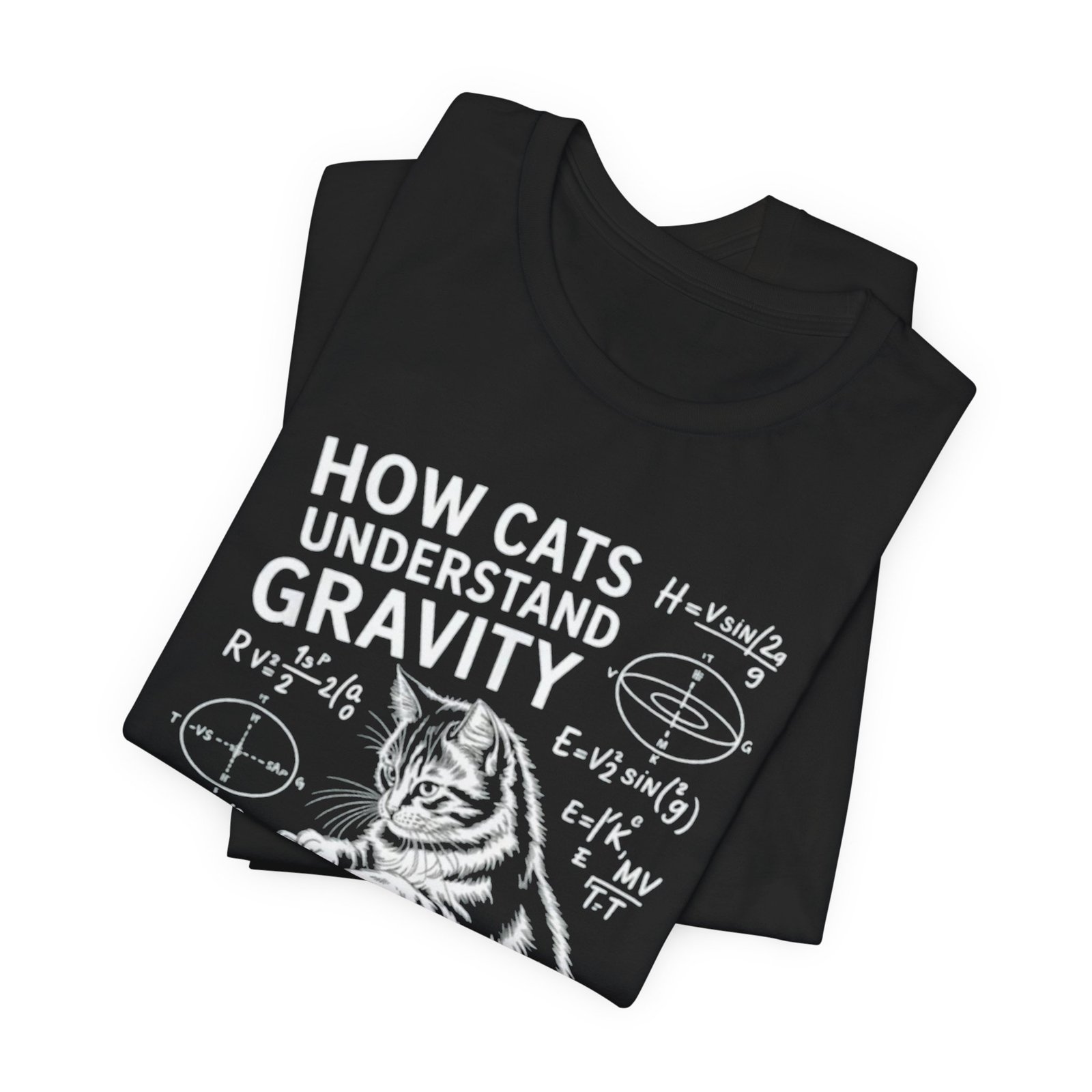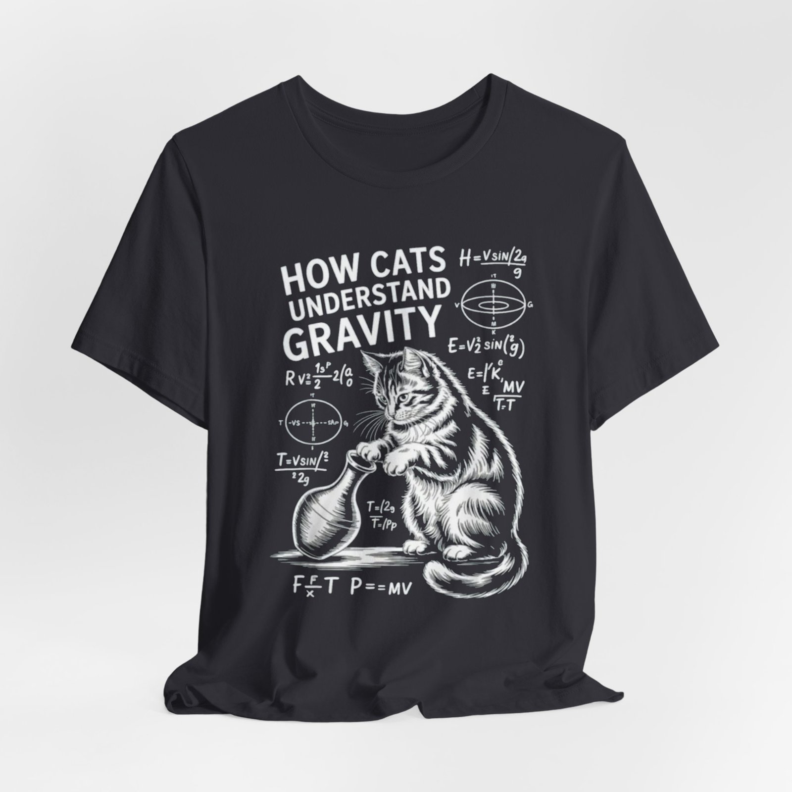 Soft, breathable cotton meets sly humor. This lightweight crew tee features a chalkboard-style illustration of two curious cats and hand-drawn physics formulas under the heading “How Cats Understand Gravity.” It feels lived-in from day one and layers easily under jackets or over long sleeves. Wear it to labs, lectures, coffee runs, or lazy Sundays when curiosity and cat antics are the agenda. The friendly, slightly vintage print reads like a scientist’s doodle—clever, warm, and quietly nerdy—so it becomes part of everyday outfits for anyone who loves animals and science.