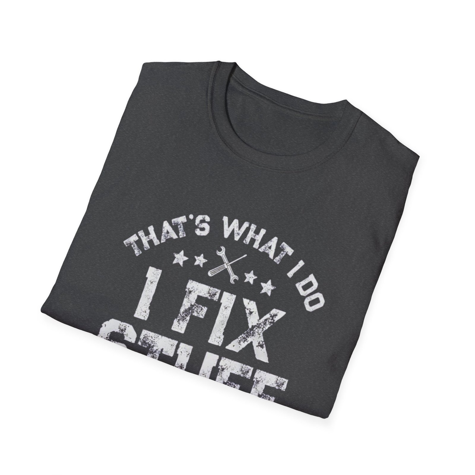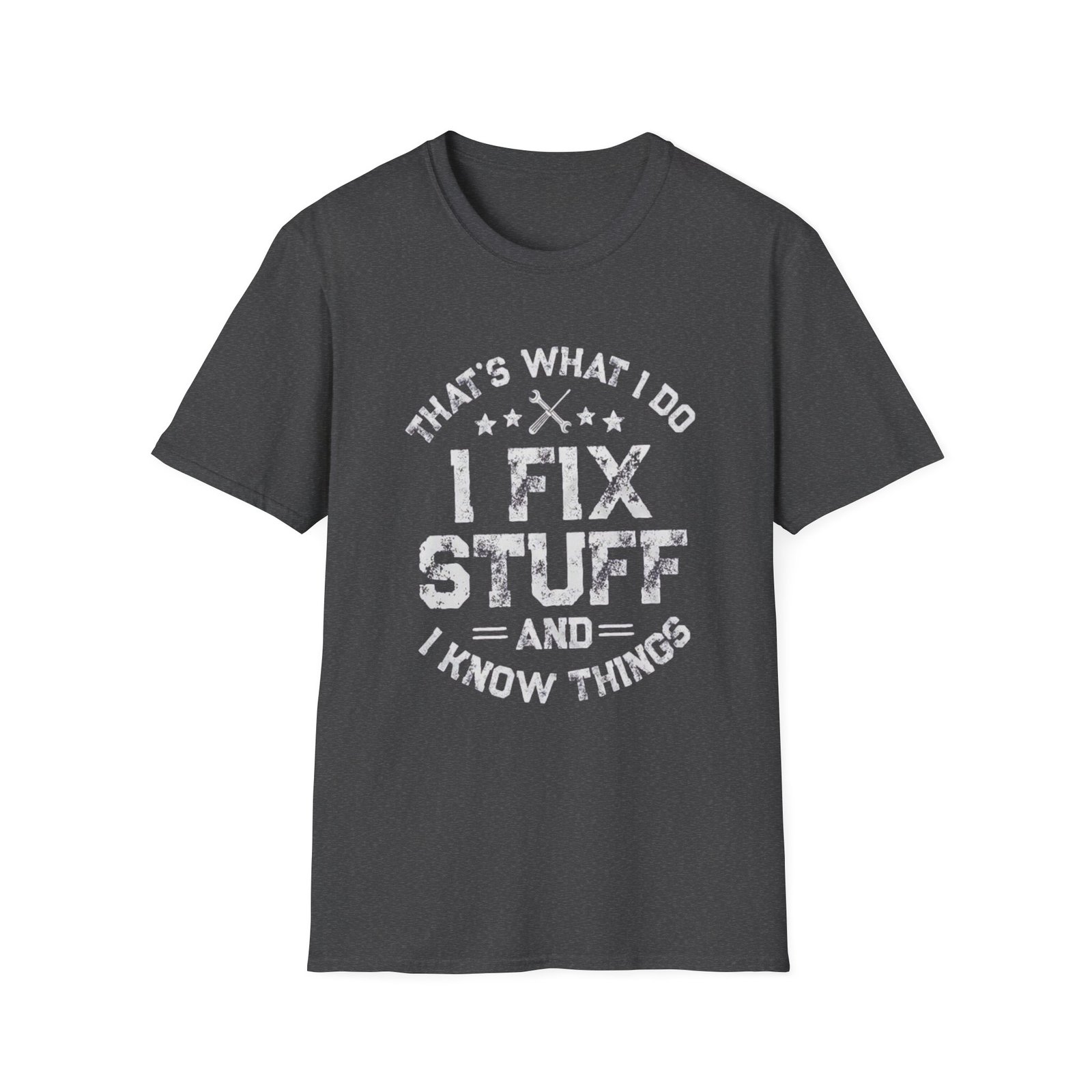 This lightweight tee carries a lived-in, handyman energy — worn by people who tinker, troubleshoot, and take pride in practical skill. The distressed, bold typography reads “I FIX STUFF AND I KNOW THINGS,” giving the shirt an authentic workshop vibe that pairs well with grease-stained jeans, a worn tool belt, or weekend projects in the garage. It’s breathable and soft, so it stays comfortable through long afternoons of repairs or casual meet-ups with fellow makers. The clean crew neck and classic fit keep the look versatile: layer under a flannel for colder days, or wear solo when warm weather calls for hands-on work. Thoughtfully made details like a tear-away label and durable ribbed collar mean the tee looks and feels good after repeated wear and washes.
