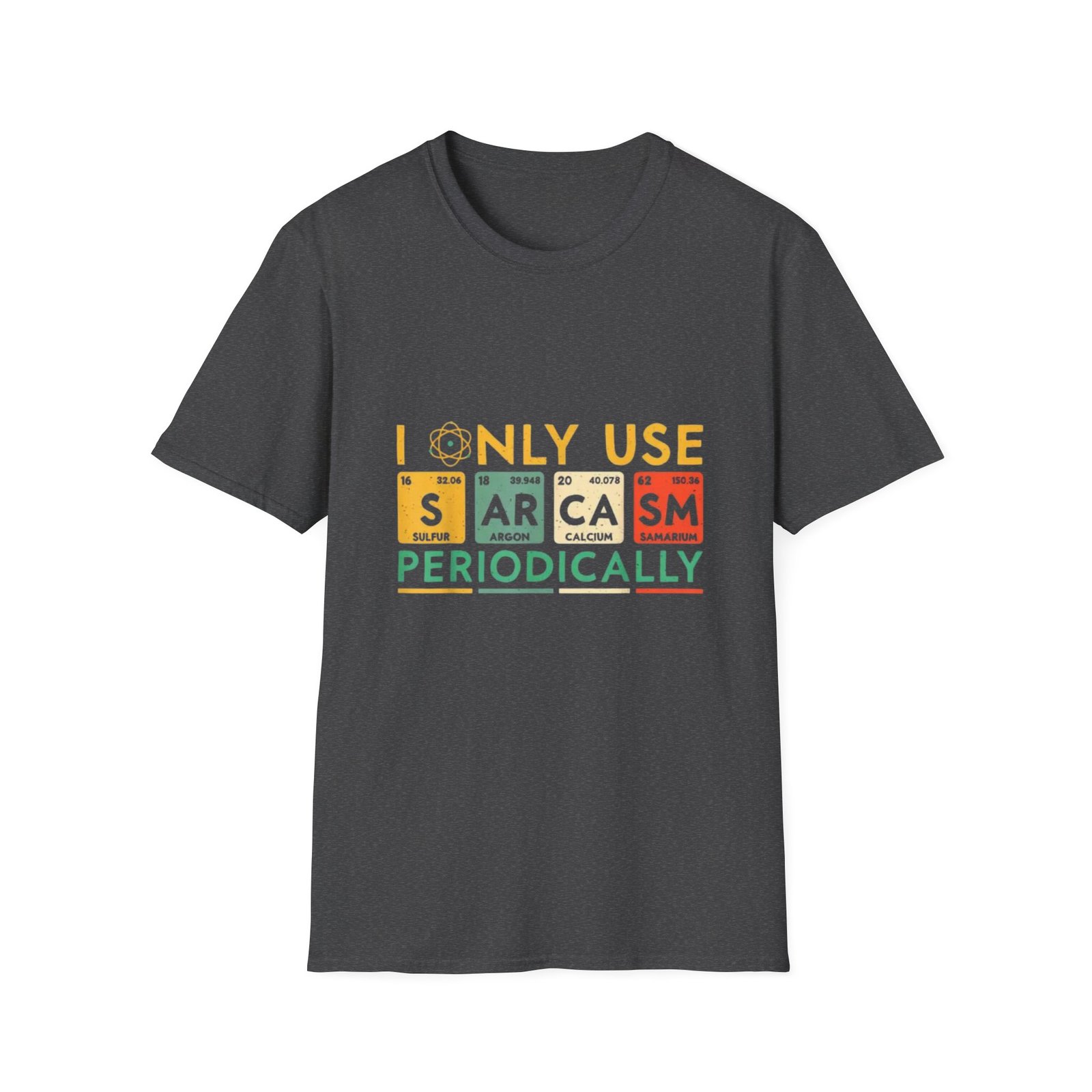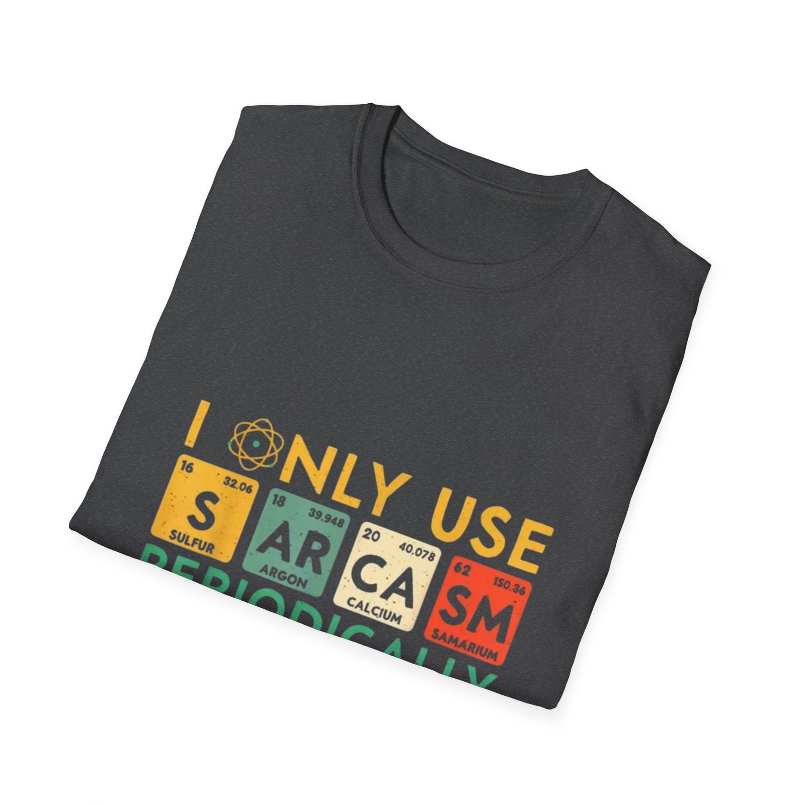 This lightweight tee carries a sharp wink of personality—bold, bright lettering reads “I only use sarcasm periodically,” arranged like playful periodic-table tiles. The soft ring-spun cotton feels breathable against skin, draping cleanly in a classic crew silhouette. Wear it on casual days when you want your humor to do the talking: layered under a jacket for coffee runs, paired with jeans for study sessions, or worn at low-key gatherings where a dry joke lands best. The printed tiles add a scientific, nerdy edge without taking itself too seriously, so it blends into classroom labs, makerspaces, and weekend hangouts alike. The tear-away label and reinforced shoulders keep it comfortable through repeated wears and washes. Colors include neutral and heather options with subtle texture, offering an easy base for everyday rotation.