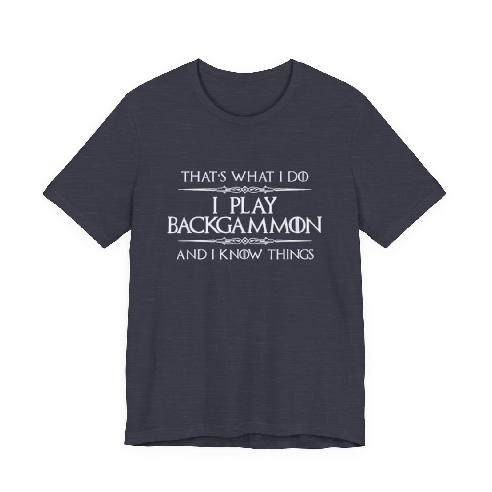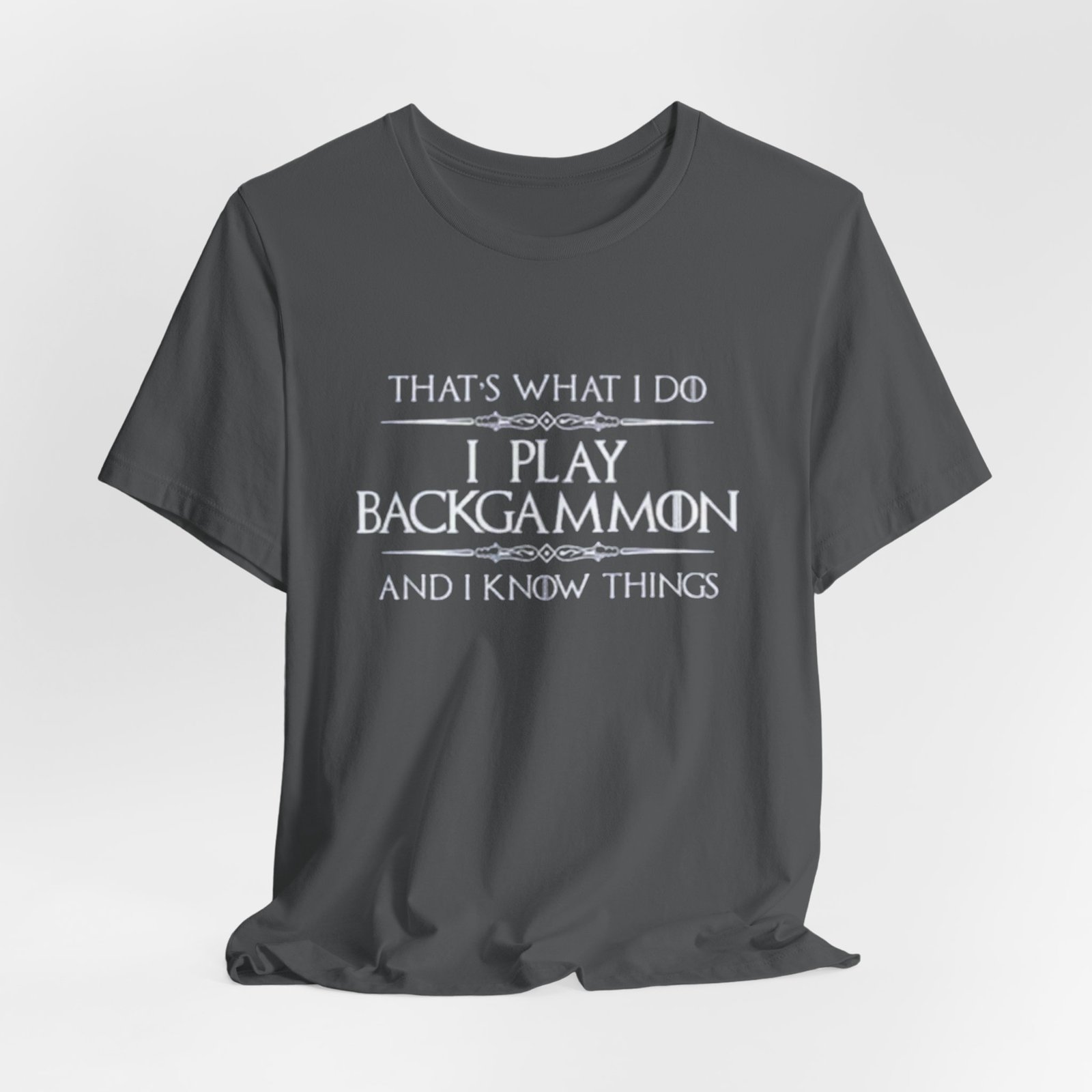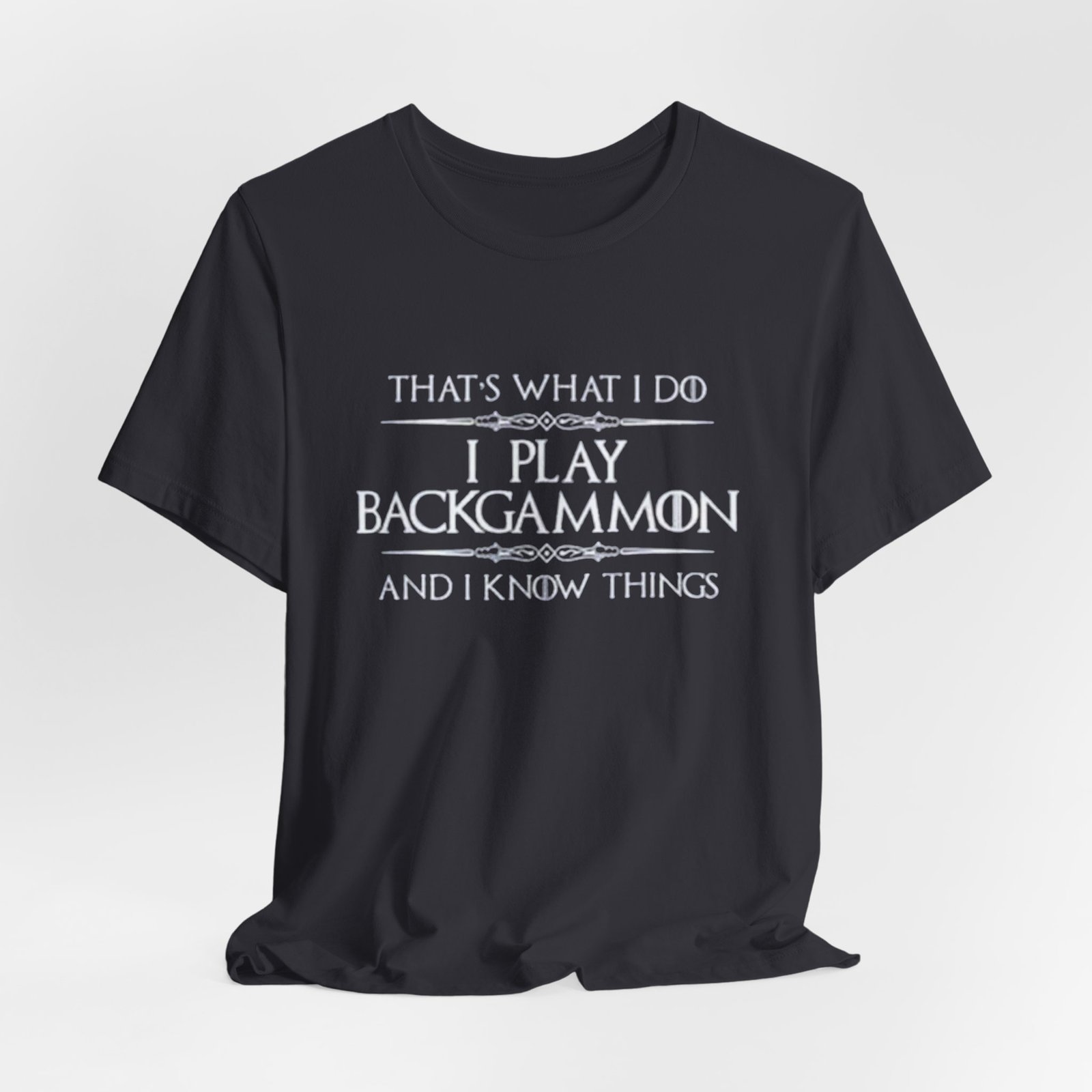 Soft, breathable jersey that carries a quiet, clever joke for anyone who plays backgammon. The lightweight cotton lays flat under a cardigan or over a tournament hoodie, so the message — “That’s what I do. I play backgammon and I know things.” — becomes a casual, confident statement among fellow players. The slim retail cut and ribbed crew neck keep the silhouette tidy, while side seams and shoulder tape mean it holds its shape after repeated washes. Wear it to club nights, casual matches, or relaxed weekends at home; it feels lived-in from the first wear and stays comfortable all day. Thoughtful details like a tear-away label and responsibly sourced fabric make it an easy choice for someone who cares about fit and ethics as much as strategy.