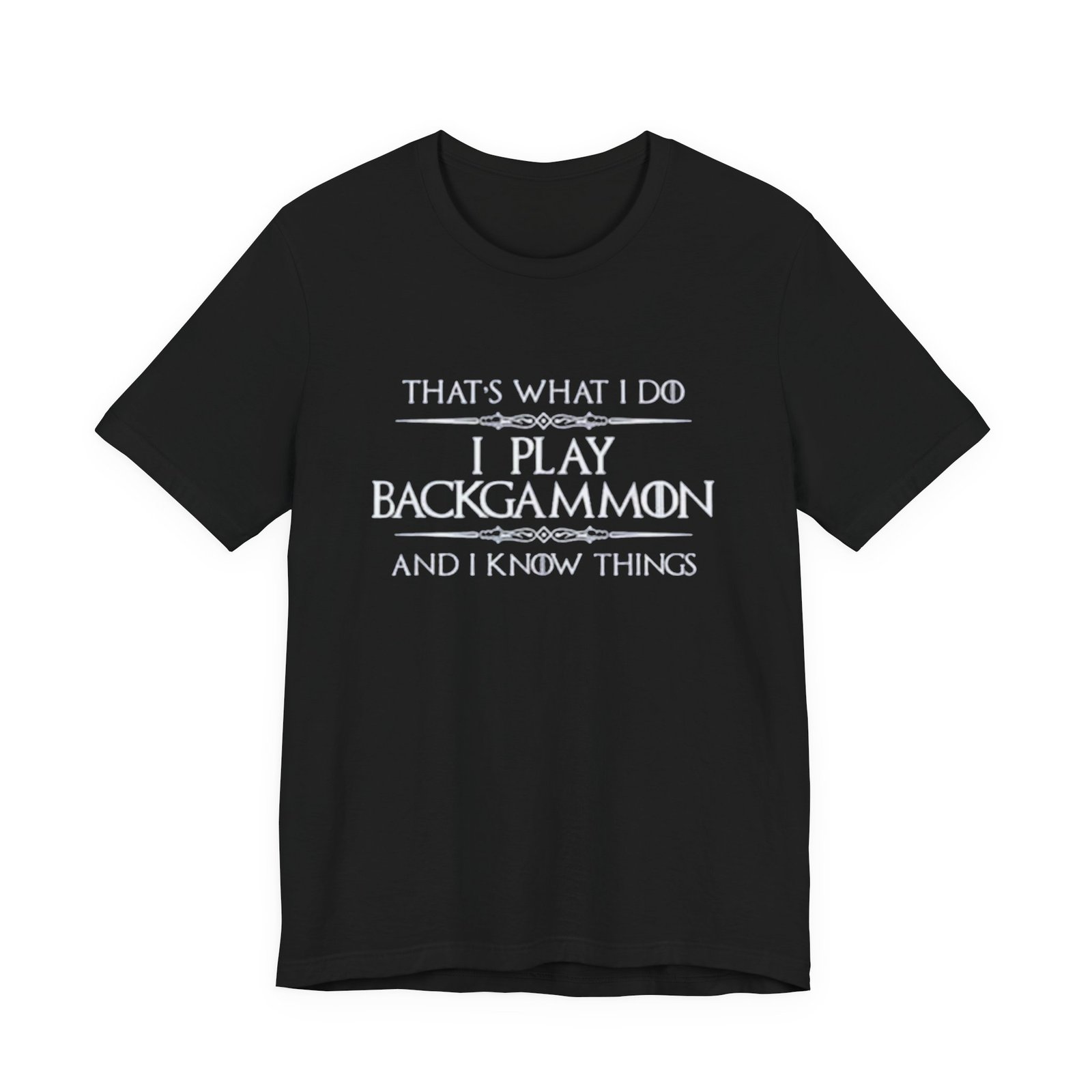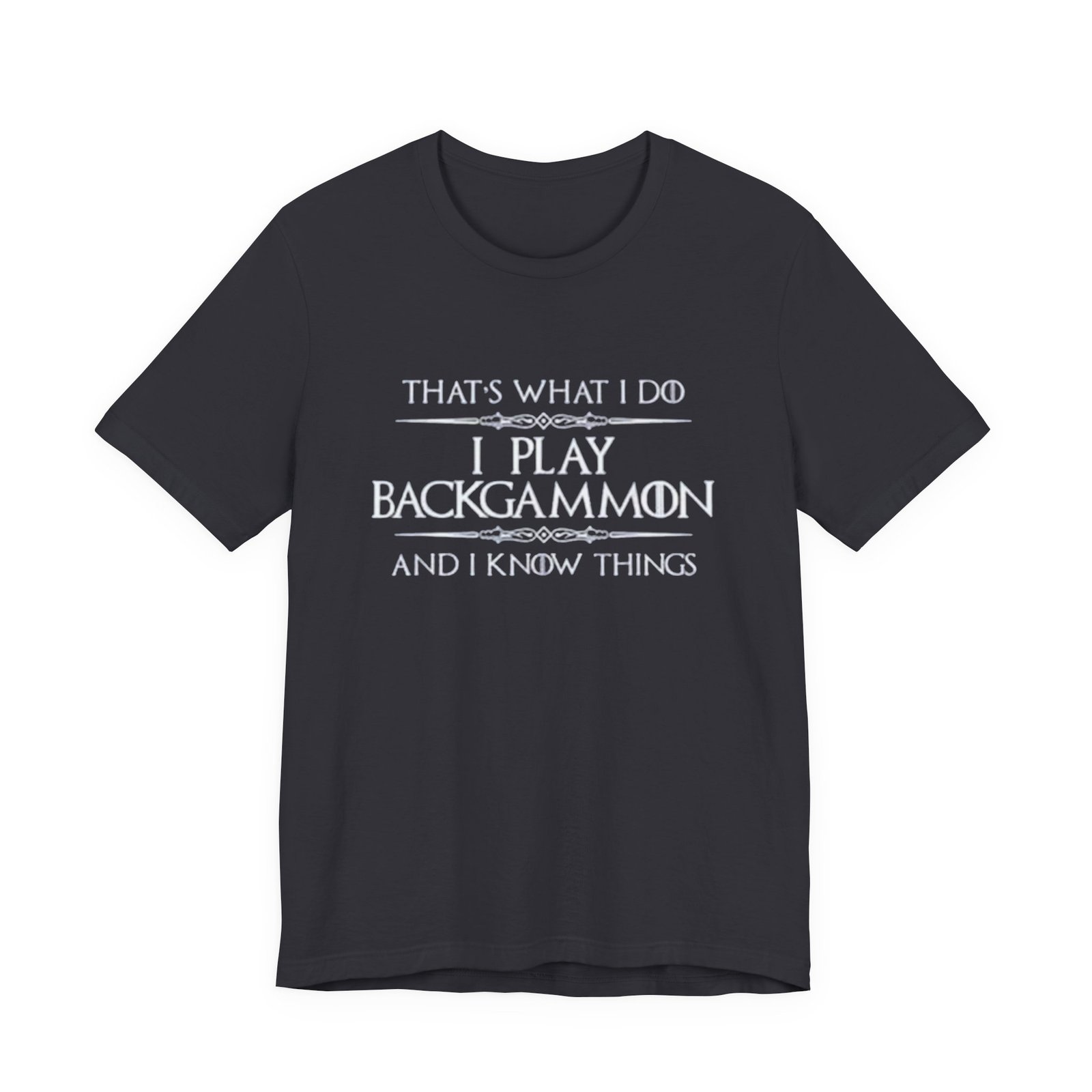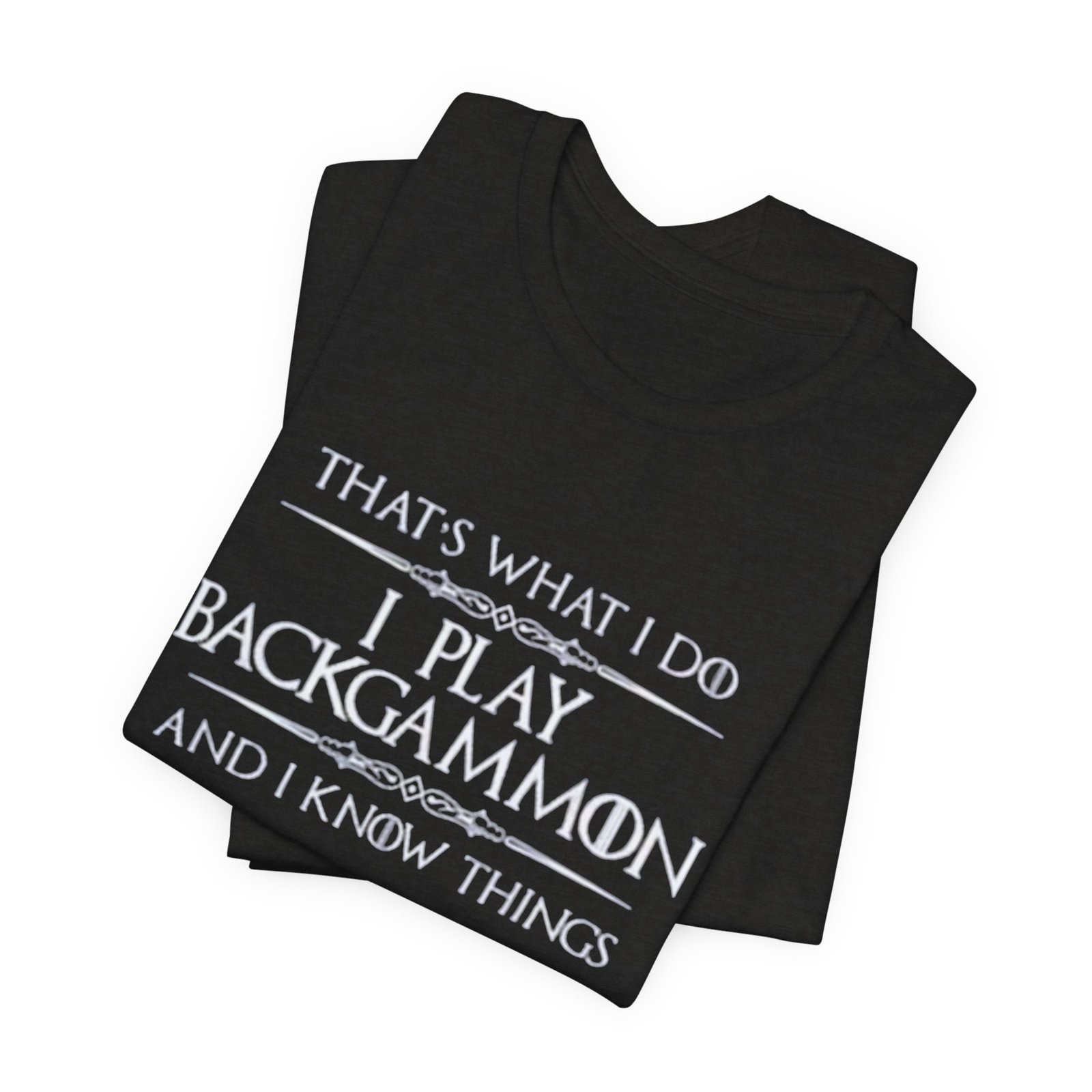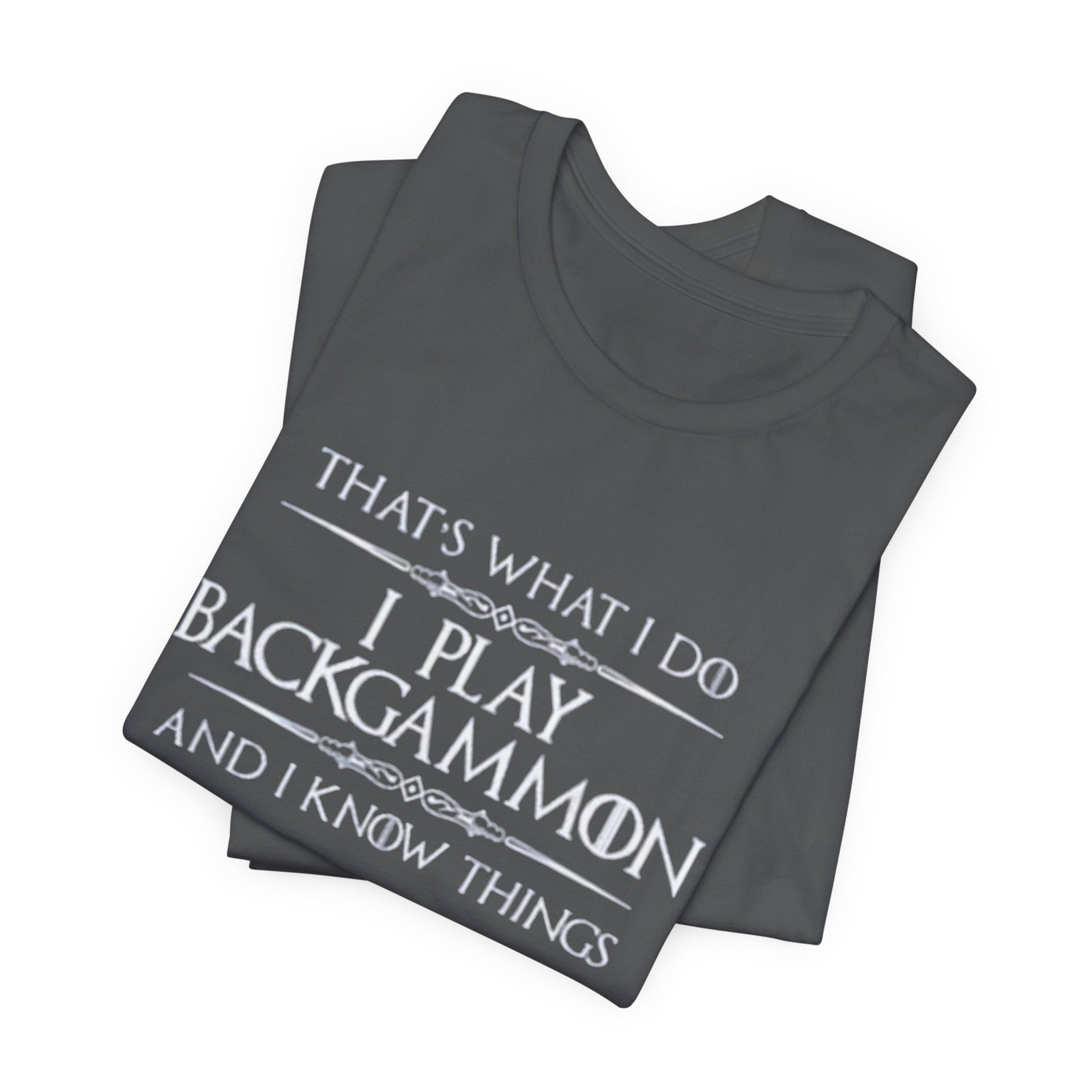 Soft, breathable jersey that carries a quiet, clever joke for anyone who plays backgammon. The lightweight cotton lays flat under a cardigan or over a tournament hoodie, so the message — “That’s what I do. I play backgammon and I know things.” — becomes a casual, confident statement among fellow players. The slim retail cut and ribbed crew neck keep the silhouette tidy, while side seams and shoulder tape mean it holds its shape after repeated washes. Wear it to club nights, casual matches, or relaxed weekends at home; it feels lived-in from the first wear and stays comfortable all day. Thoughtful details like a tear-away label and responsibly sourced fabric make it an easy choice for someone who cares about fit and ethics as much as strategy.