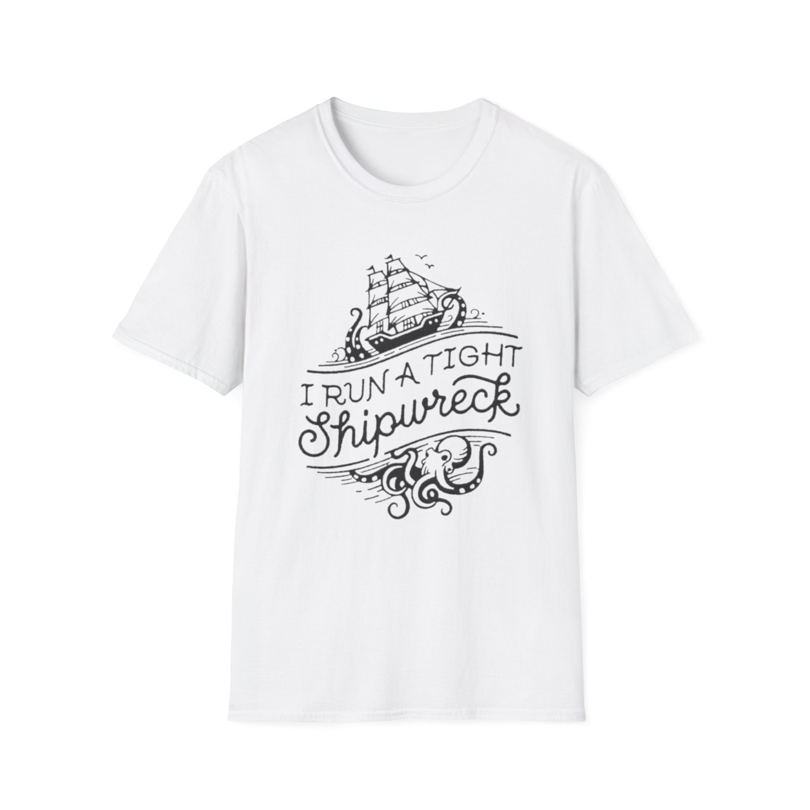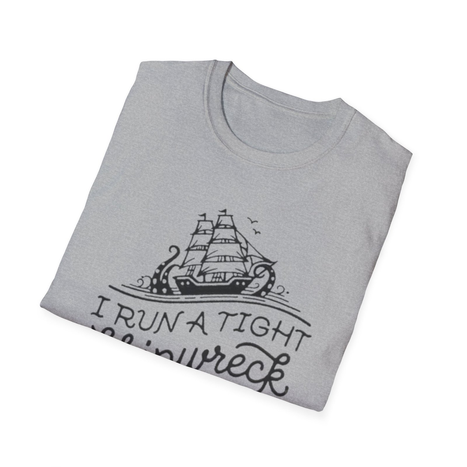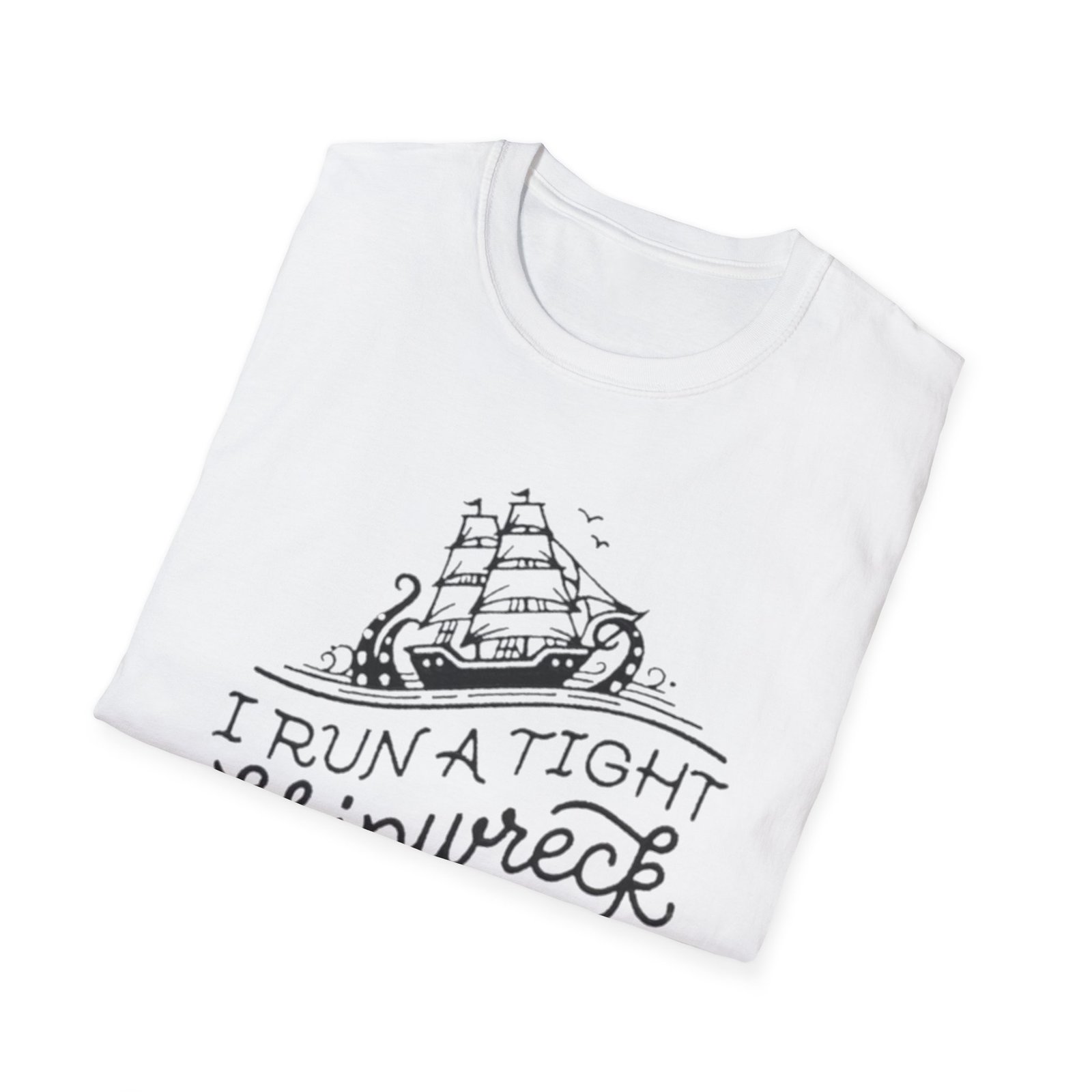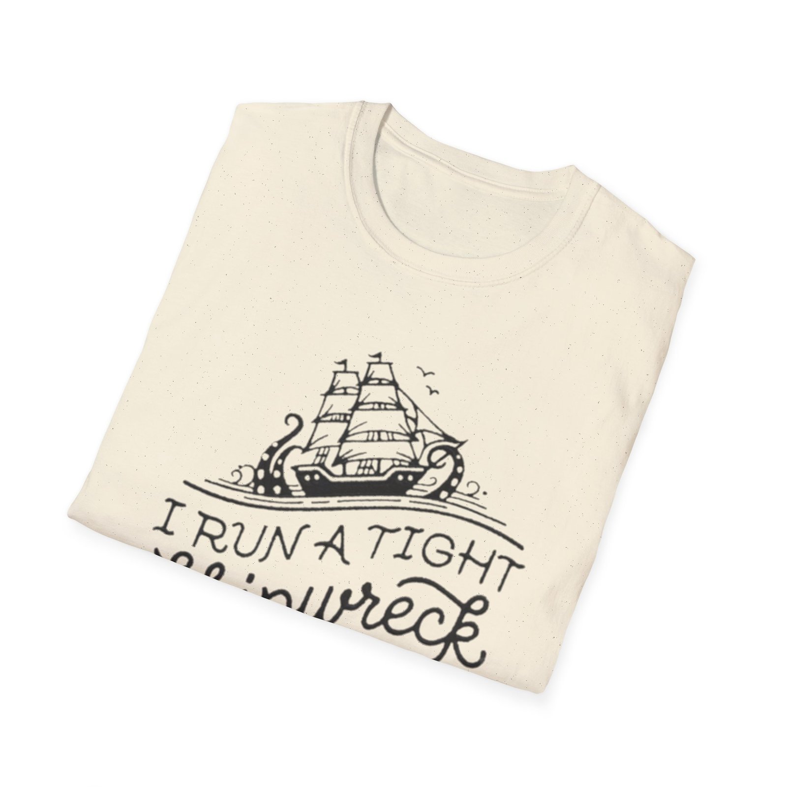Lightweight, breathable, and made to be worn on the water or at the bar—this cotton tee carries a hand-drawn nautical design and playful lettering that reads “I Run a Tight Shipwreck.” The illustration blends a classic sailing ship with swirling waves and rope details, printed in crisp monochrome to keep the look clean and wearable. It settles comfortably at the shoulders and chest thanks to a classic crew neckline and a relaxed fit, while the tear-away label and soft ring-spun cotton ensure all-day comfort. This shirt feels like a wry wink to anyone who navigates life’s chaos with humor—perfect for salty evenings, coastal weekends, or casual meetups with fellow sea lovers.