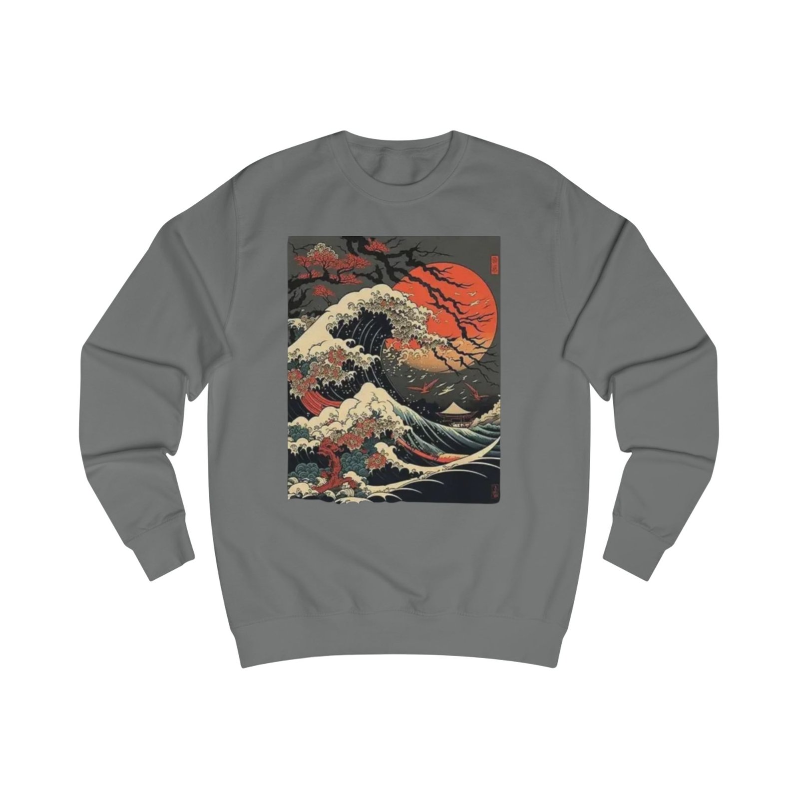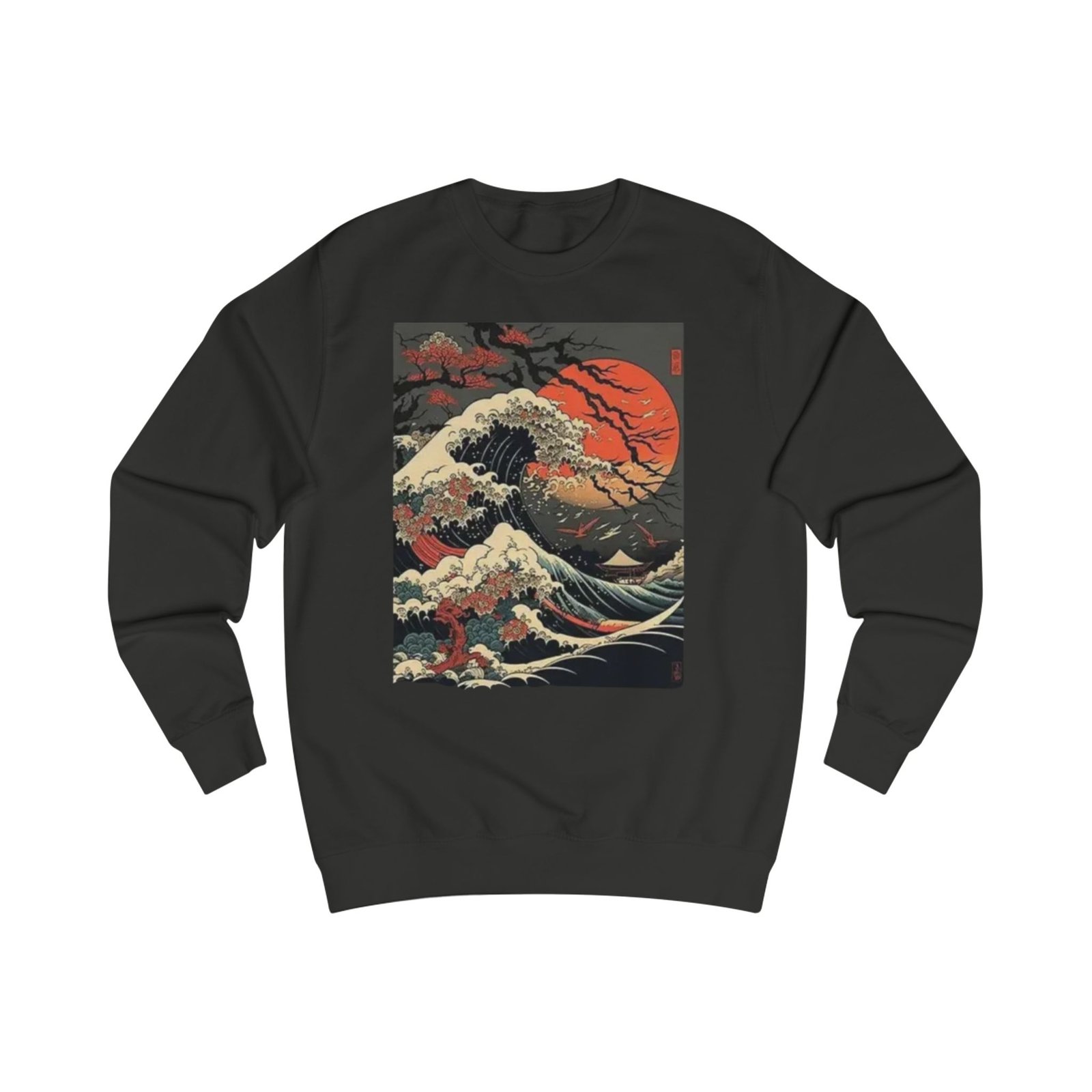 An artful sweatshirt that brings bold, coastal energy to everyday wear. The front features a dramatic wave and red sun composition inspired by traditional Japanese woodblock prints — crashing lines, textured shading, and moody tones that feel both historic and modern. Medium-heavy fabric and a ribbed collar give it a sturdy, comfortable drape, while thoughtful construction (side seams, necktape, tear-away label) keeps the fit looking sharp after repeated wear. Wear it layered on chilly walks, at late-night gallery hangs, or when you want your outfit to tell a quiet, cinematic story.