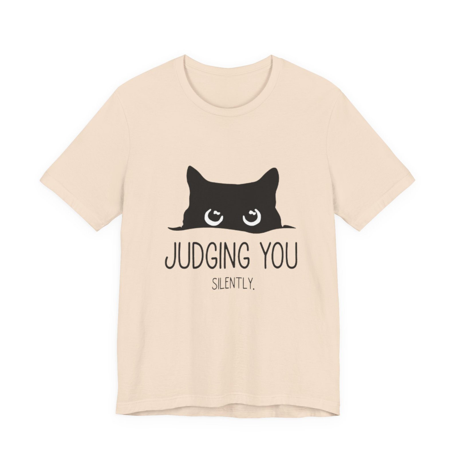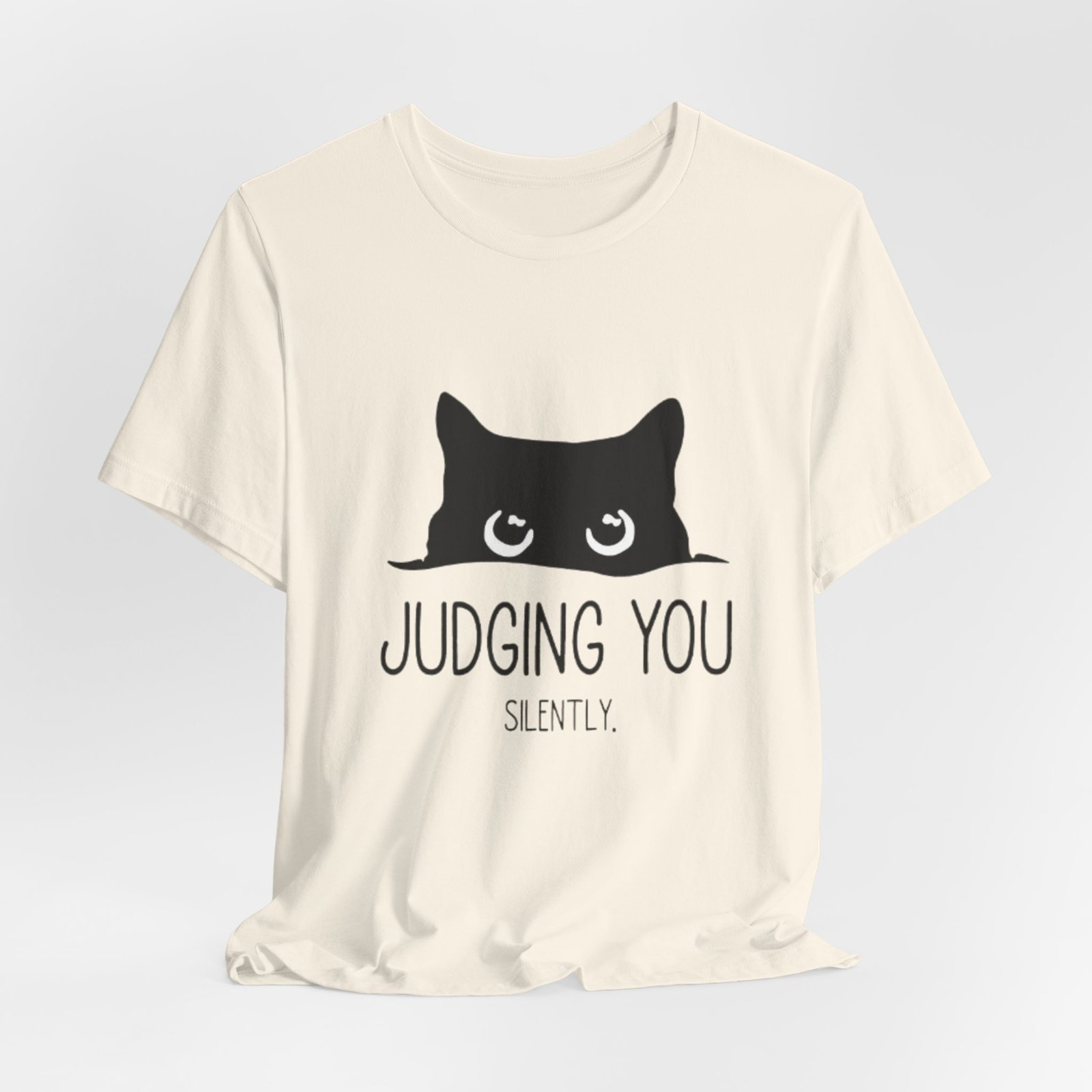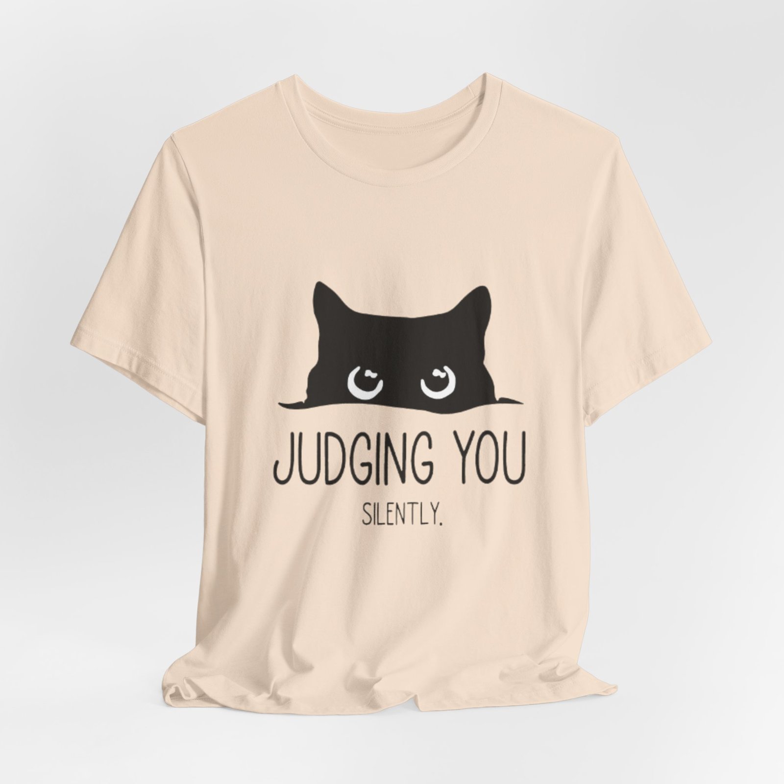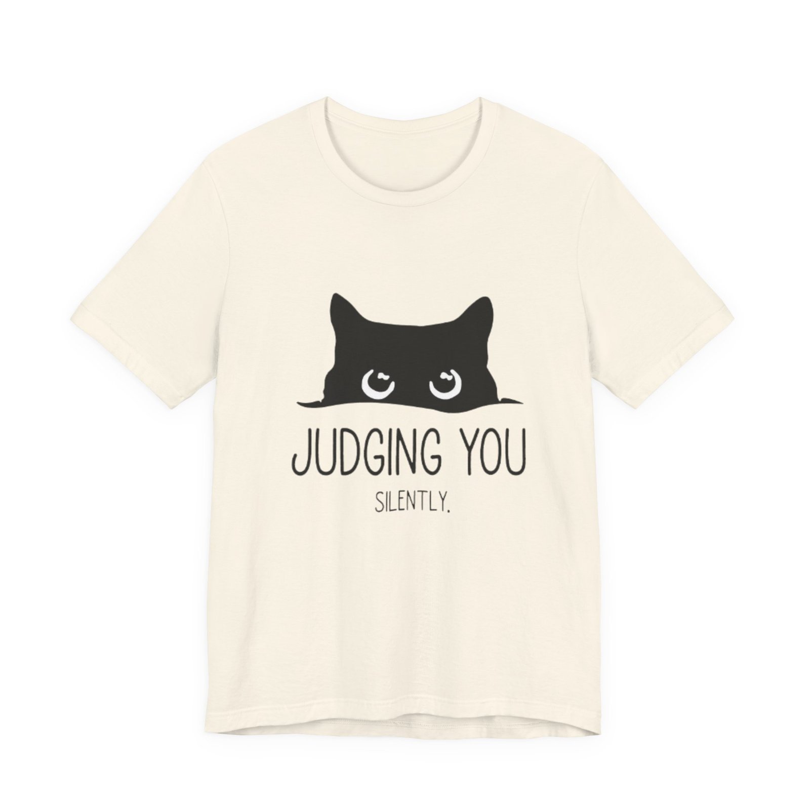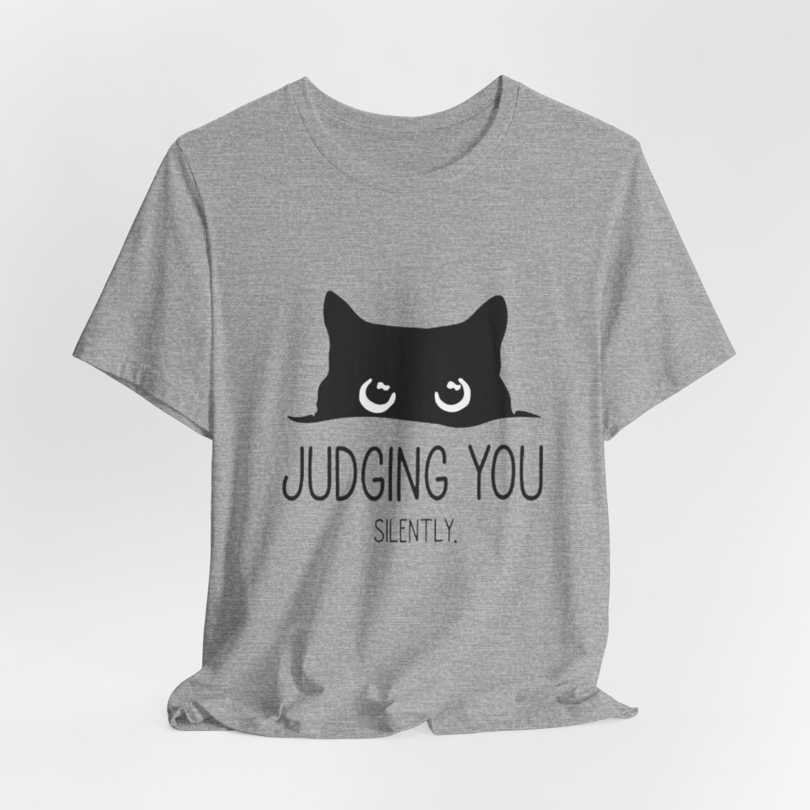 Soft, breathable, and quietly sarcastic — this jersey tee features a minimalist cat silhouette peeking over the hem with the understated line “JUDGING YOU. SILENTLY.” It sits close to the body without feeling tight, so it layers easily under a jacket or wears alone while keeping movement and comfort front and center. The lightweight Airlume cotton knit feels cool against the skin and the ribbed collar and shoulder tape keep the shirt looking neat after many wears. Wear it on errands, at low-key hangouts, or when you want to convey very dry humor without saying a word. The black screen-style print stays crisp on the sleeve and front thanks to modern printing techniques, and the tear-away label keeps the back of your neck itch-free.