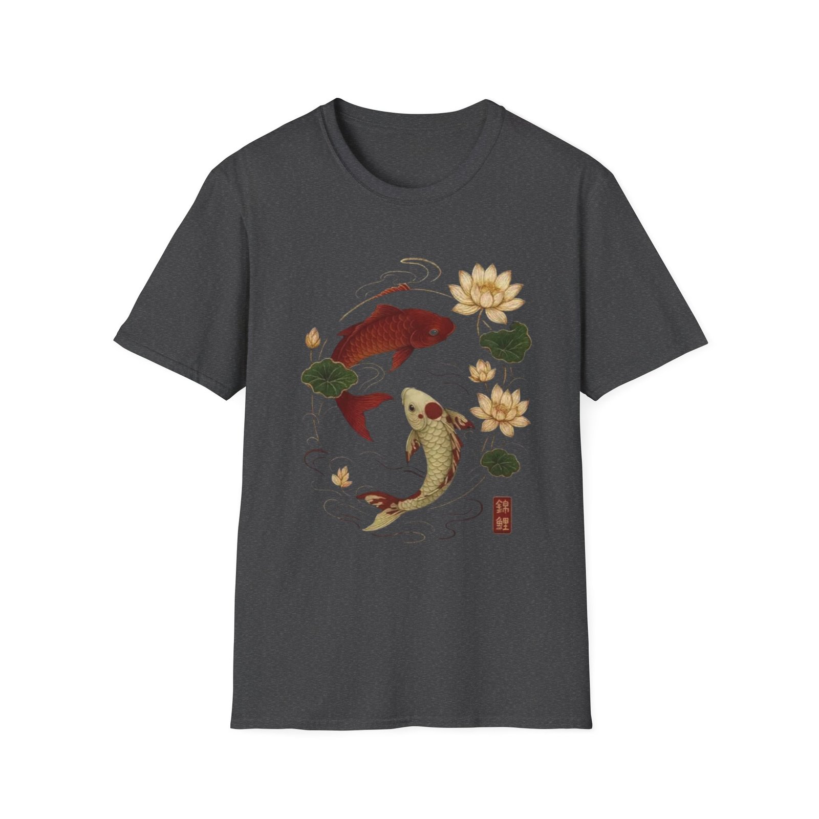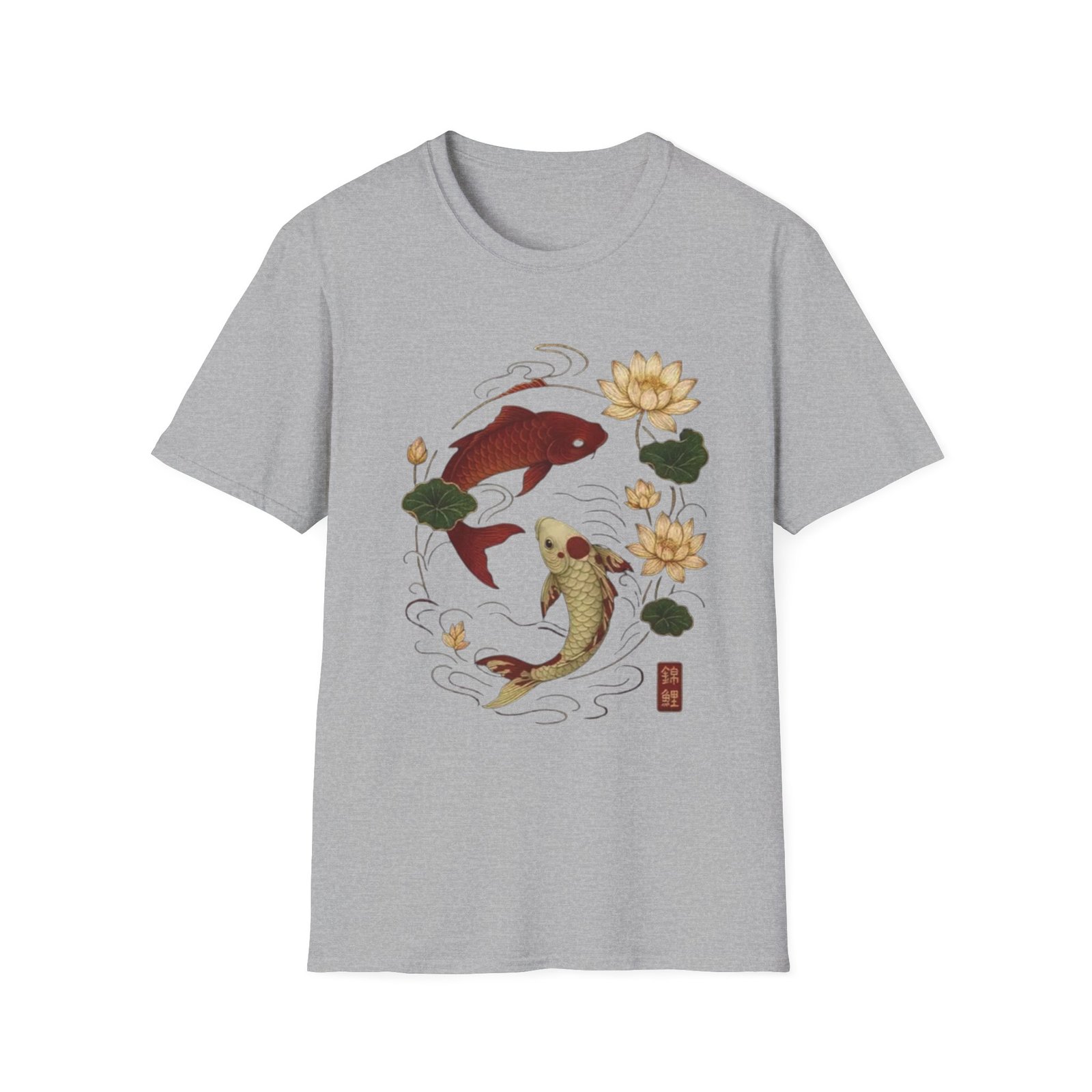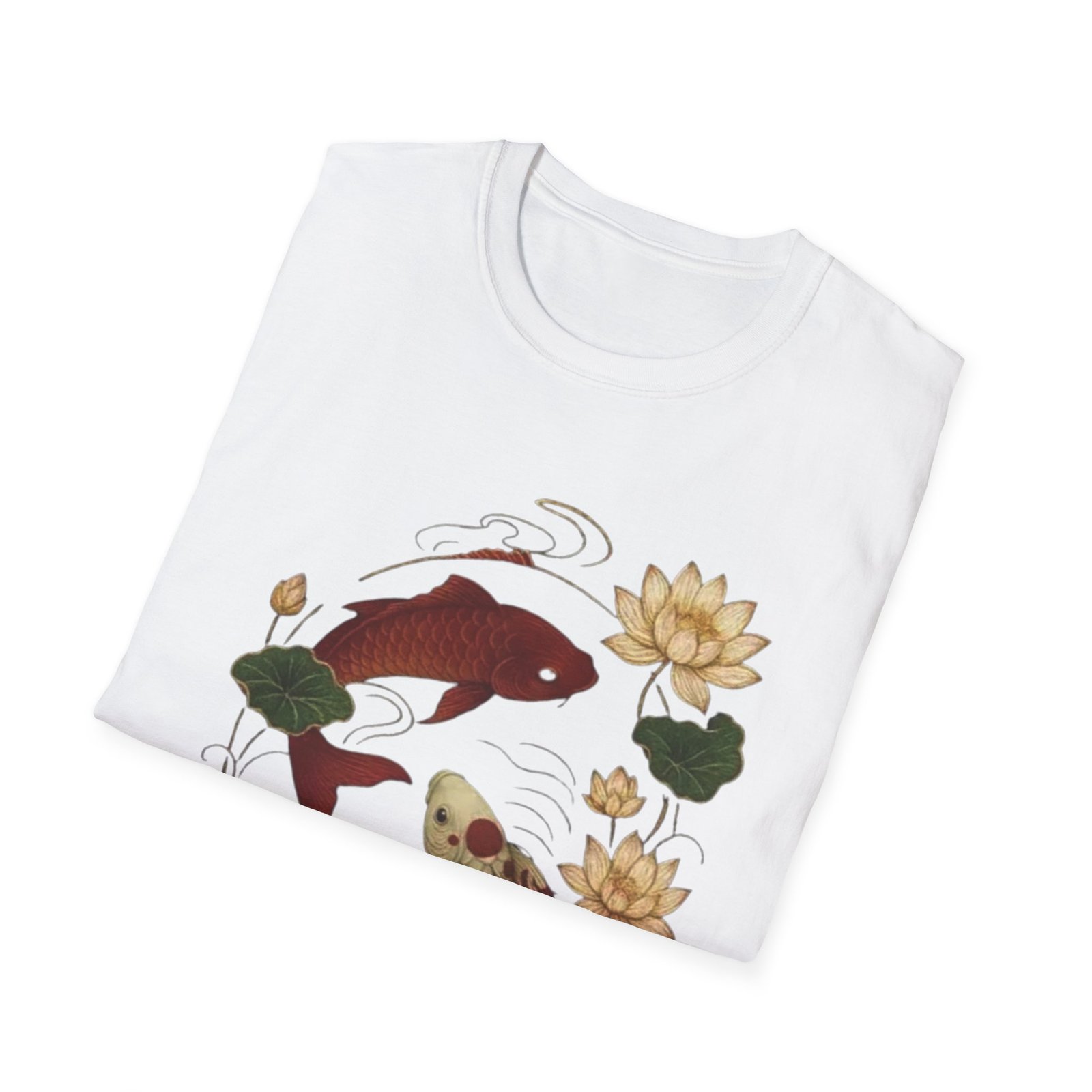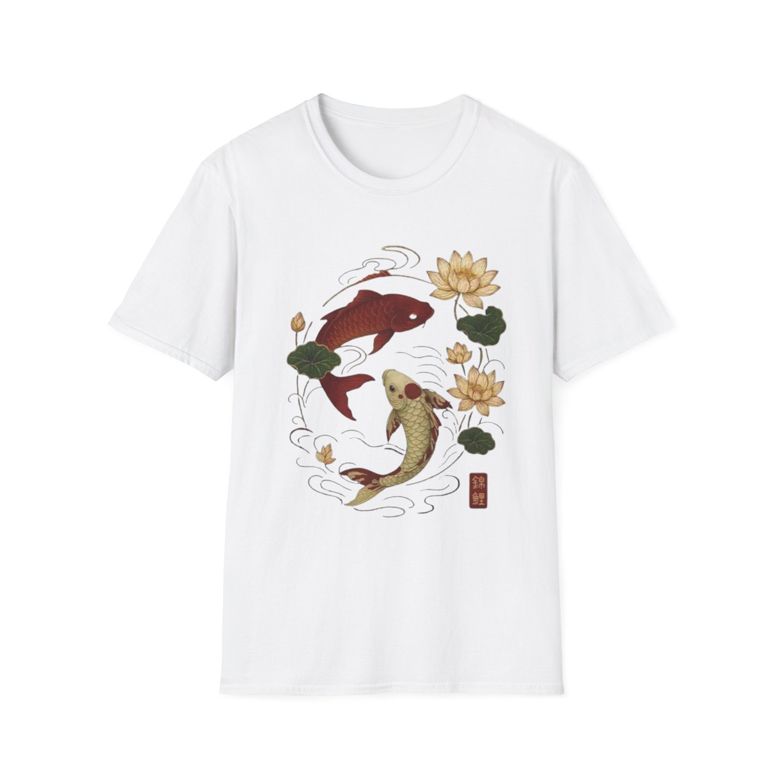 Two koi, circling like a whispered promise, float amid lotus blooms on a soft white tee. The illustration blends traditional Japanese brushwork with gentle, muted tones — deep red and warm gold koi, green lotus pads, and flowing water lines — creating a calm, meditative scene. Wear it when you want a quiet piece that reads like a small talisman: subtle symbolism of balance, resilience, and quiet renewal. The lightweight cotton feels breathable against skin and keeps the print crisp, making this shirt a good companion for slow mornings, gallery strolls, or afternoons at a tea house.