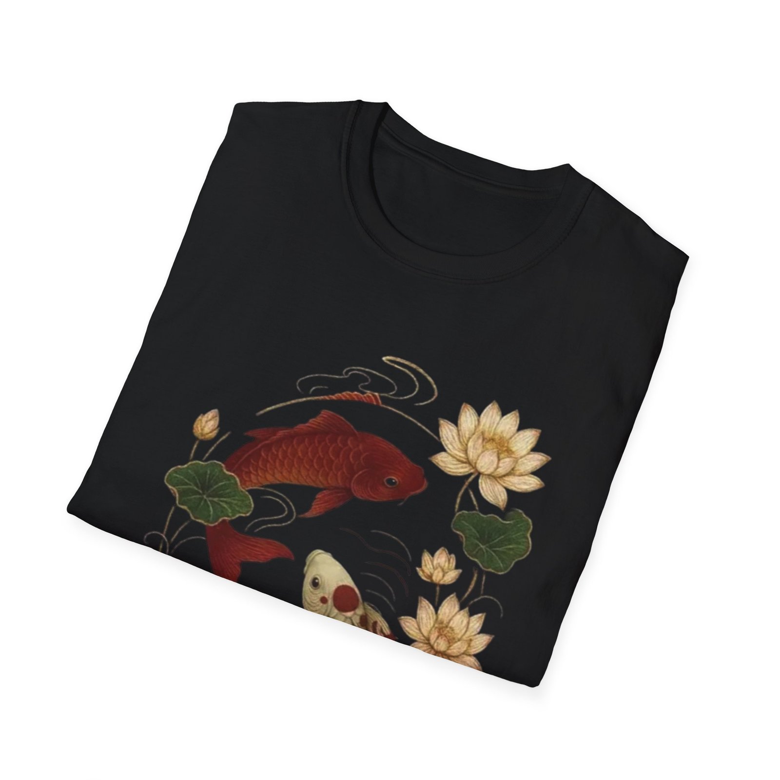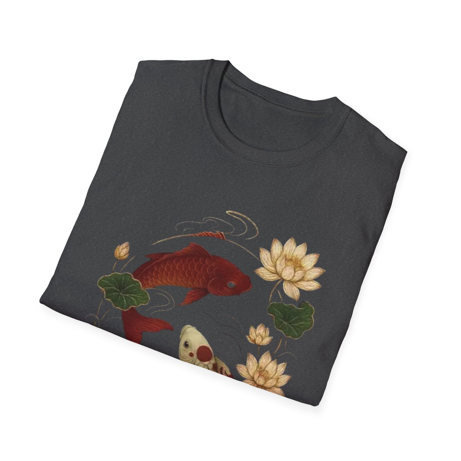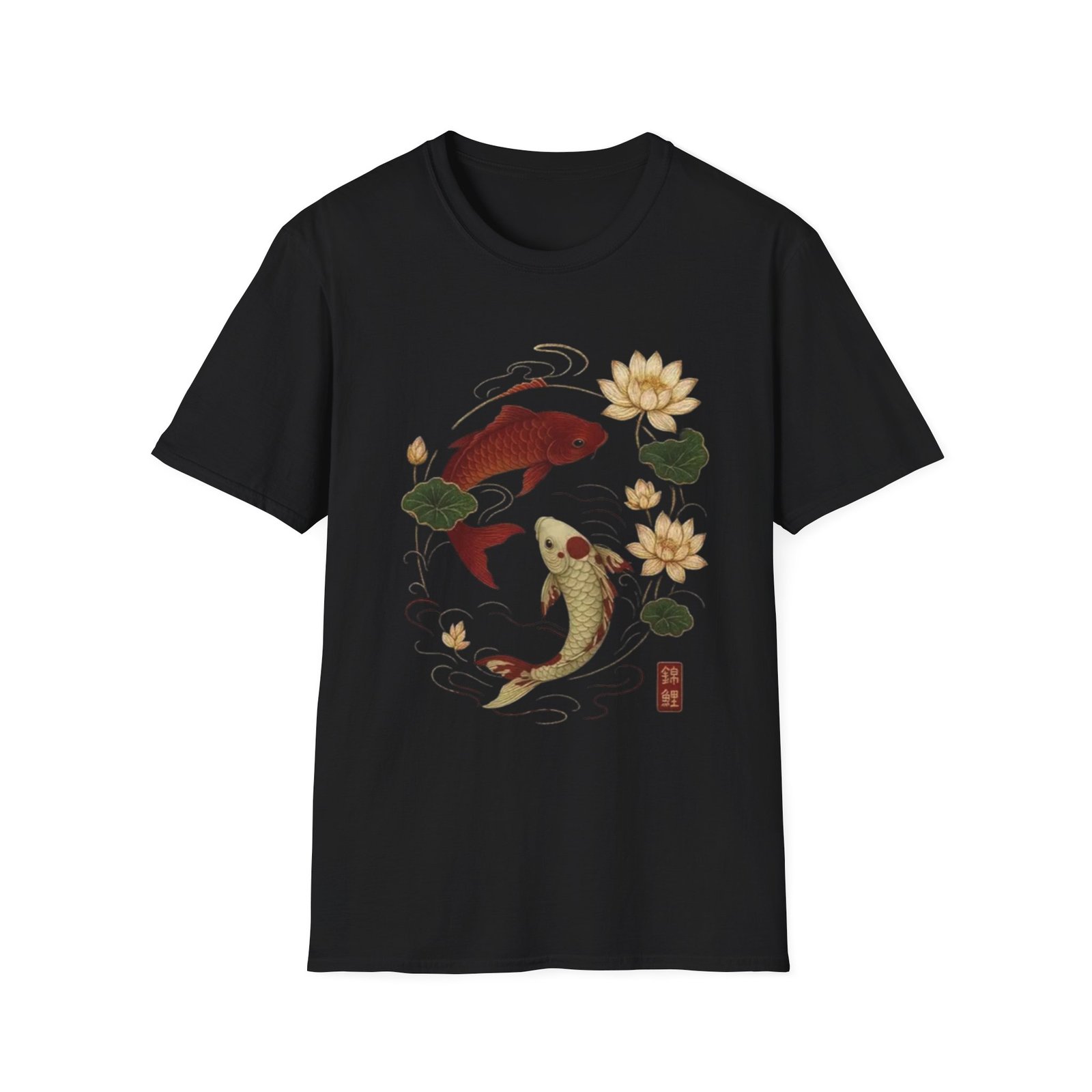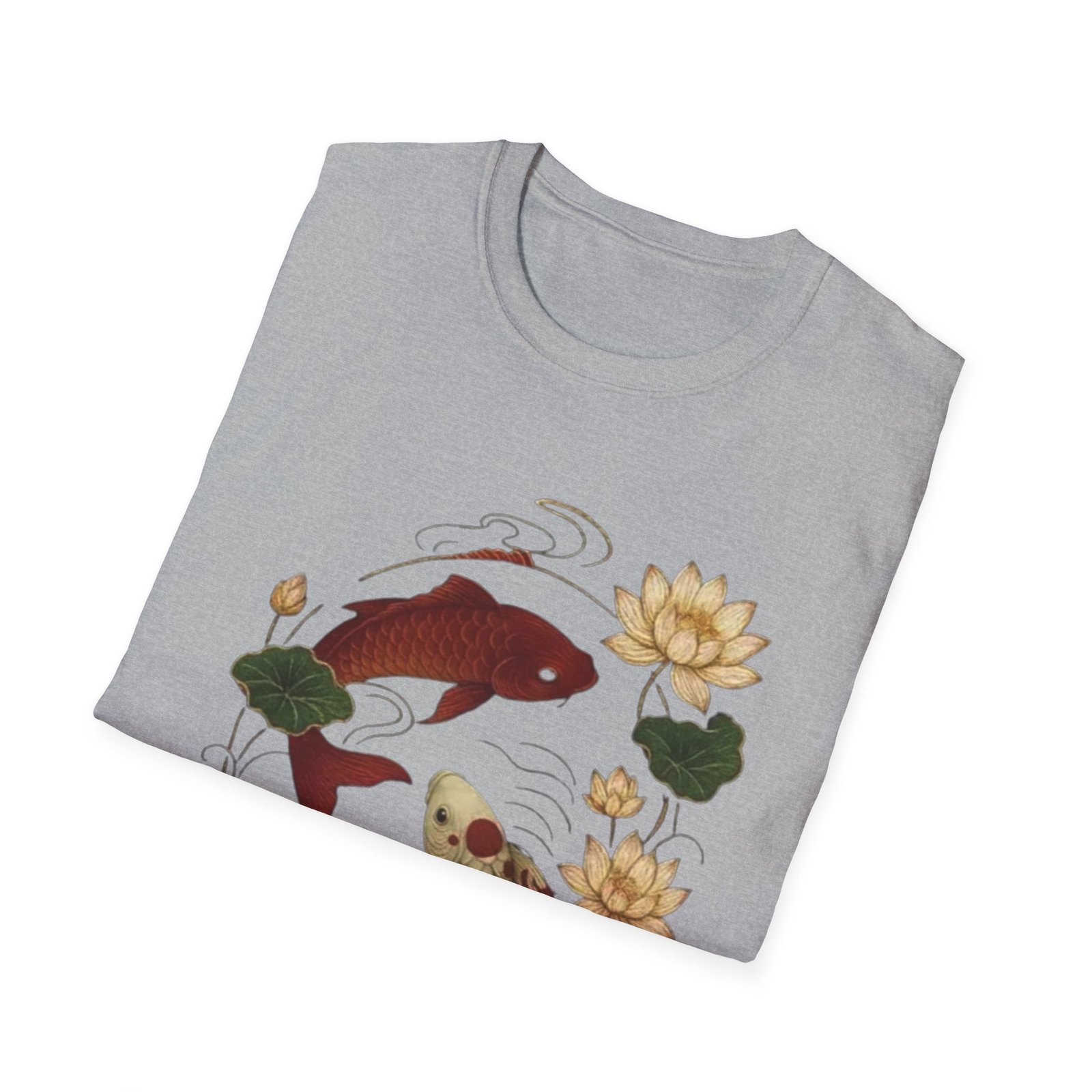 Two koi, circling like a whispered promise, float amid lotus blooms on a soft white tee. The illustration blends traditional Japanese brushwork with gentle, muted tones — deep red and warm gold koi, green lotus pads, and flowing water lines — creating a calm, meditative scene. Wear it when you want a quiet piece that reads like a small talisman: subtle symbolism of balance, resilience, and quiet renewal. The lightweight cotton feels breathable against skin and keeps the print crisp, making this shirt a good companion for slow mornings, gallery strolls, or afternoons at a tea house.
