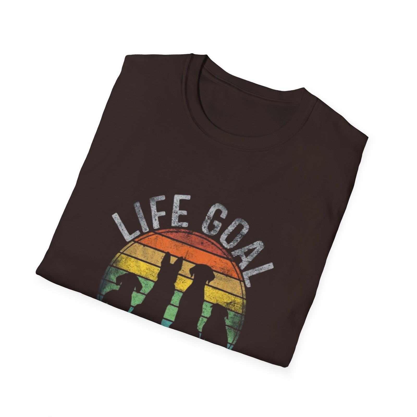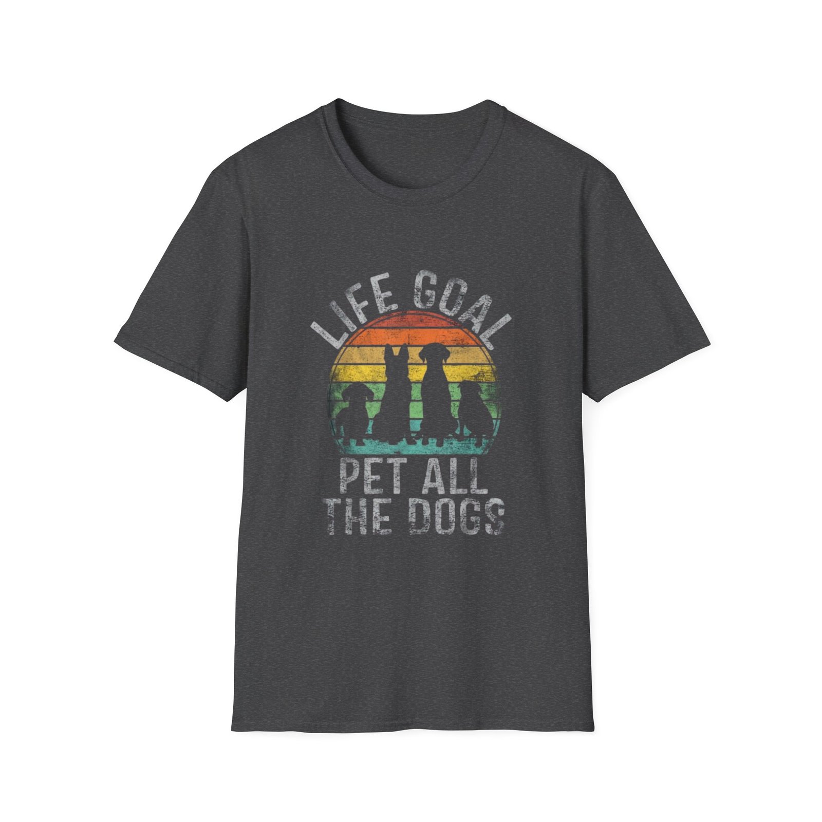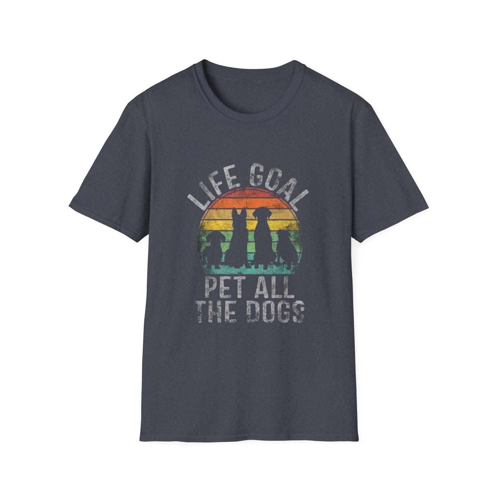 Soft, simple, and playfully earnest — this lightweight tee carries a sunny, vintage-inspired design that says it plainly: Life Goal — Pet All The Dogs. The muted sunset stripes and silhouetted pups give the shirt a worn-in, road-trip feel. Slip it on for weekend walks, shelter volunteering shifts, or quiet mornings with a furry friend. It layers easily under a flannel or stands alone with jeans. The fabric breathes, the neckline holds its shape, and the understated print blends into everyday life without shouting. For people who keep kindness and canine company at the center of their days, this tee feels like the small, wearable promise they make every time they leave the house.