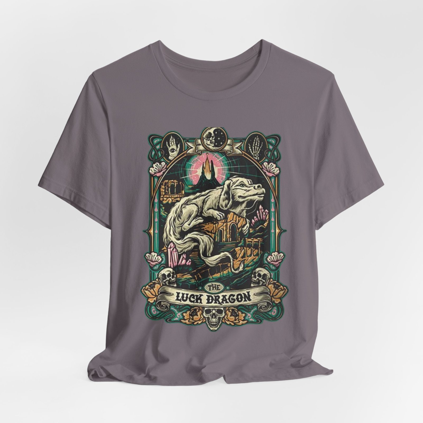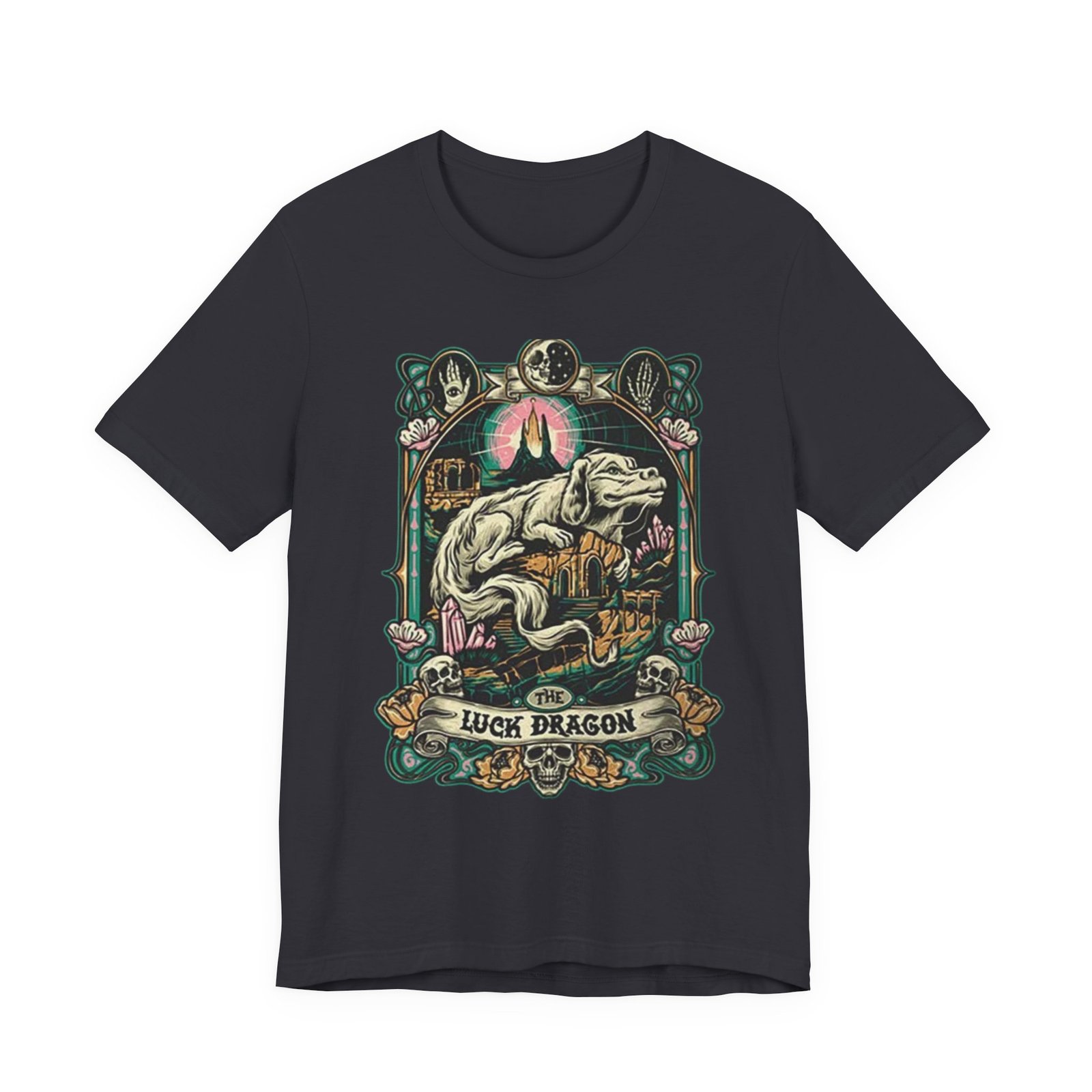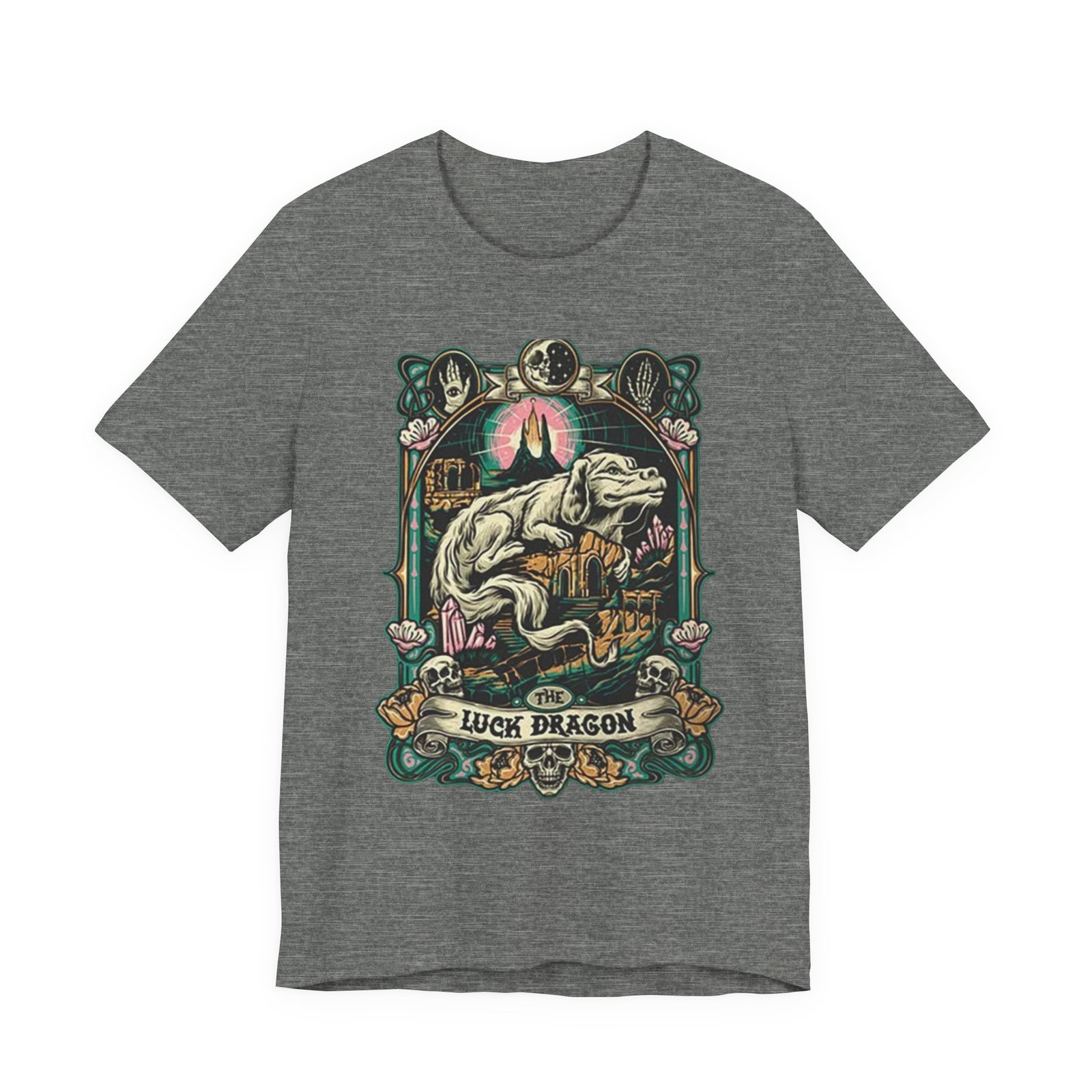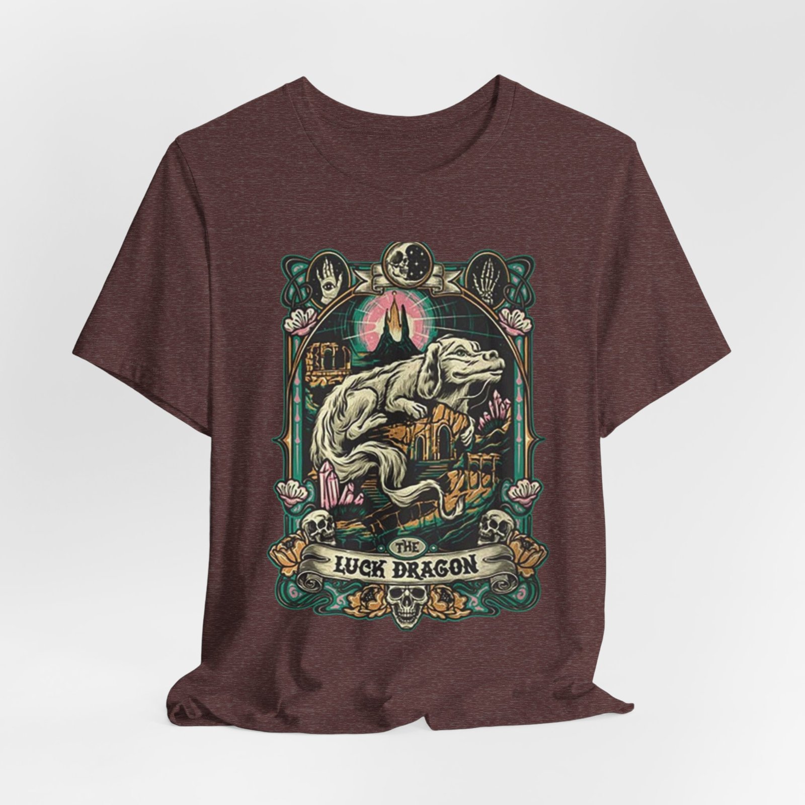 This lightweight jersey tee features a bold, vintage-inspired dragon illustration that feels equal parts myth and streetwear. The artwork centers on a reclining dragon framed by ornamental florals and celestial motifs, rendered in muted, earthy hues that sit beautifully on heathered fabric. Wear it on long walks into town, at weekend craft shows, or layered […]