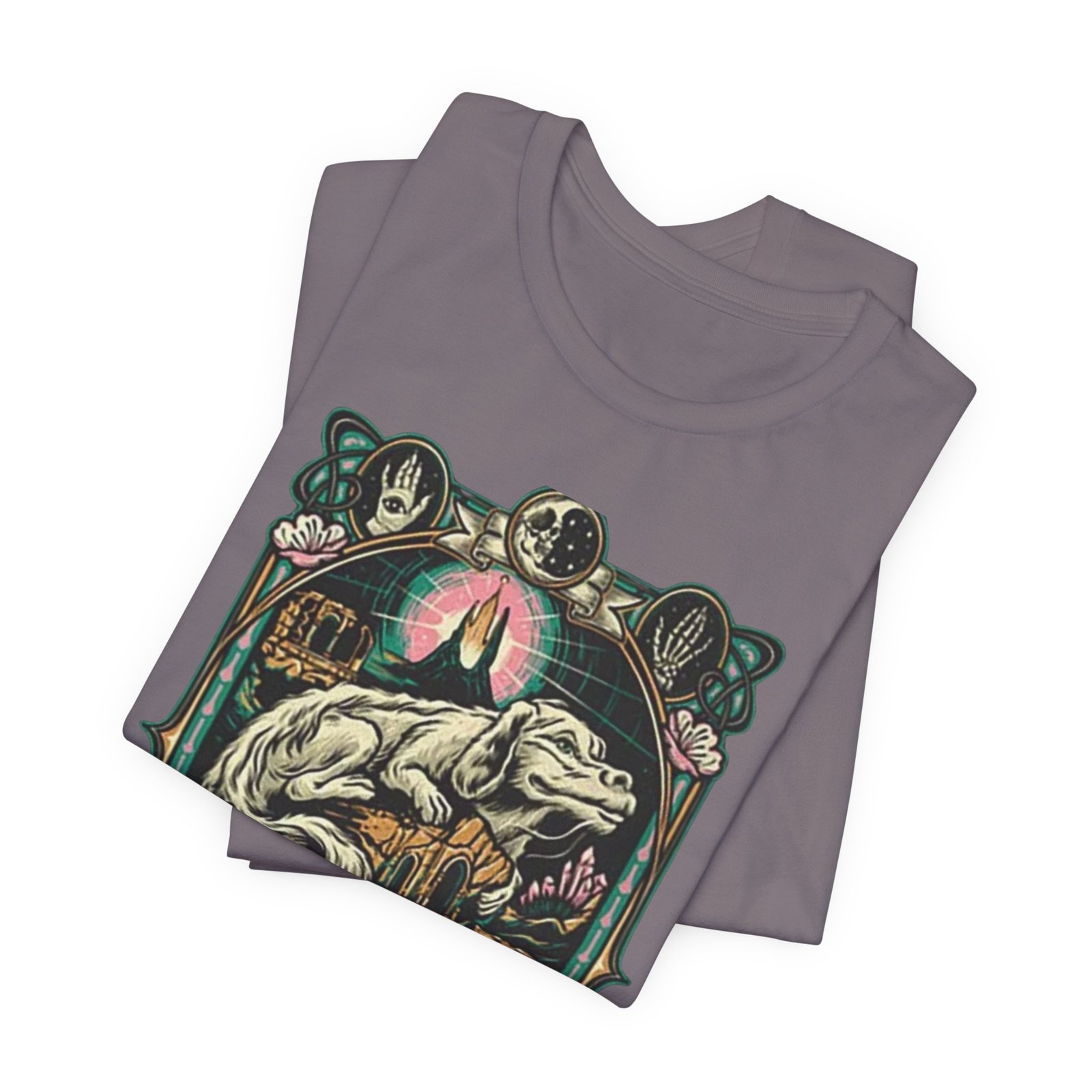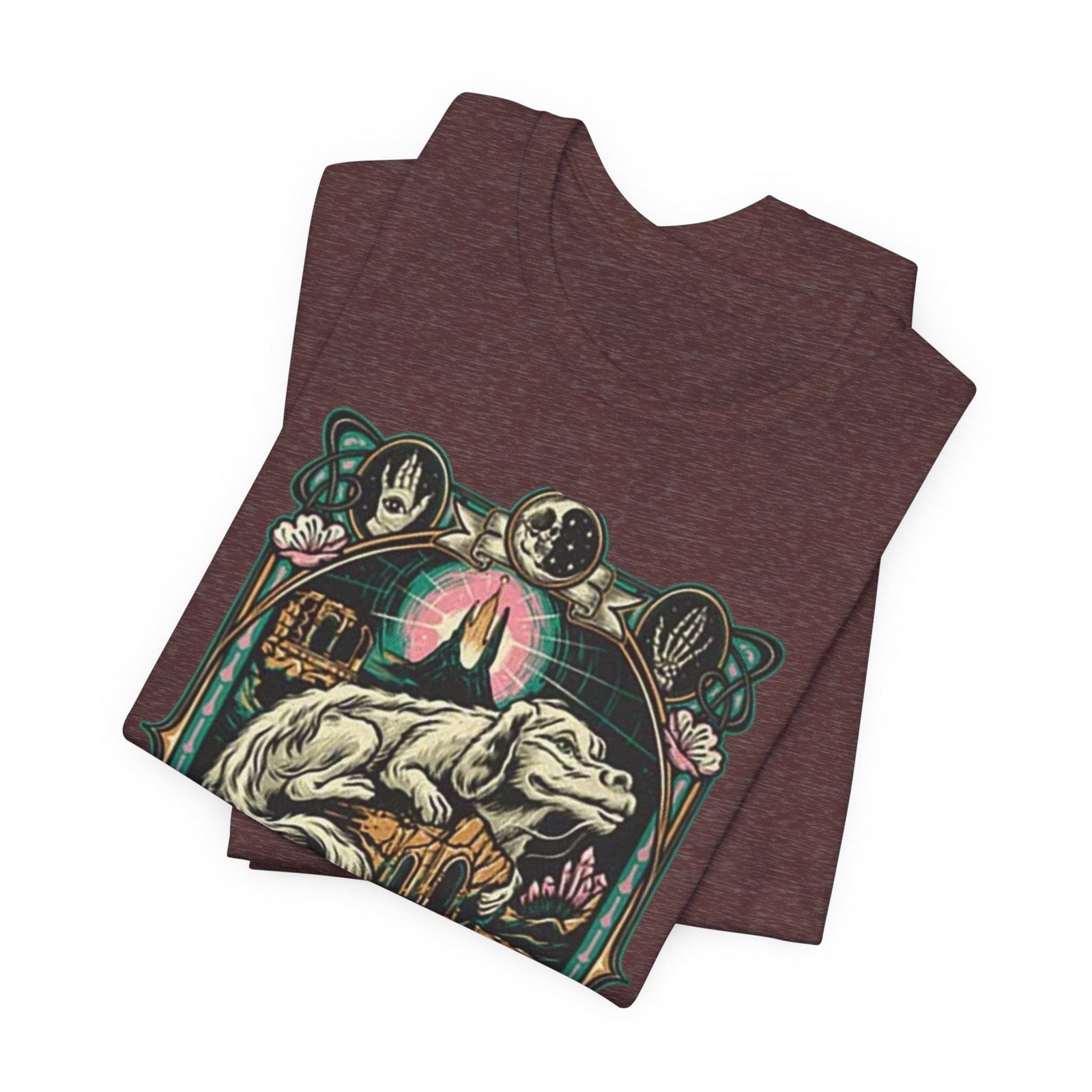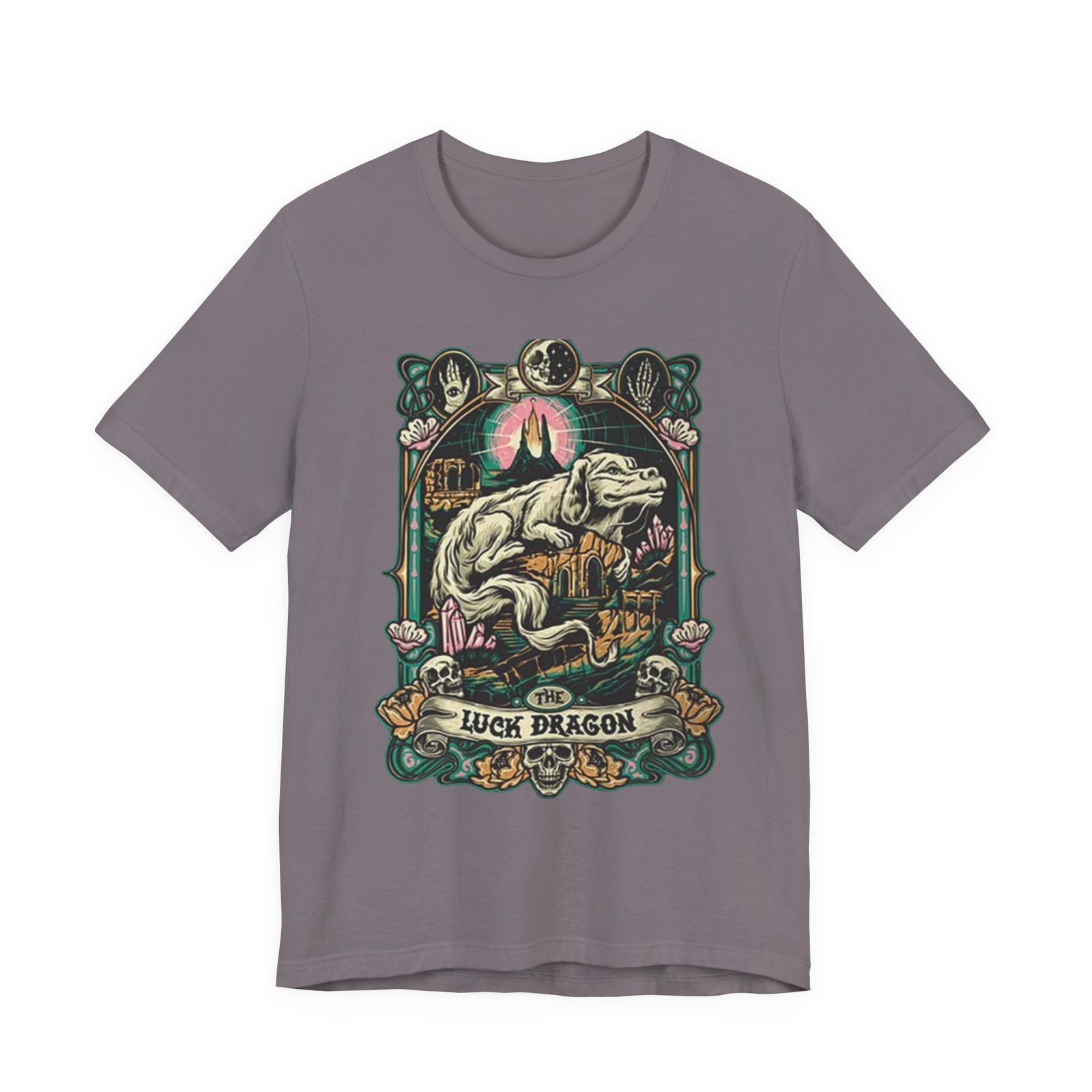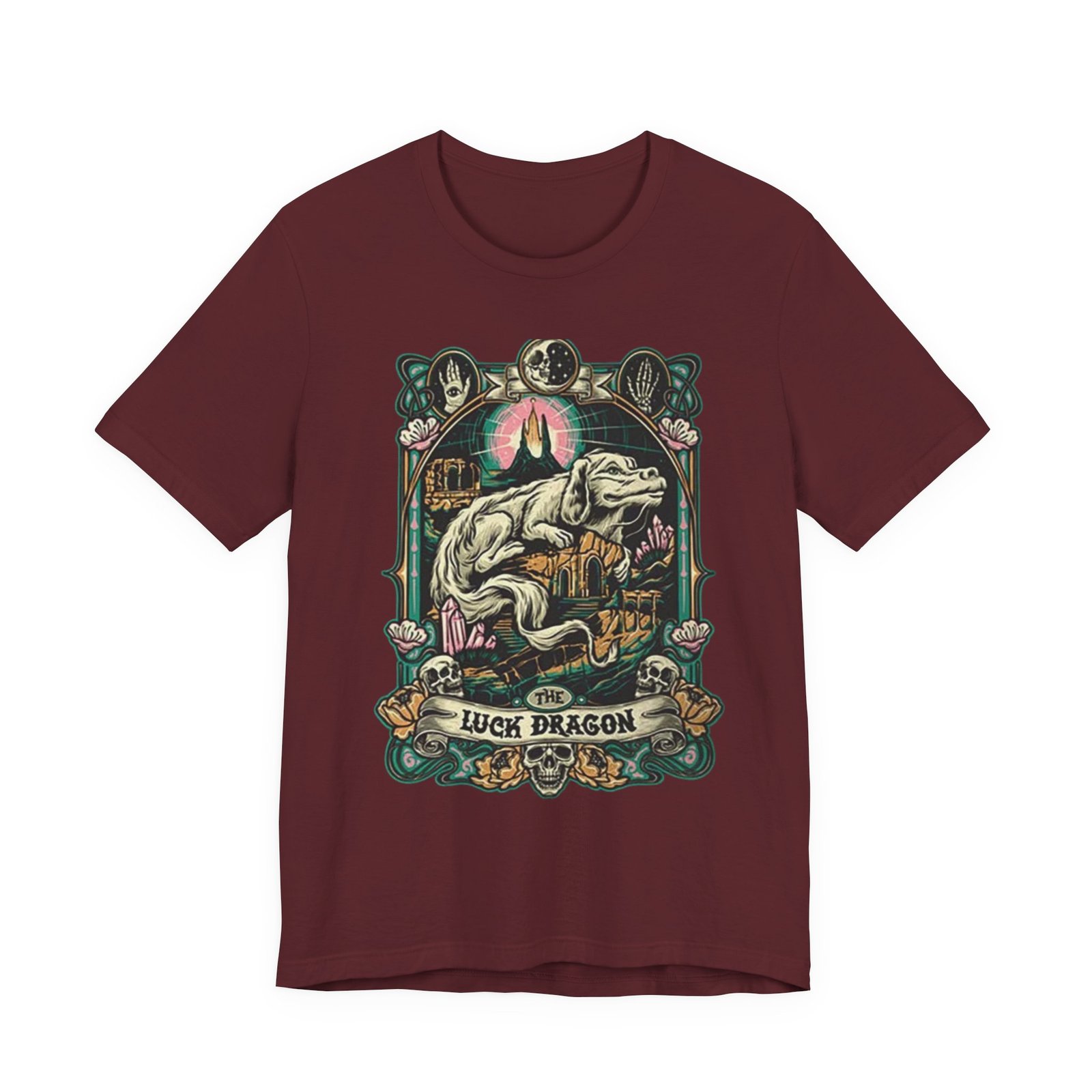 This lightweight jersey tee features a bold, vintage-inspired dragon illustration that feels equal parts myth and streetwear. The artwork centers on a reclining dragon framed by ornamental florals and celestial motifs, rendered in muted, earthy hues that sit beautifully on heathered fabric. Wear it on long walks into town, at weekend craft shows, or layered […]