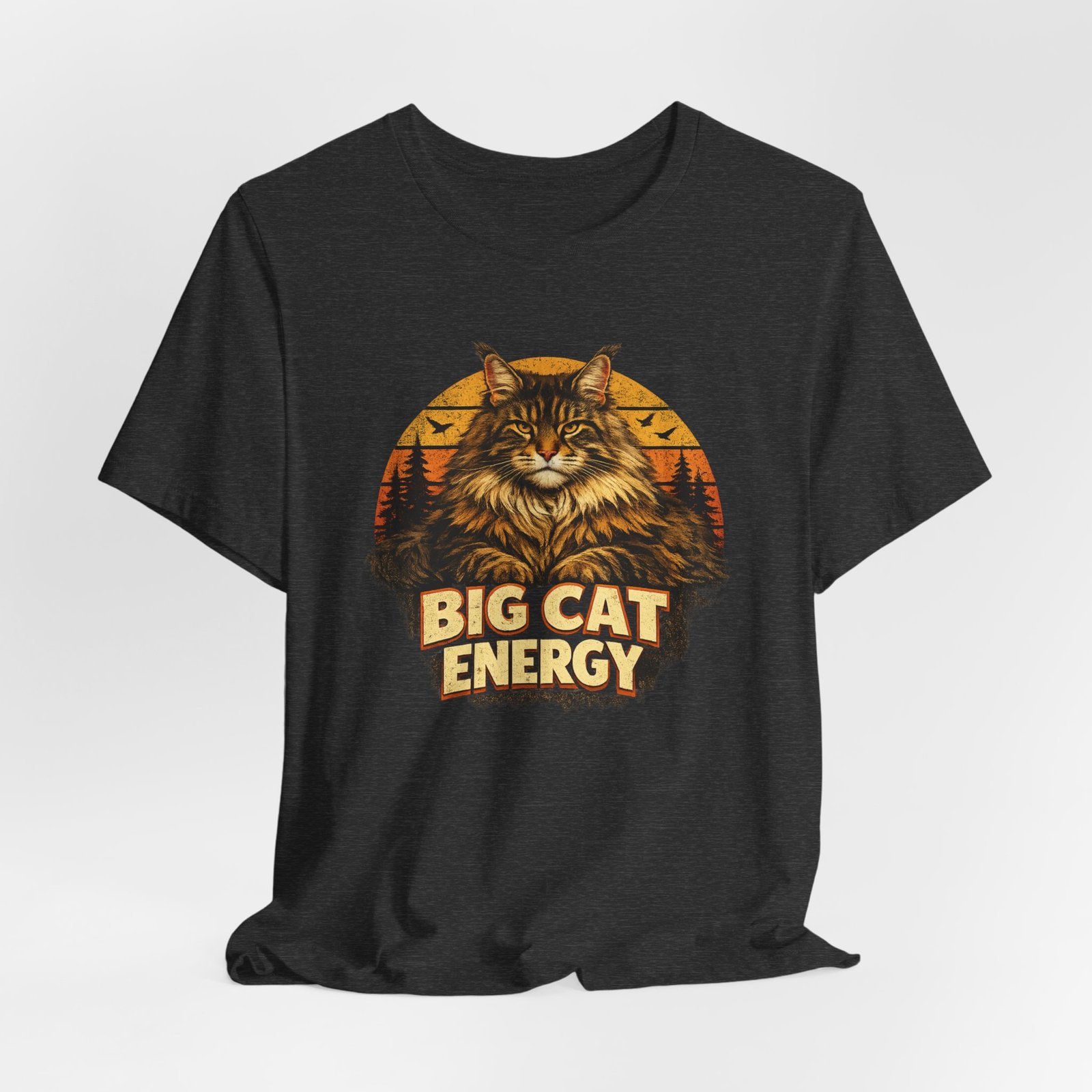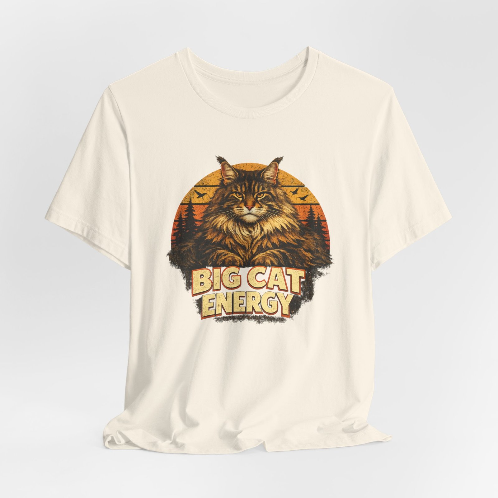 This lightweight crewneck tee carries a playful, confident vibe—great for people who want a touch of humor and bold personality in everyday wear. The front showcases a detailed, retro-style illustration of a big, fluffy cat set against a warm, sunset circle with the cheeky slogan “BIG CAT ENERGY.” The soft Airlume combed and ring-spun cotton fabric feels breathable and smooth on the skin, while side seams and shoulder tape keep the shirt’s shape through repeated wear. A ribbed knit collar with seam and tear-away label add comfort and durability. Ethically made and REACH certified, this shirt pairs easily with jeans, layered looks, or cozy loungewear when you want to wear your mood on your chest.