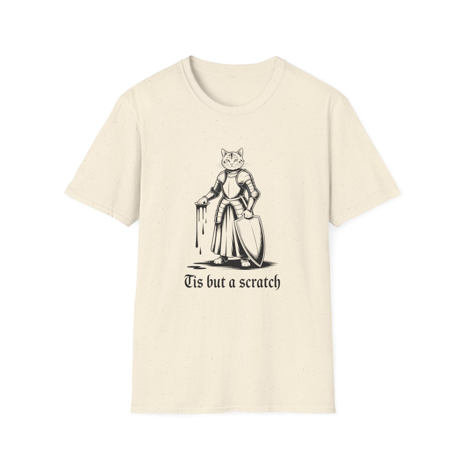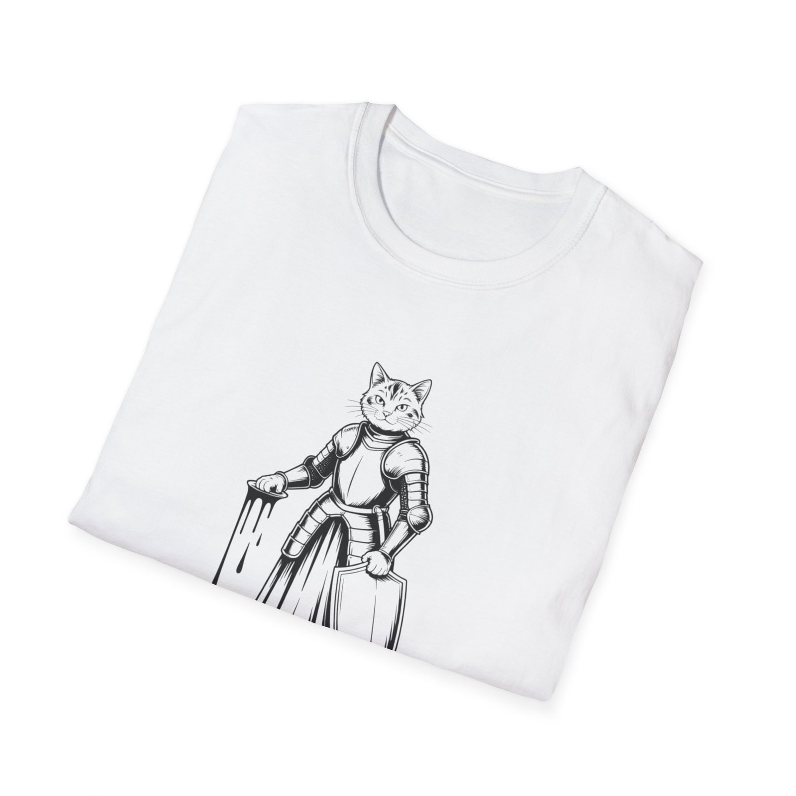 A soft, breathable tee that pairs vintage whimsy with deadpan humor. The lightweight cotton feels gentle against skin while the fine, detailed illustration—a knightly cat with a dripping sword—lands like a private joke on the chest. Subtle distressing in the natural fabric and the classic crew silhouette keep the look low-key and wearable. Wear it to bookish meetups, late-night gaming sessions, or lazy afternoons at a café; it reads like an inside-line for anyone who loves clever illustration, medieval nods, and dry wit.