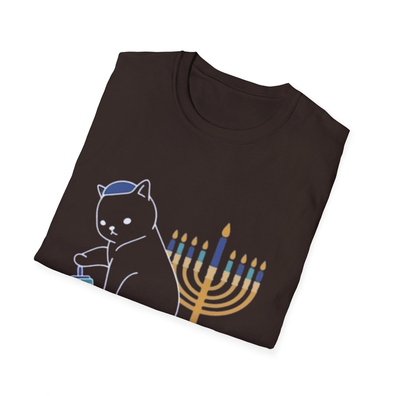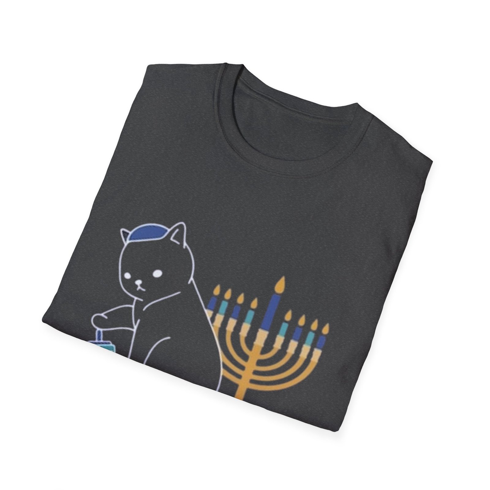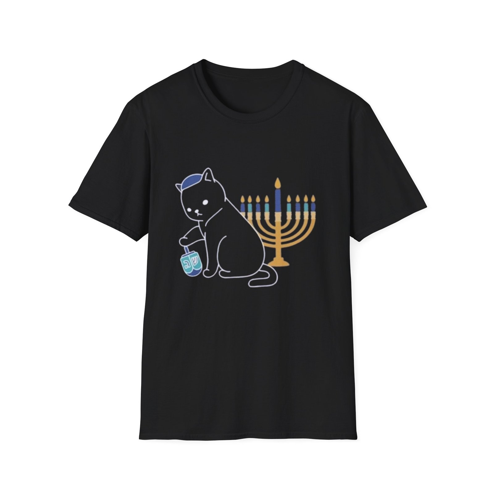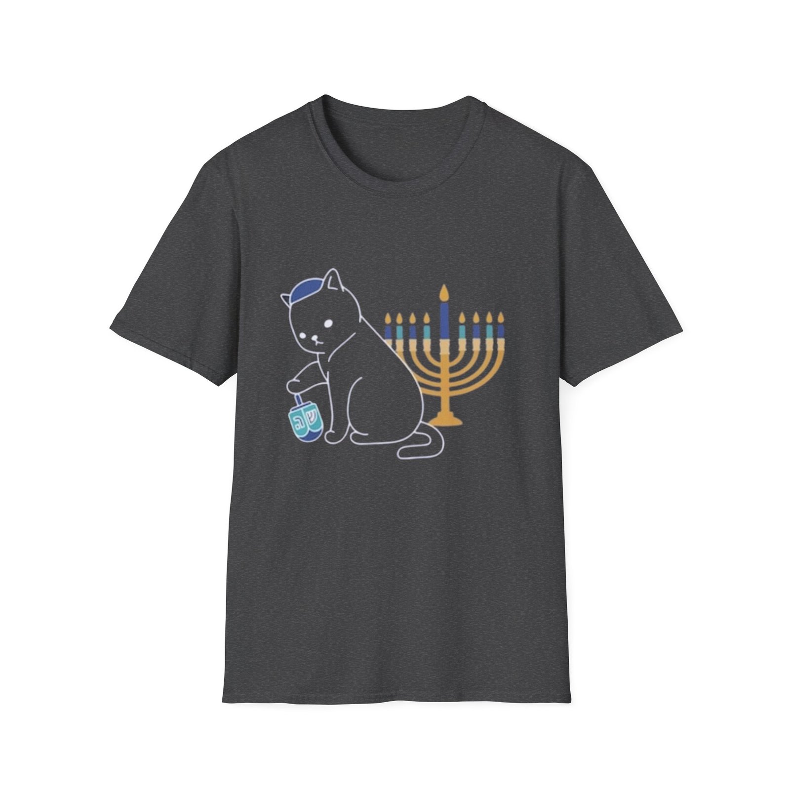 A soft, lightweight cotton tee that carries a quiet celebration. The small, centered design features a golden menorah, a spinning dreidel, and a small gelt coin—subtle symbols arranged with gentle color and clean lines. Wear it during chilly evenings of candle-lighting or casual family gatherings; it reads as thoughtful and low-key rather than loud. The crew neck and classic fit sit easily under a cardigan or jacket, while the smooth ring-spun cotton keeps the print crisp and the fabric comfortable for long nights of stories, music, and laughter.
