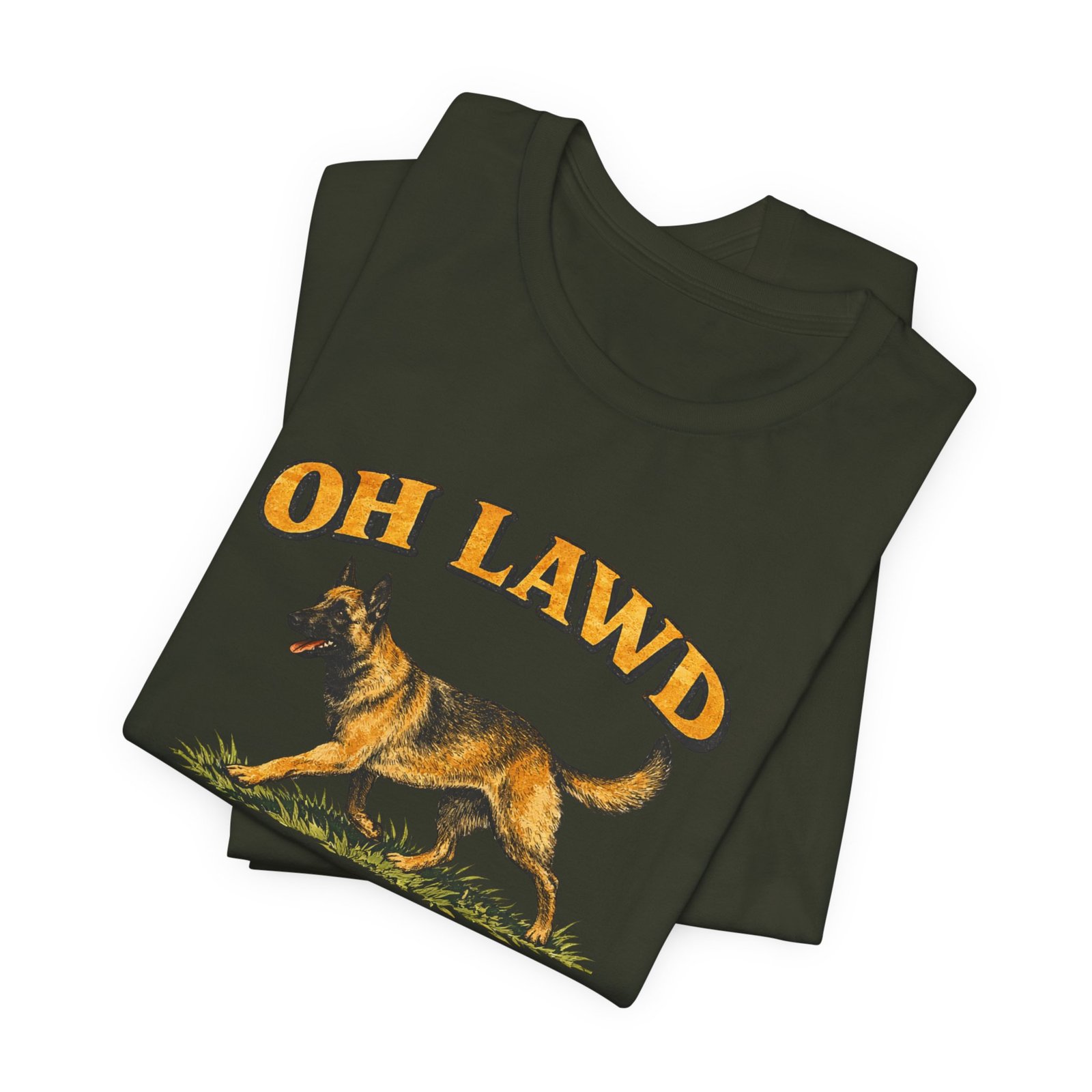 This lightweight jersey tee carries a wink-and-nod attitude for dog lovers who appreciate a little humor with their everyday wear. A detailed German Shepherd illustration strides across the chest beneath the playful line “OH LAWD” and the smaller caption “He be treading,” giving the shirt a vintage-inspired, slightly irreverent vibe. The soft, breathable Airlume combed ring-spun cotton feels gentle against skin and layers easily under jackets or over hoodies. Thoughtfully constructed with side seams, a ribbed knit collar, shoulder tape, and a tear-away label, it stays comfortable and keeps its shape through repeated wear. The heathered gray fabric tones let the warm golds and browns of the print pop without shouting, so the design reads like an inside joke shared between friends on walks, at training sessions, or lounging at home.