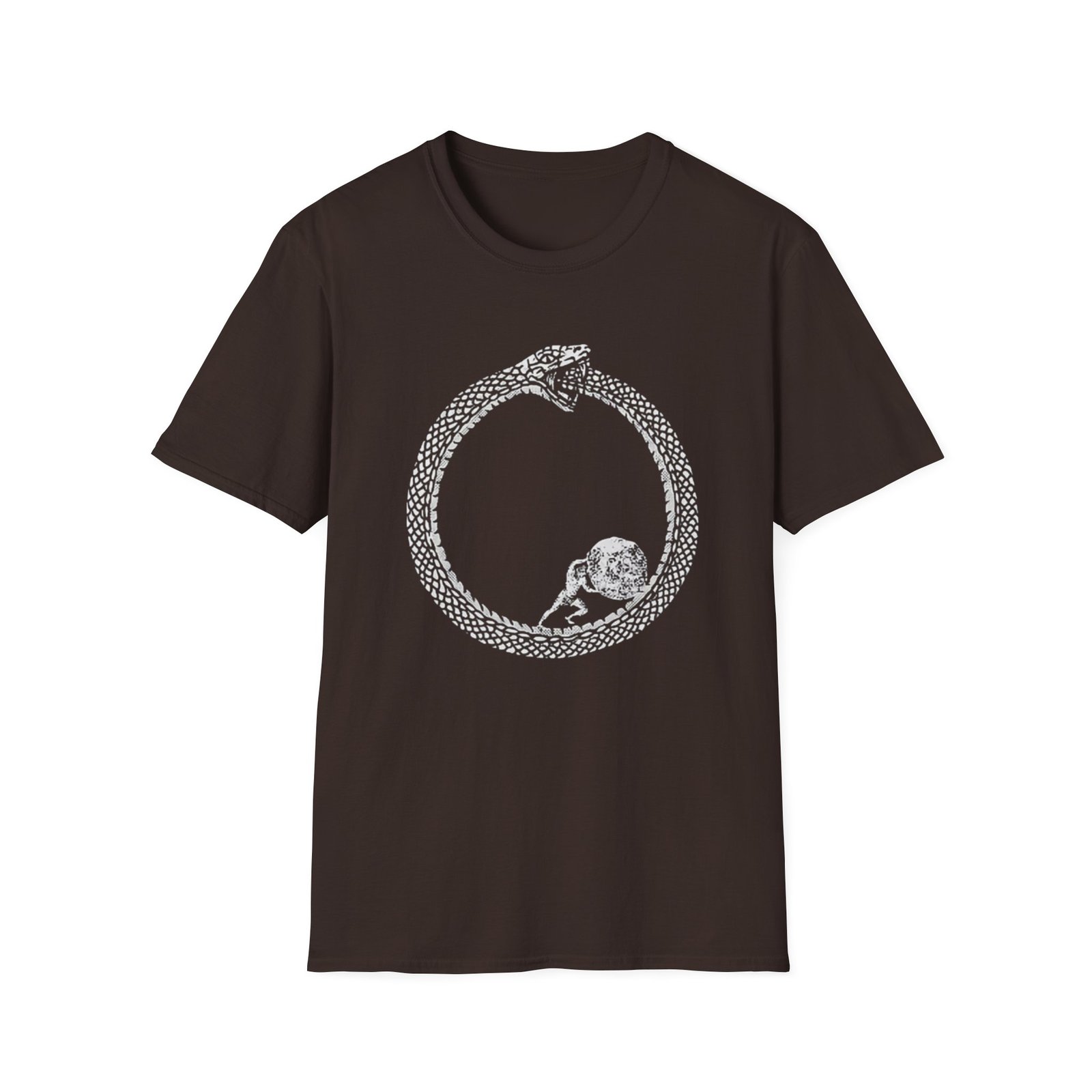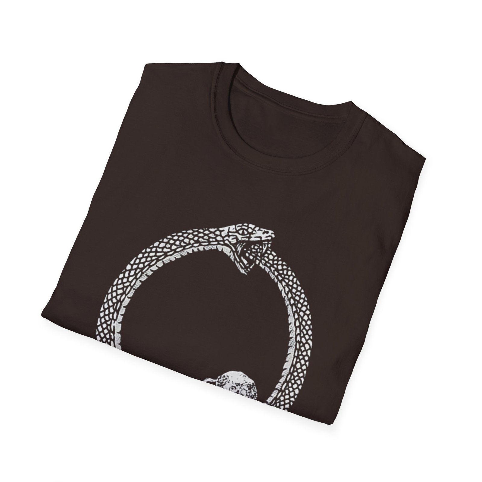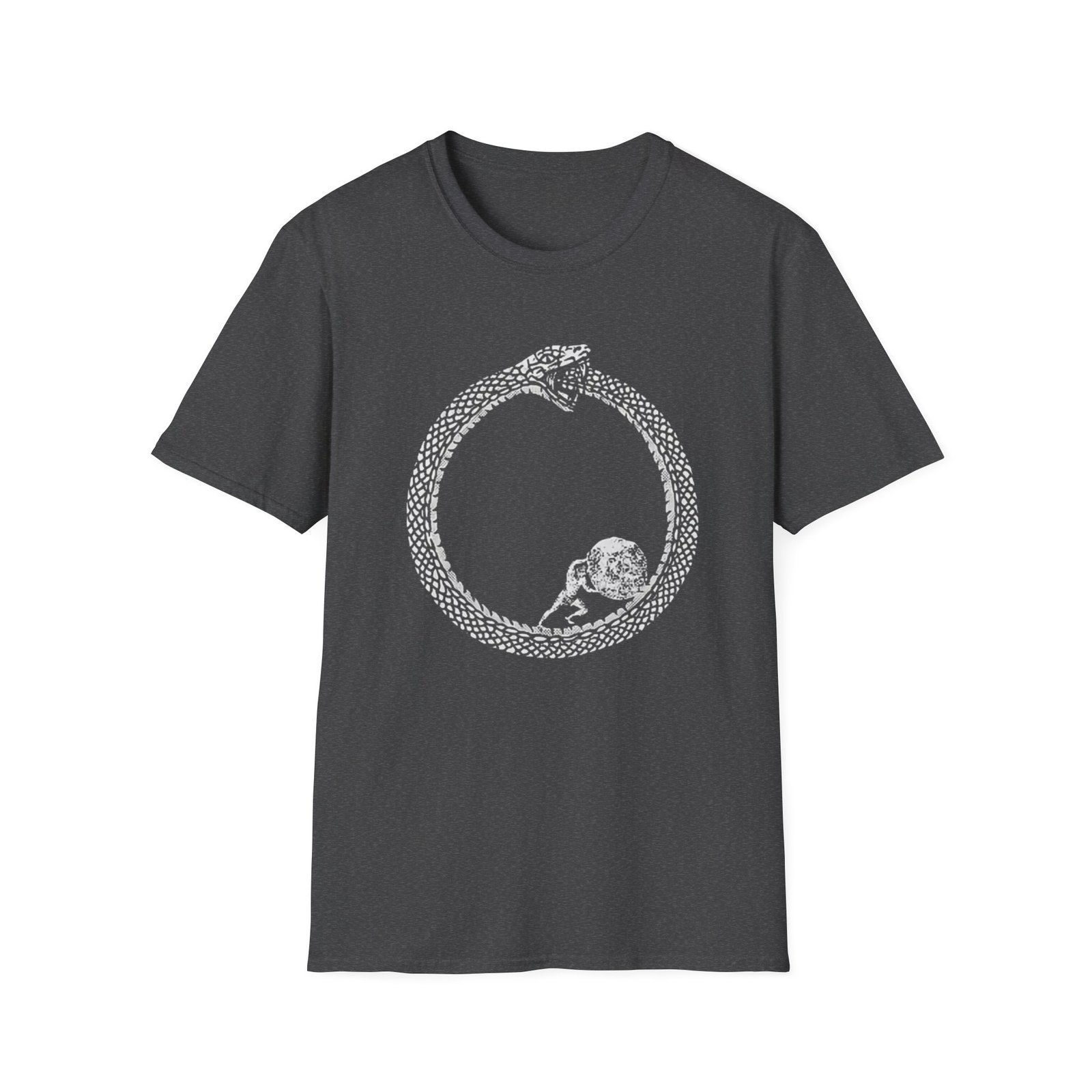 A soft, everyday tee with a quiet, symbolic edge. This lightweight cotton shirt carries a detailed ouroboros illustration—an ancient circle of renewal—rendered in crisp white against a deep black field. Wear it when you want your outfit to feel thoughtful, not loud. The crew neck and classic fit keep the silhouette clean so the artwork becomes the focus. It layers easily under a jacket for evening walks, pairs with worn denim at a show, or sits comfortable at a coffee shop table while you read. For those who appreciate subtle mythology, dark aesthetics, and durable, wearable art, this shirt becomes part of a regular rotation rather than a one-off statement.