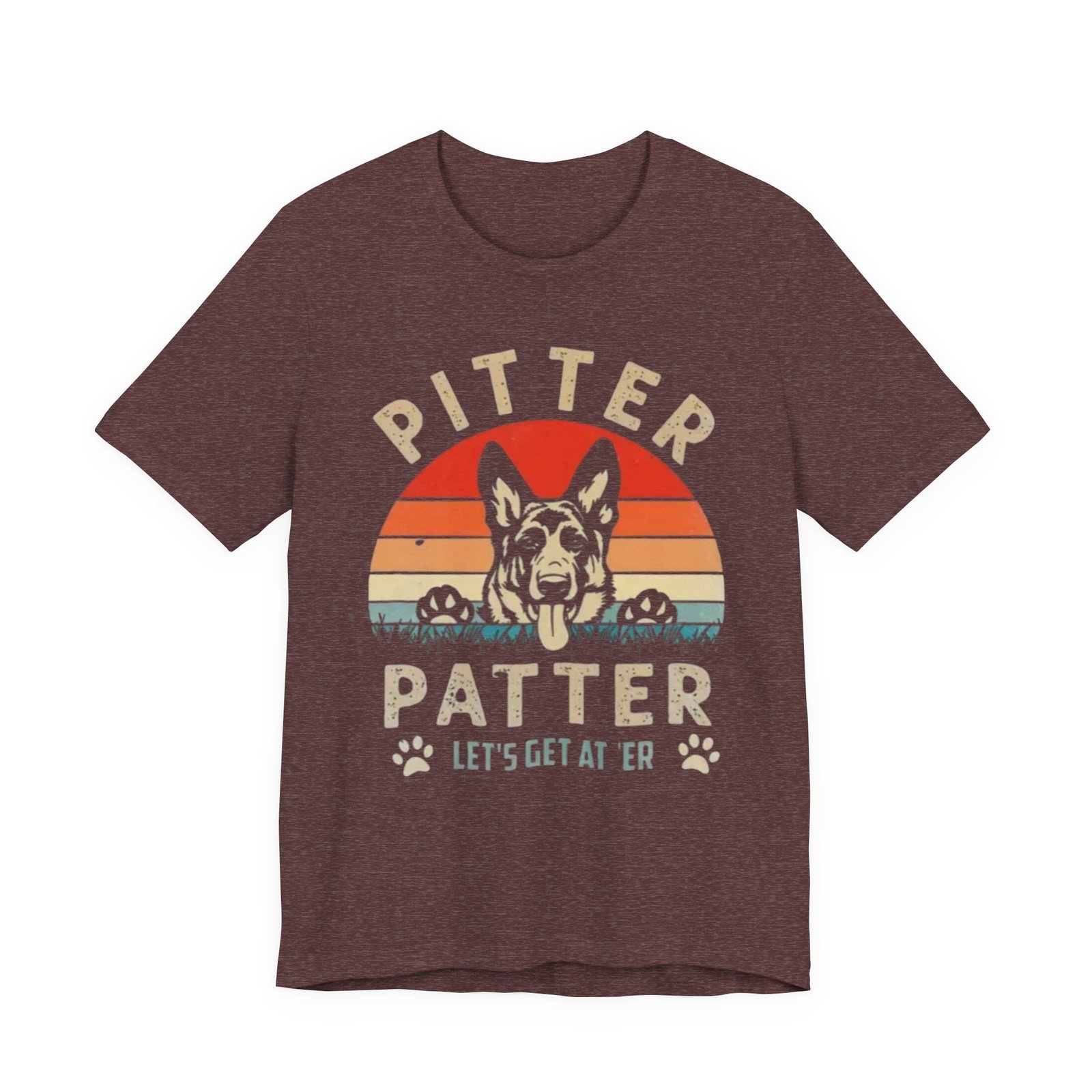 A soft, breathable tee that carries a warm, playful vibe for dog lovers who live for porch hangs, sunset walks, and goofy pup energy. The vintage sunset graphic frames a grinning German Shepherd with paws over a ledge and the cheeky lines “Pitter Patter / Let’s Get At ’Er,” giving this shirt a worn-in, lived-with look that feels instantly familiar. Lightweight Airlume combed cotton keeps it cool and comfortable all day. The retail crew neckline and side-seamed construction hold their shape while the ribbed collar and shoulder tape add subtle durability. Wear it to dog park meetups, casual outings, or lazy weekend mornings with coffee and muddy paws — it settles into everyday life like an old friend.