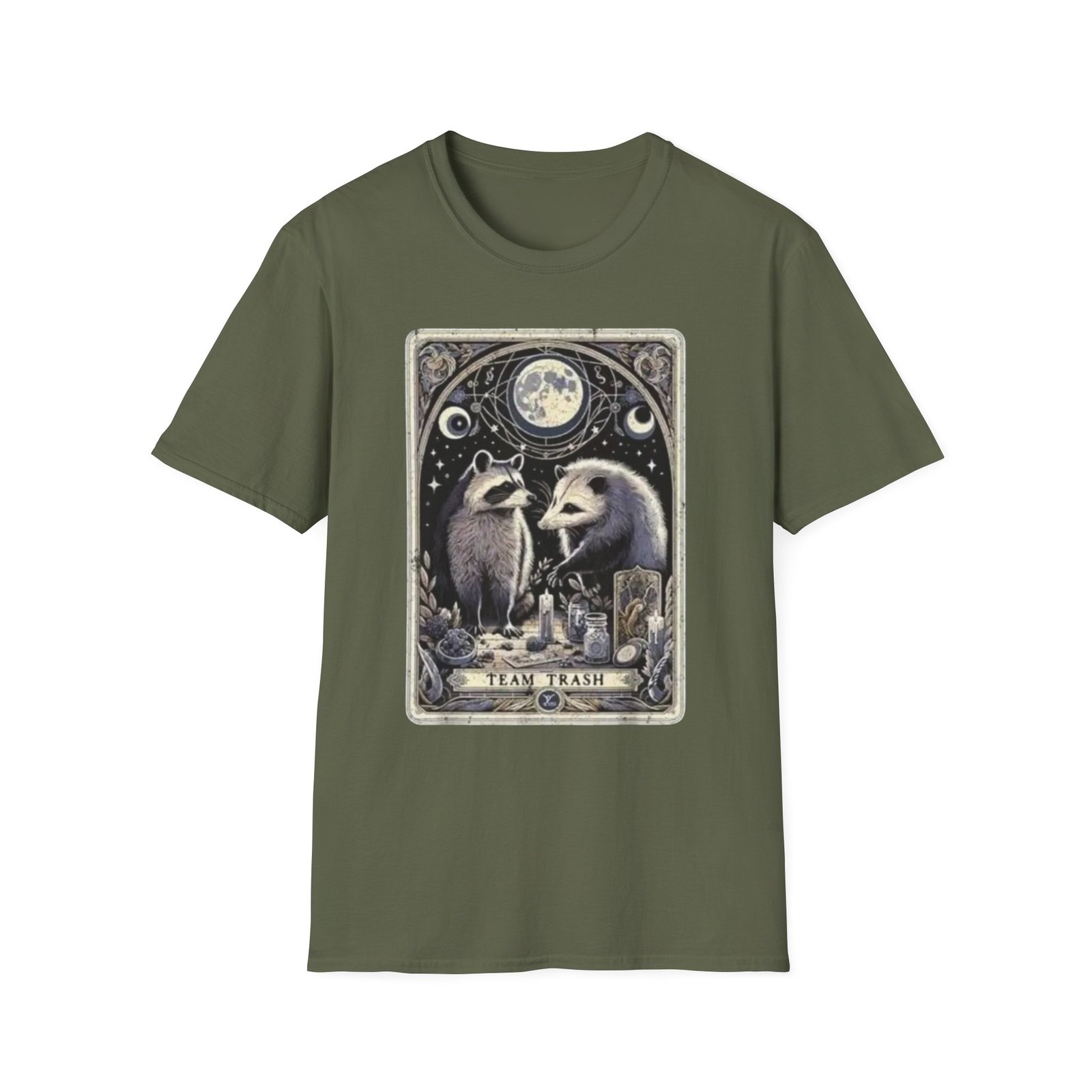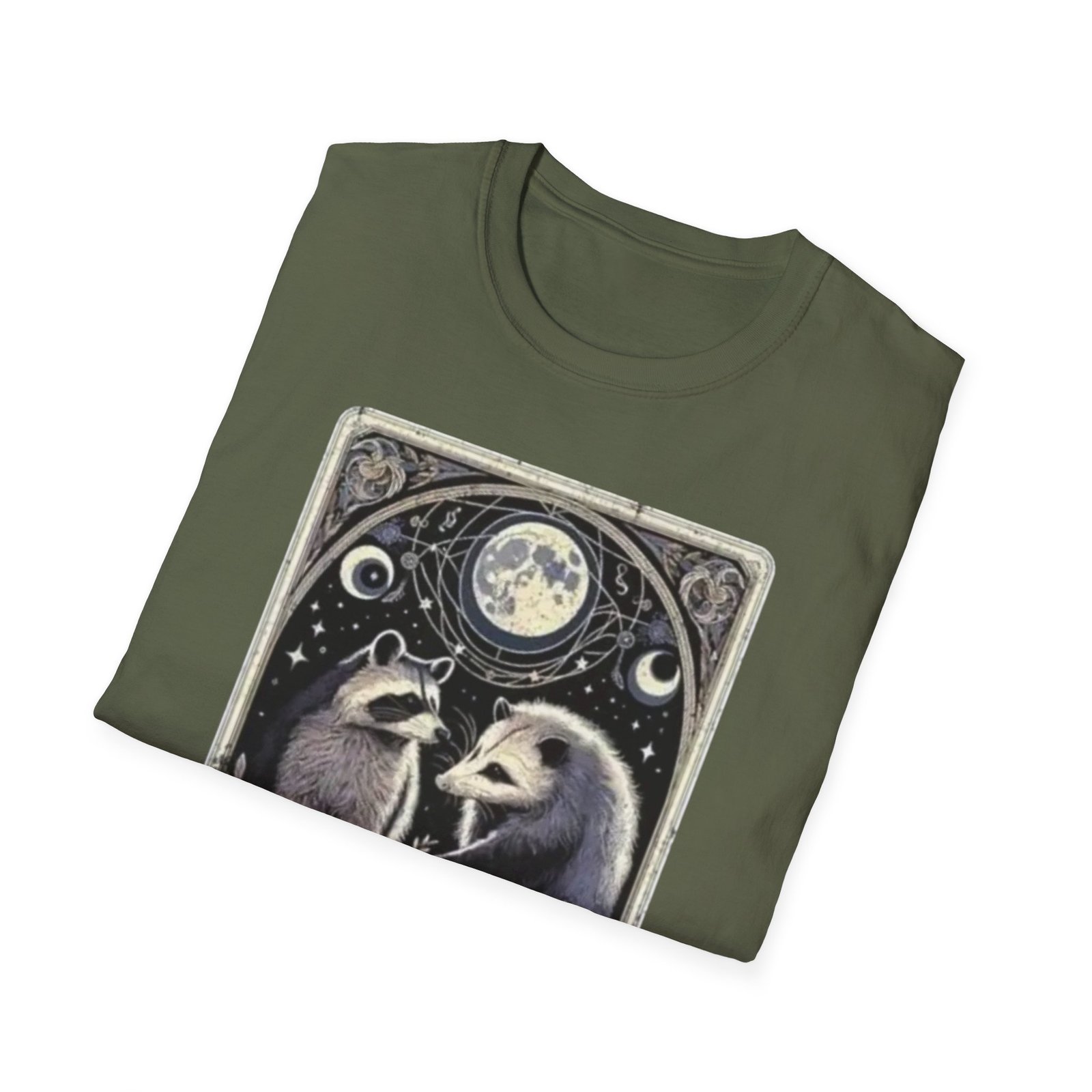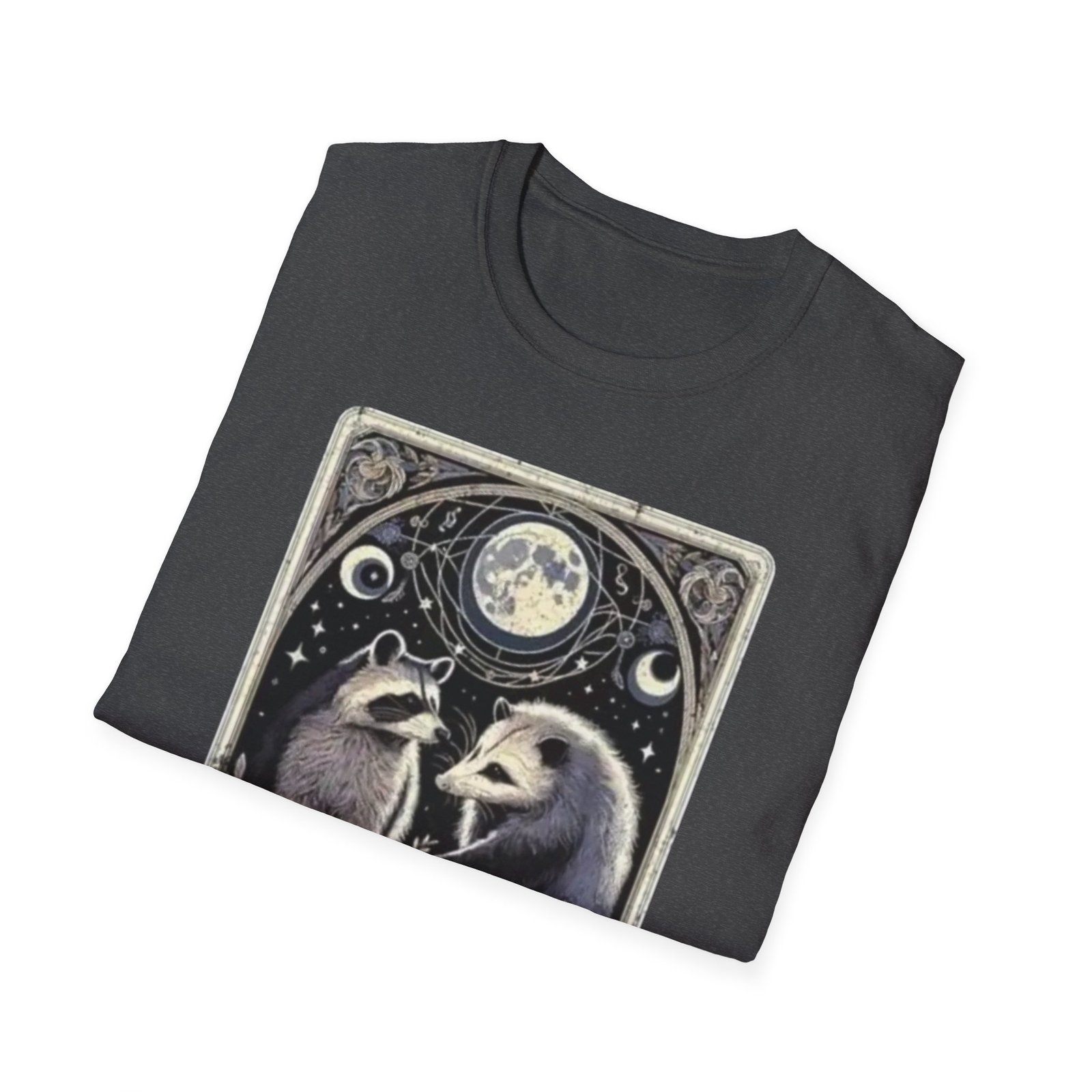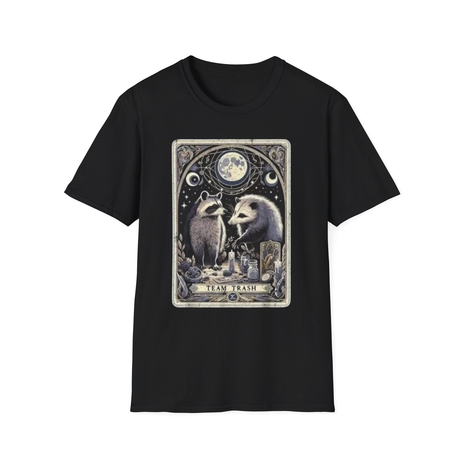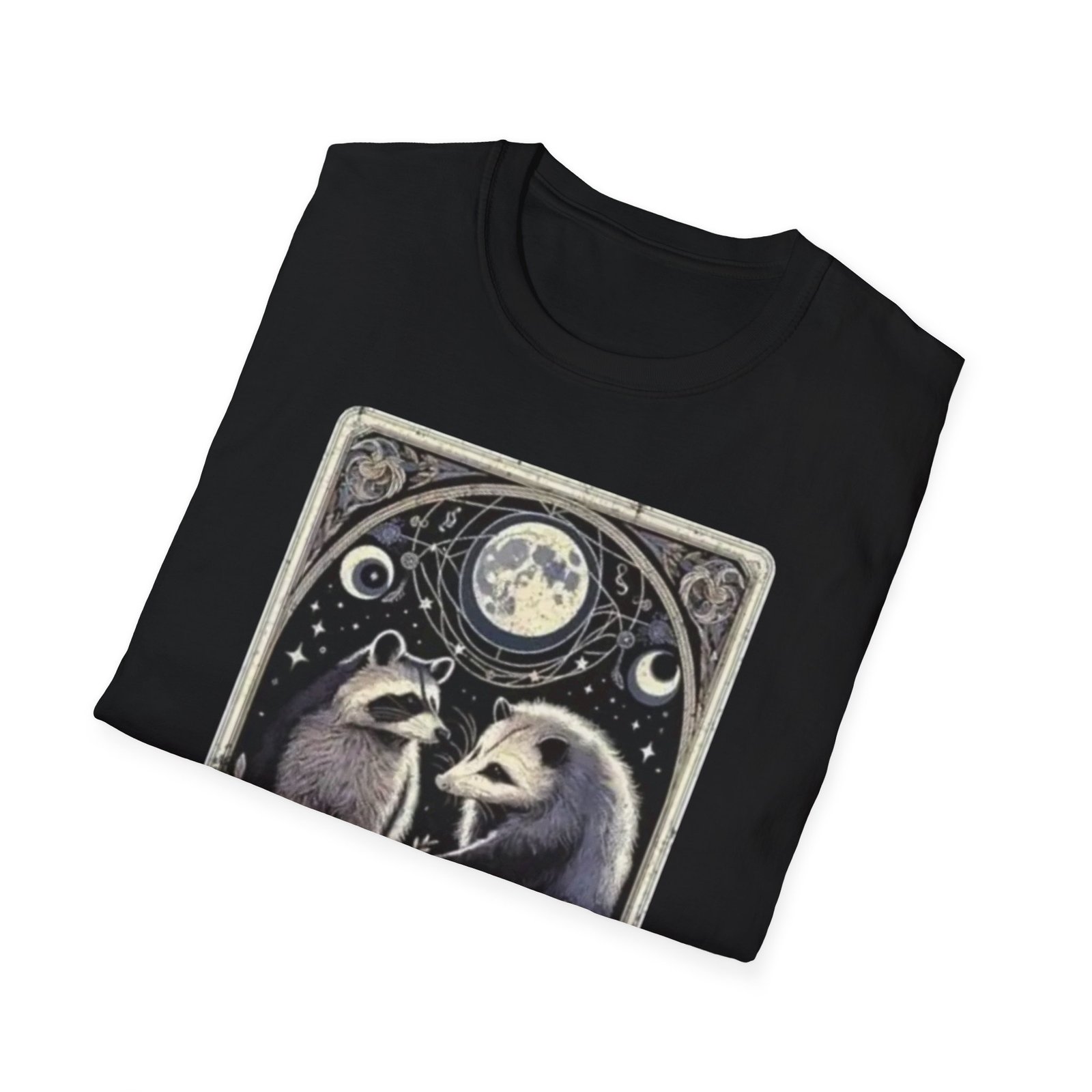 Be the first to review “Possum and Raccoon Tarot Illustration T-Shirt | Moon, Stars, Occult Vibes”