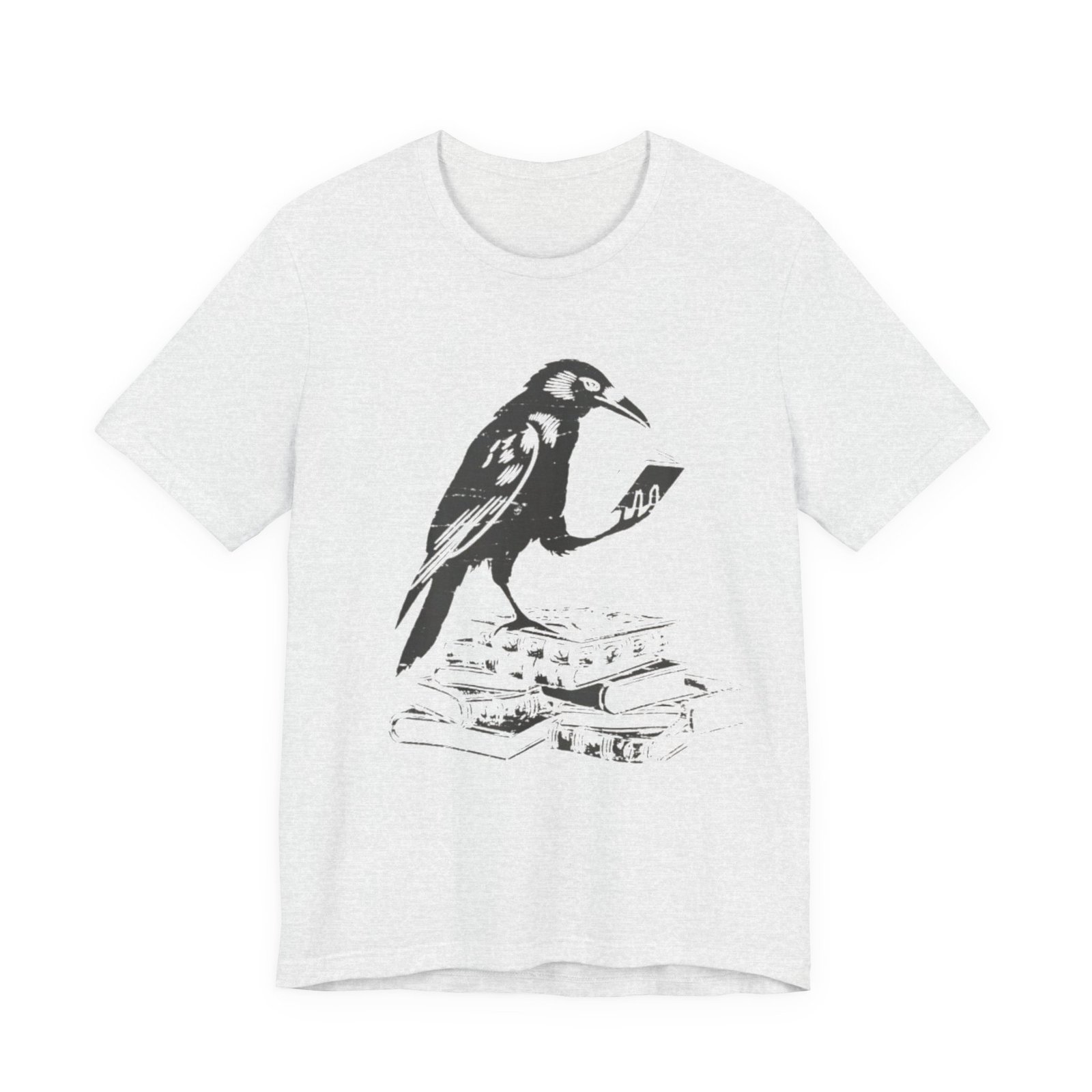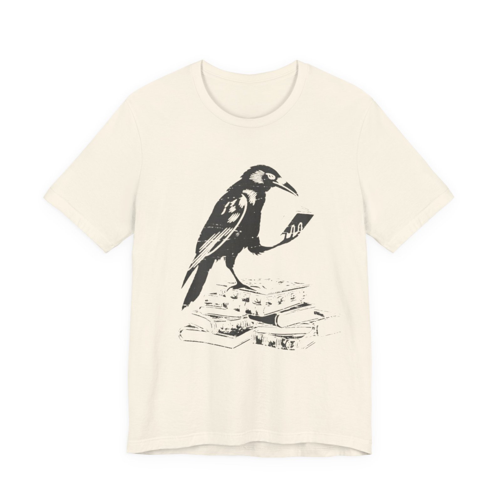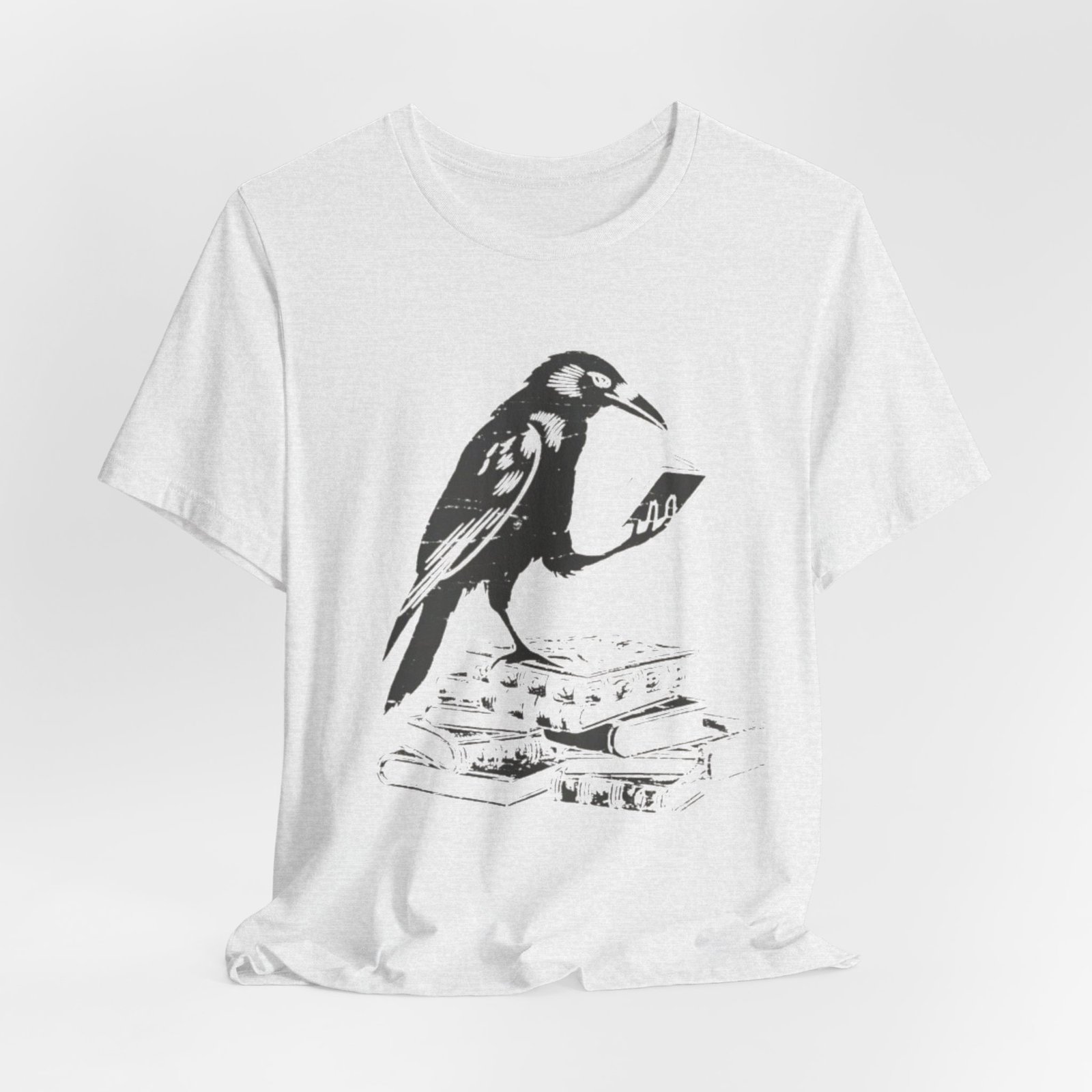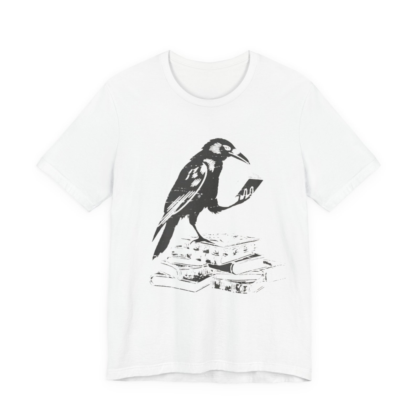 A lightweight, breathable tee with a quiet, curious spirit — a monochrome illustration of a crow perched on stacked books, mid-inspection of a borrowed page. Soft Airlume cotton sits close to the skin while the retail fit keeps the silhouette tidy under a jacket or worn loose on its own. This shirt slips into the life of someone who collects stories, late-night reads, and oddities from flea markets; it reads like a small, wearable vignette that invites conversation without shouting. The tear-away label and stable shoulder tape keep it comfortable for long days of digging through stacks or writing by lamplight. Washed-in black ink and clean lines give it a slightly vintage, literary feel that pairs naturally with denim, worn cardigans, and a slow cup of coffee.