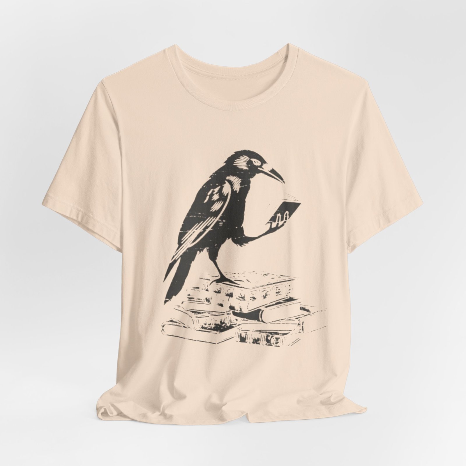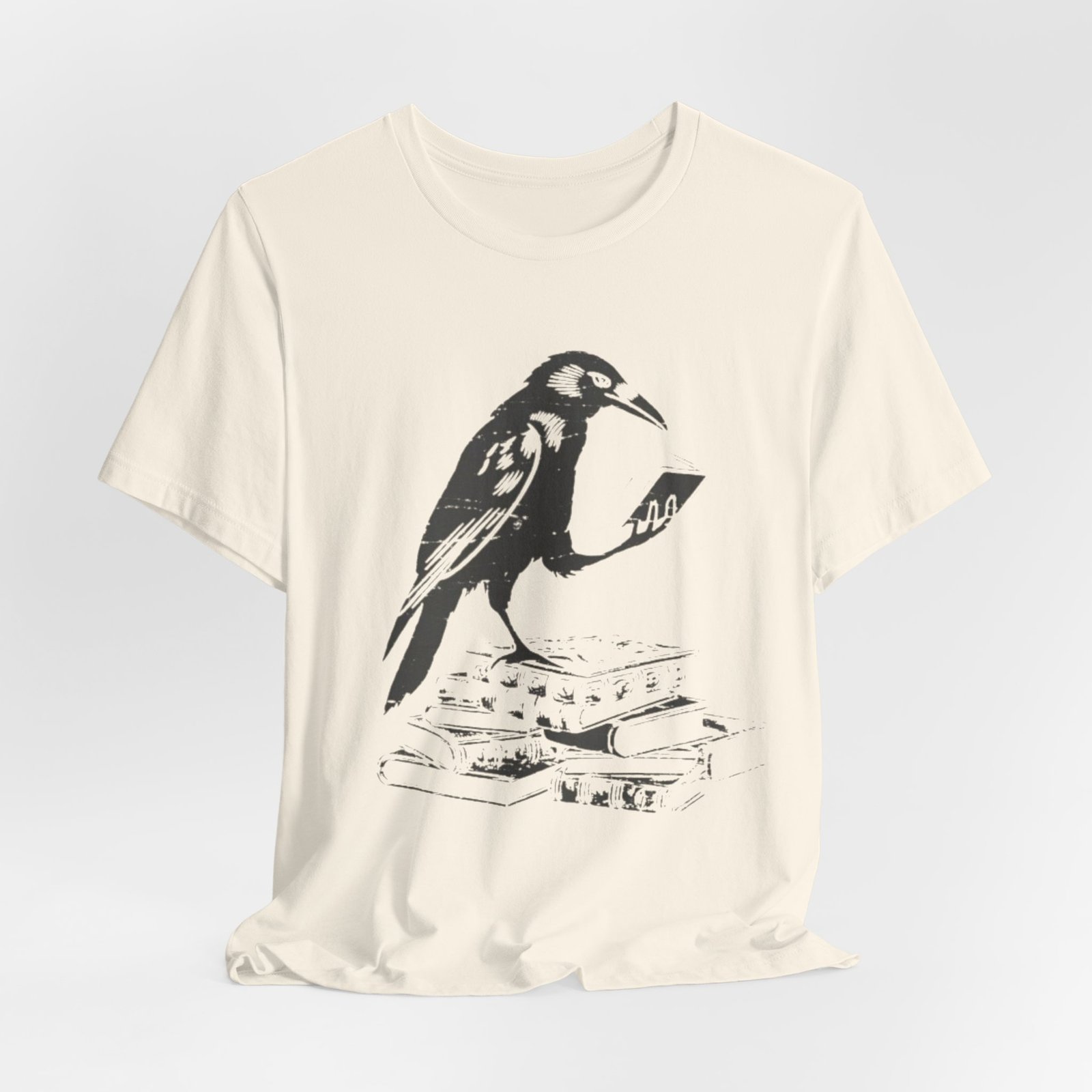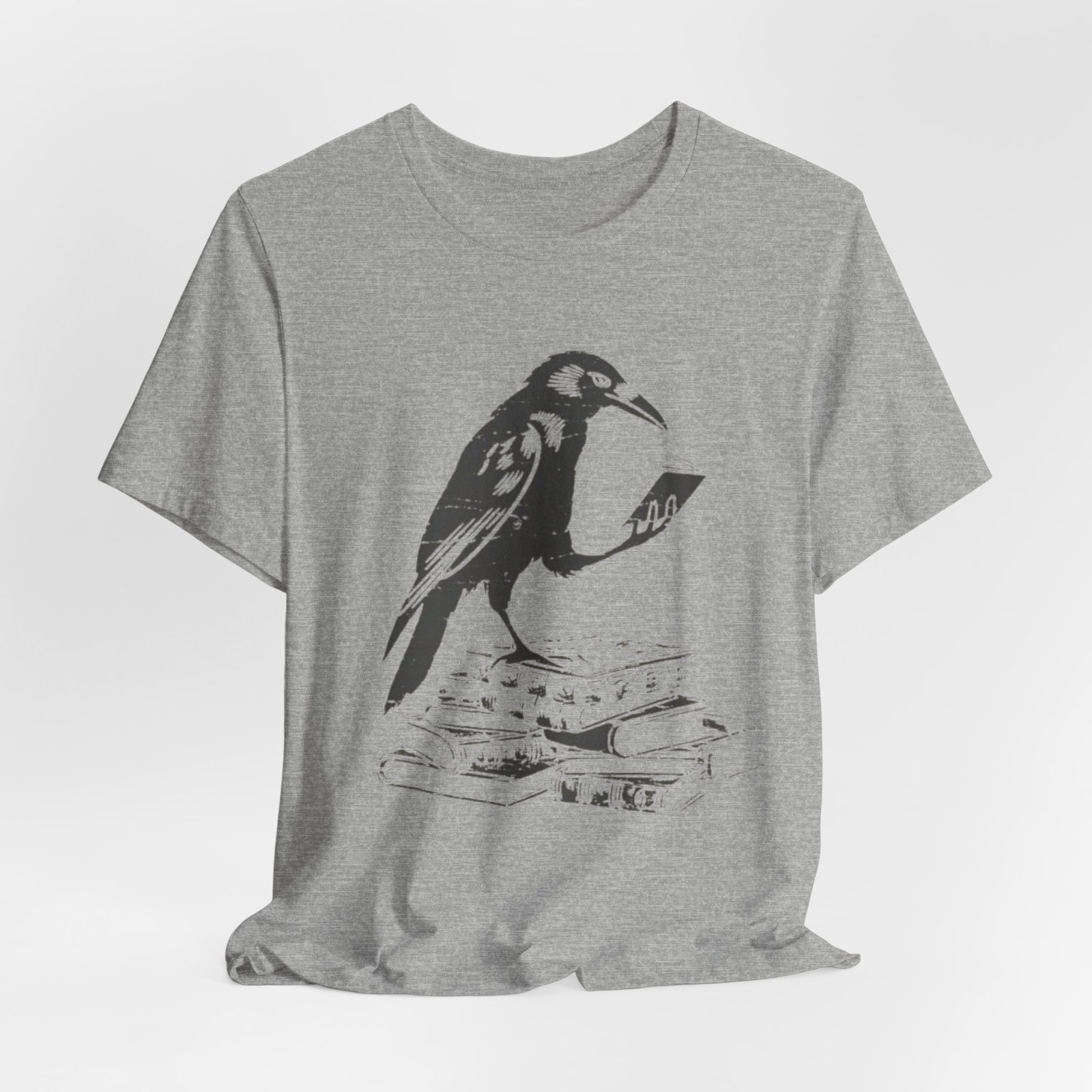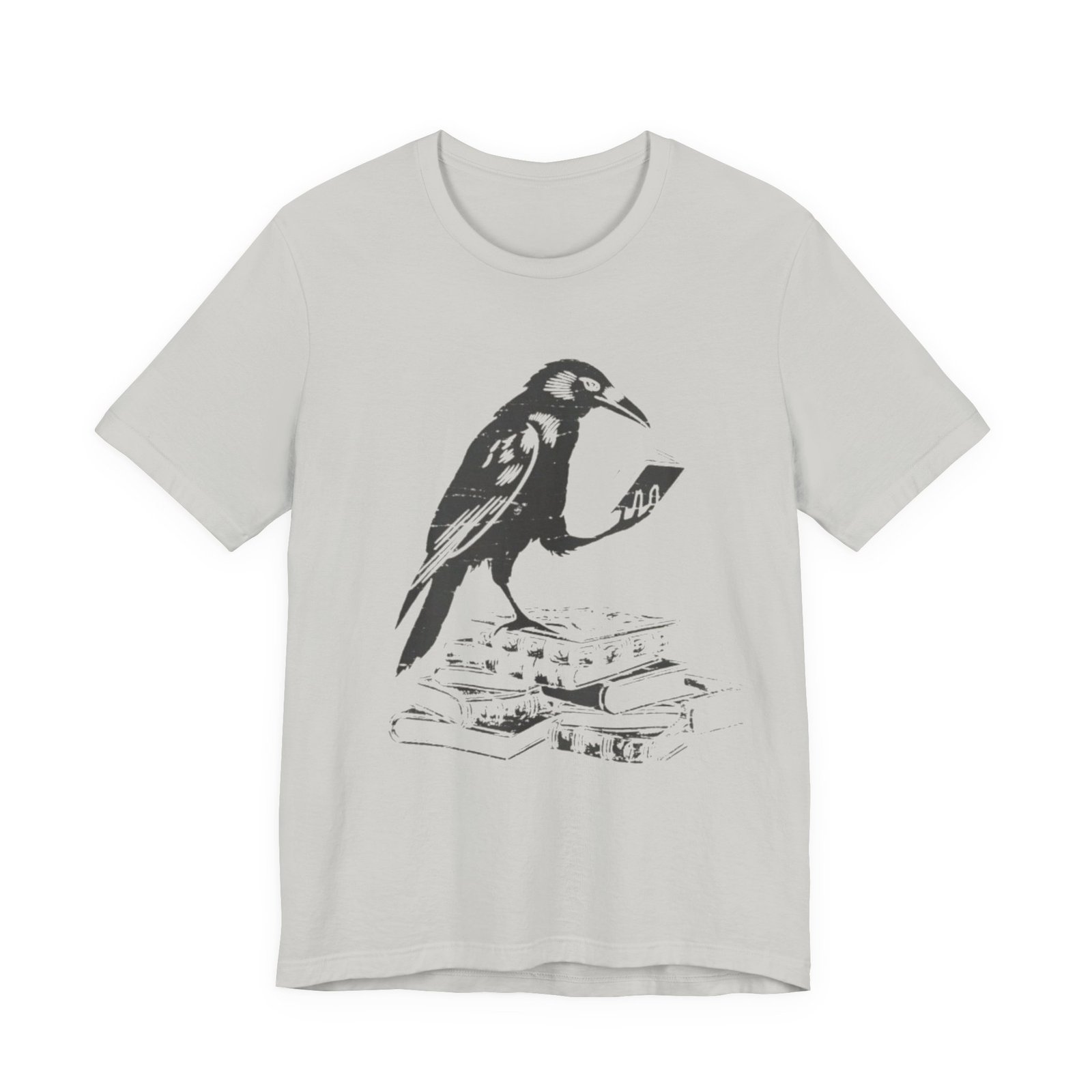A lightweight, breathable tee with a quiet, curious spirit — a monochrome illustration of a crow perched on stacked books, mid-inspection of a borrowed page. Soft Airlume cotton sits close to the skin while the retail fit keeps the silhouette tidy under a jacket or worn loose on its own. This shirt slips into the life of someone who collects stories, late-night reads, and oddities from flea markets; it reads like a small, wearable vignette that invites conversation without shouting. The tear-away label and stable shoulder tape keep it comfortable for long days of digging through stacks or writing by lamplight. Washed-in black ink and clean lines give it a slightly vintage, literary feel that pairs naturally with denim, worn cardigans, and a slow cup of coffee.