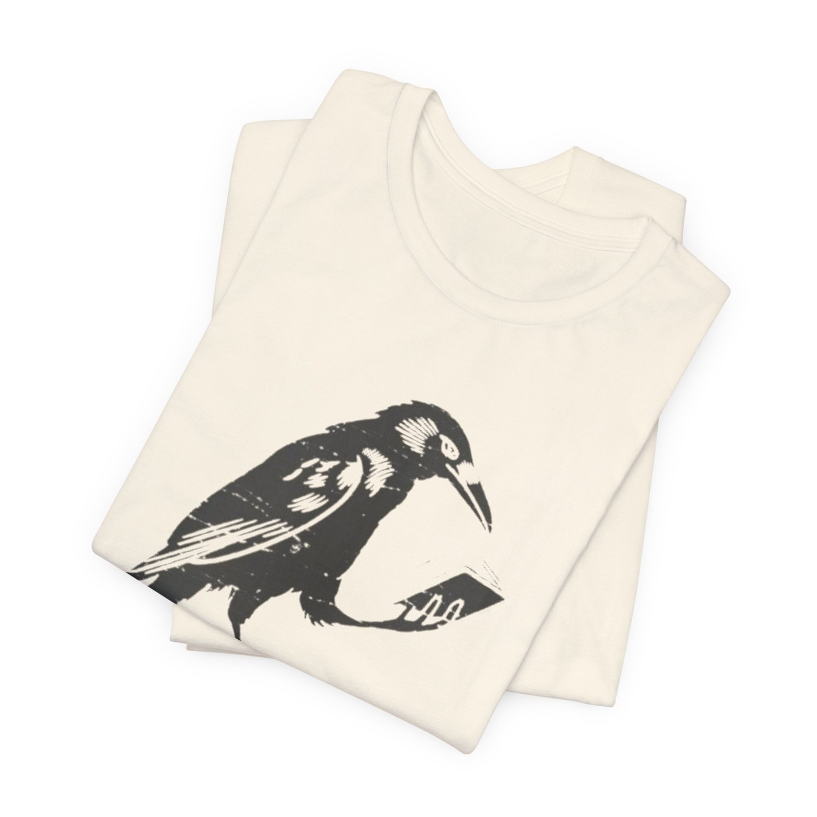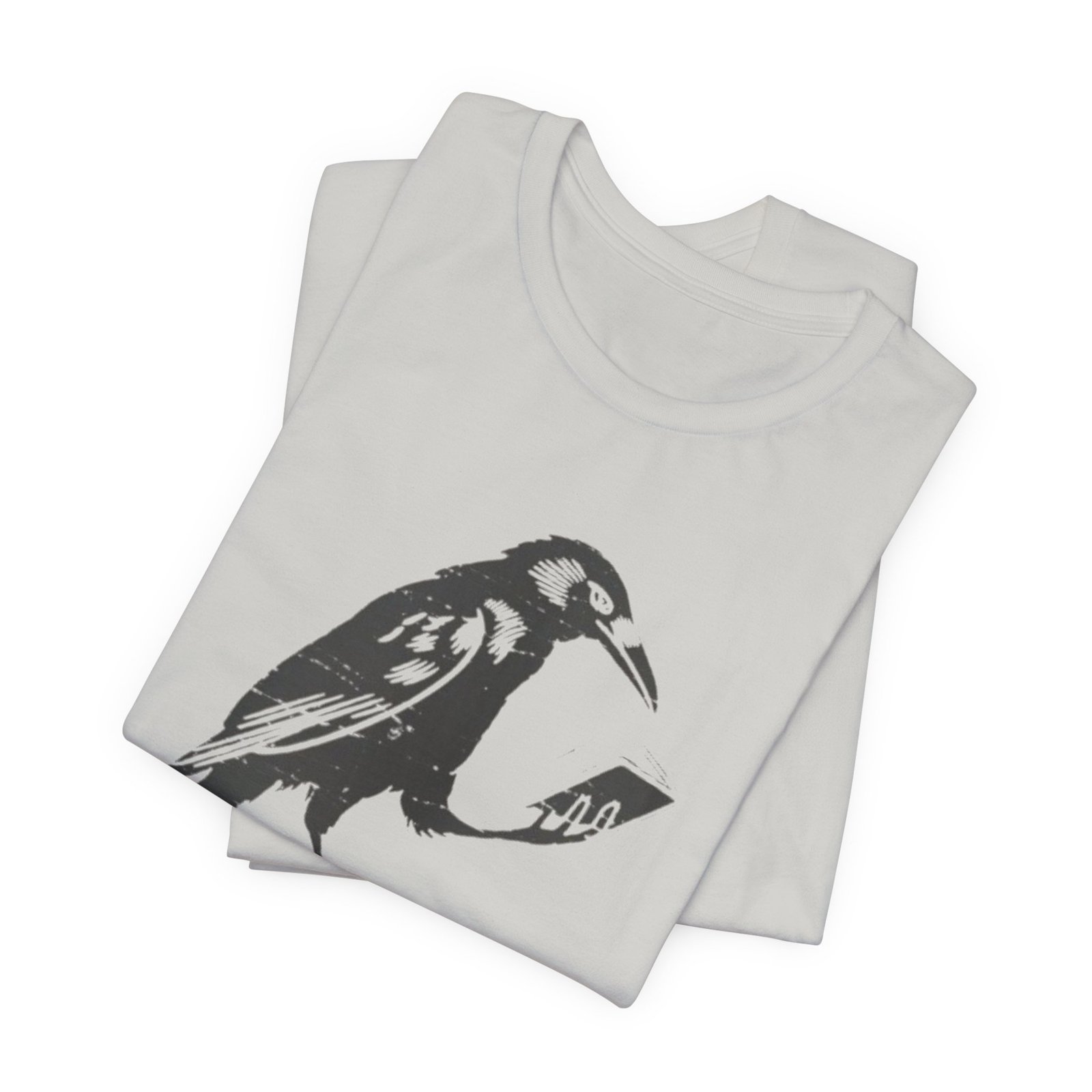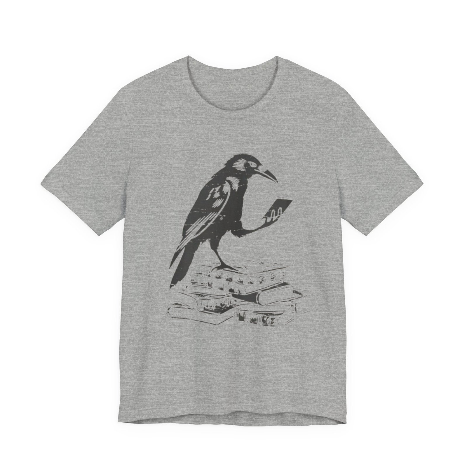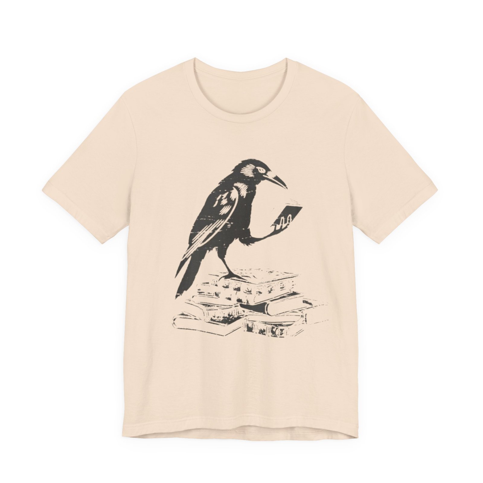 A lightweight, breathable tee with a quiet, curious spirit — a monochrome illustration of a crow perched on stacked books, mid-inspection of a borrowed page. Soft Airlume cotton sits close to the skin while the retail fit keeps the silhouette tidy under a jacket or worn loose on its own. This shirt slips into the life of someone who collects stories, late-night reads, and oddities from flea markets; it reads like a small, wearable vignette that invites conversation without shouting. The tear-away label and stable shoulder tape keep it comfortable for long days of digging through stacks or writing by lamplight. Washed-in black ink and clean lines give it a slightly vintage, literary feel that pairs naturally with denim, worn cardigans, and a slow cup of coffee.