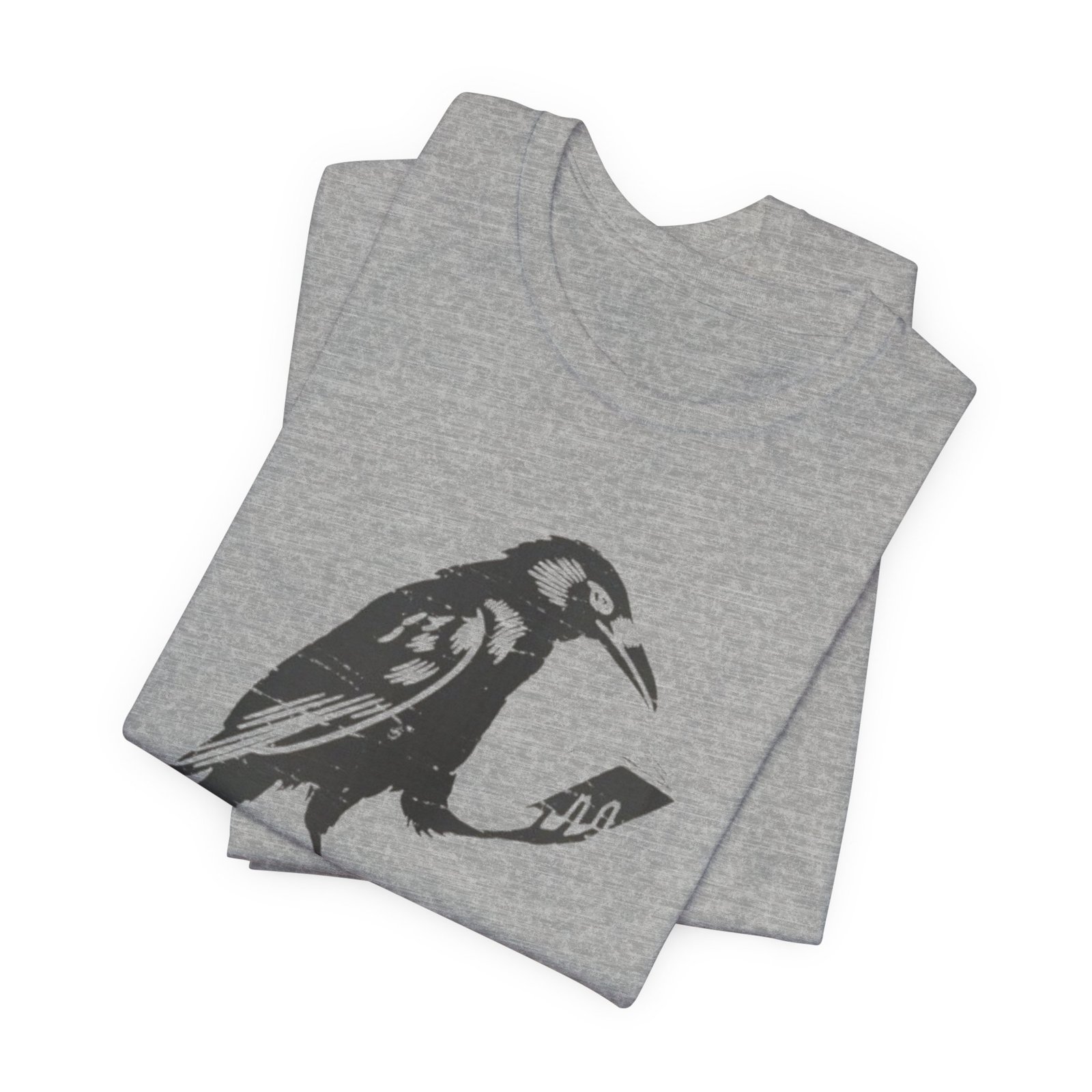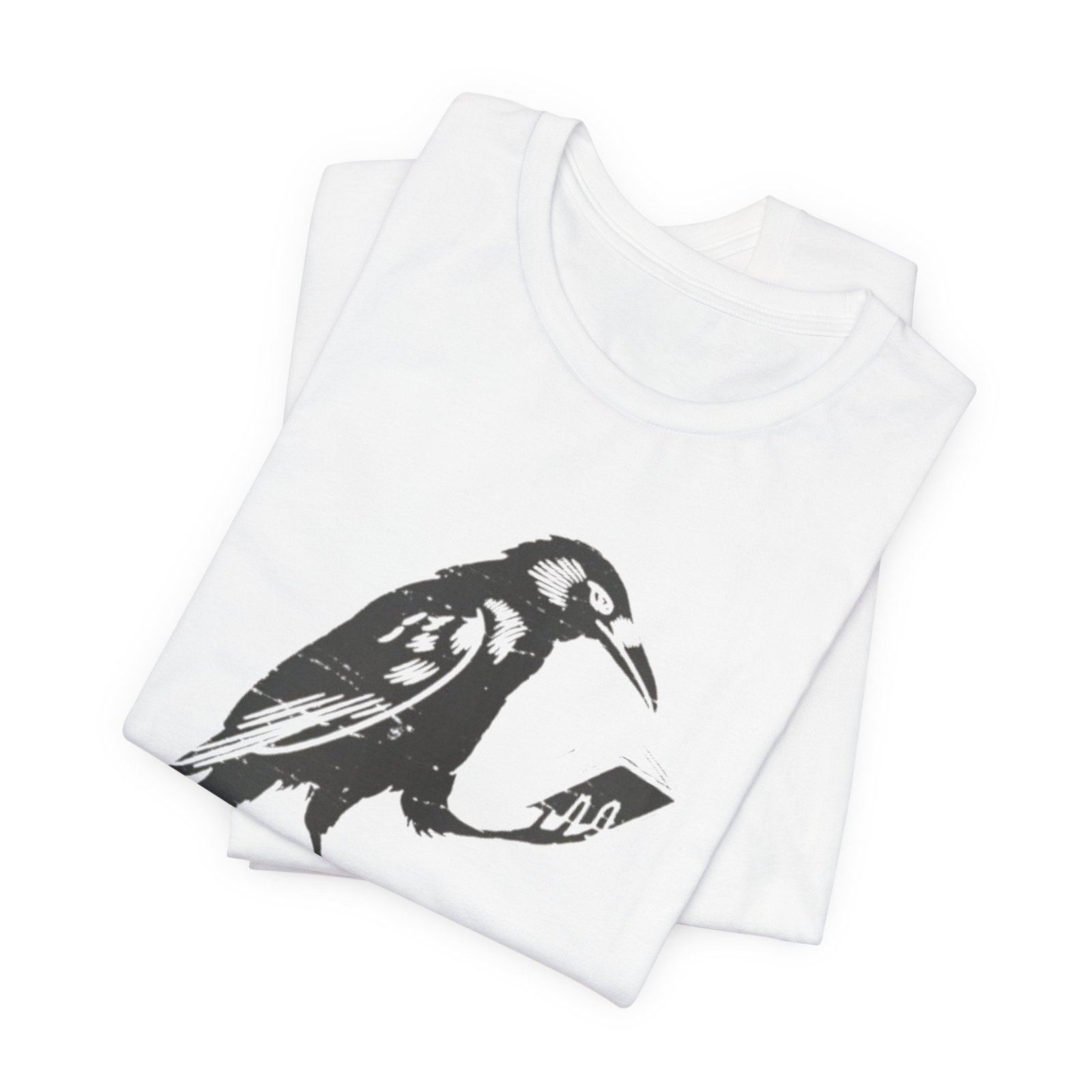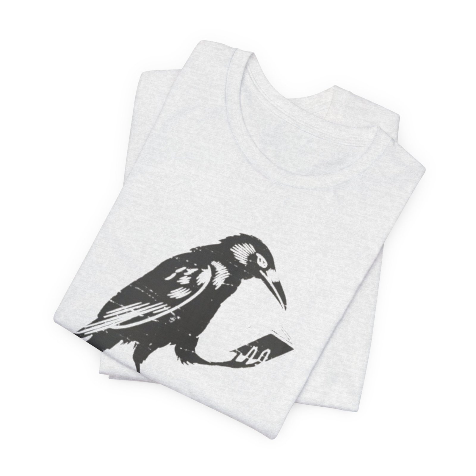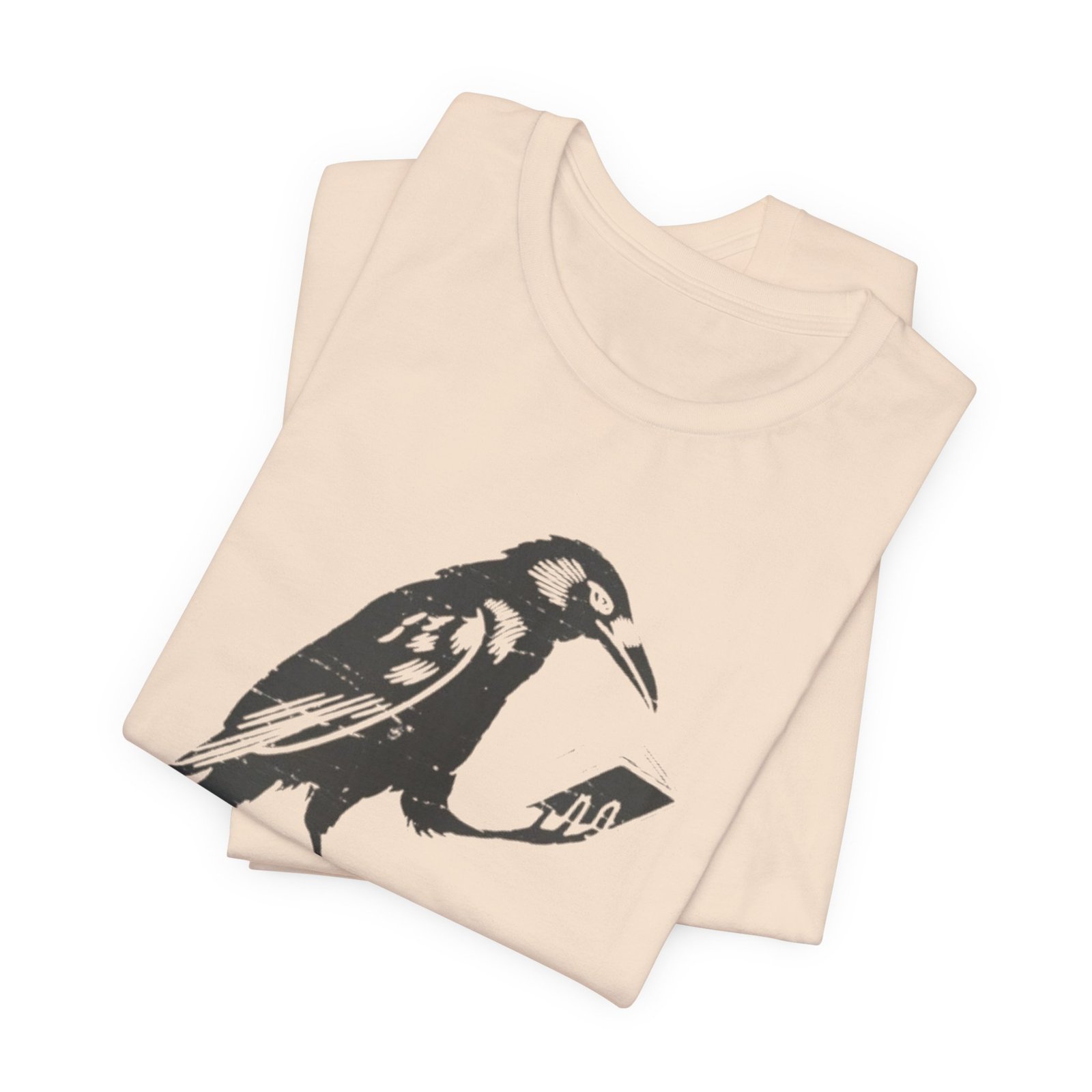 A lightweight, breathable tee with a quiet, curious spirit — a monochrome illustration of a crow perched on stacked books, mid-inspection of a borrowed page. Soft Airlume cotton sits close to the skin while the retail fit keeps the silhouette tidy under a jacket or worn loose on its own. This shirt slips into the life of someone who collects stories, late-night reads, and oddities from flea markets; it reads like a small, wearable vignette that invites conversation without shouting. The tear-away label and stable shoulder tape keep it comfortable for long days of digging through stacks or writing by lamplight. Washed-in black ink and clean lines give it a slightly vintage, literary feel that pairs naturally with denim, worn cardigans, and a slow cup of coffee.