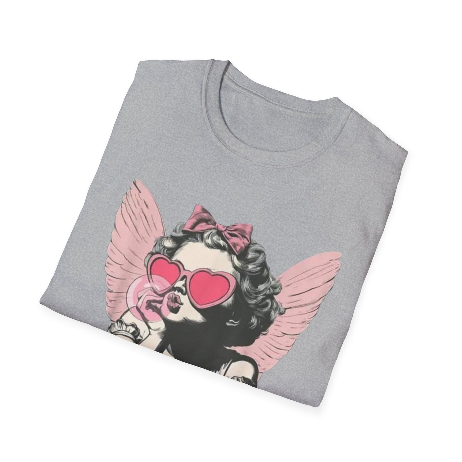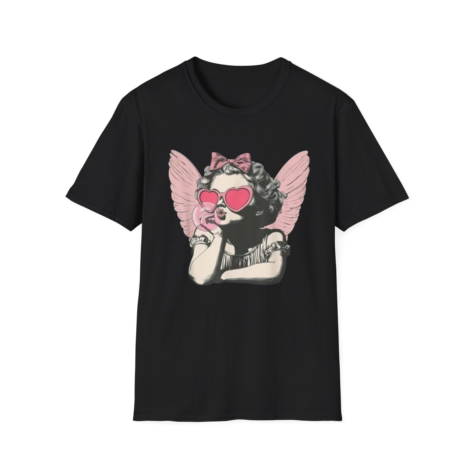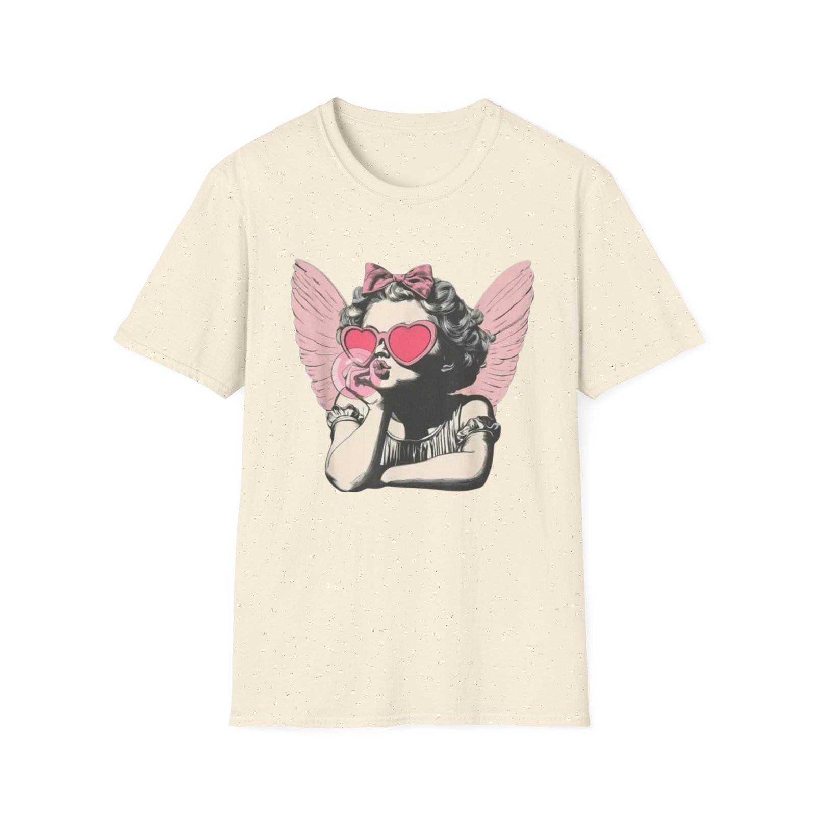 A lightweight, soft cotton tee printed with a playful, retro-inspired angelic girl graphic — pink heart-shaped sunglasses, a bow, and delicate wings give it a cheeky, nostalgic edge. The shirt sits cleanly on the body with a classic crew neckline and smooth tubular knit that keeps the silhouette simple so the artwork takes center stage. Wear it when you want to mix vintage charm with a little attitude: layered under a denim jacket for city strolls, tossed on for coffee with friends, or worn at casual weekend gatherings to spark smiles and conversations.
