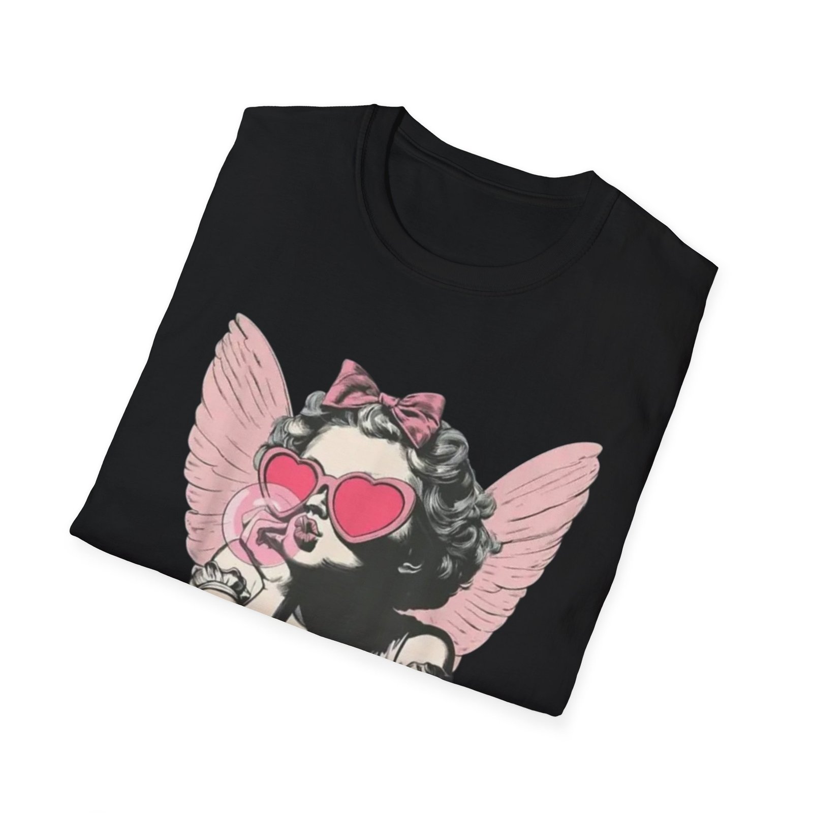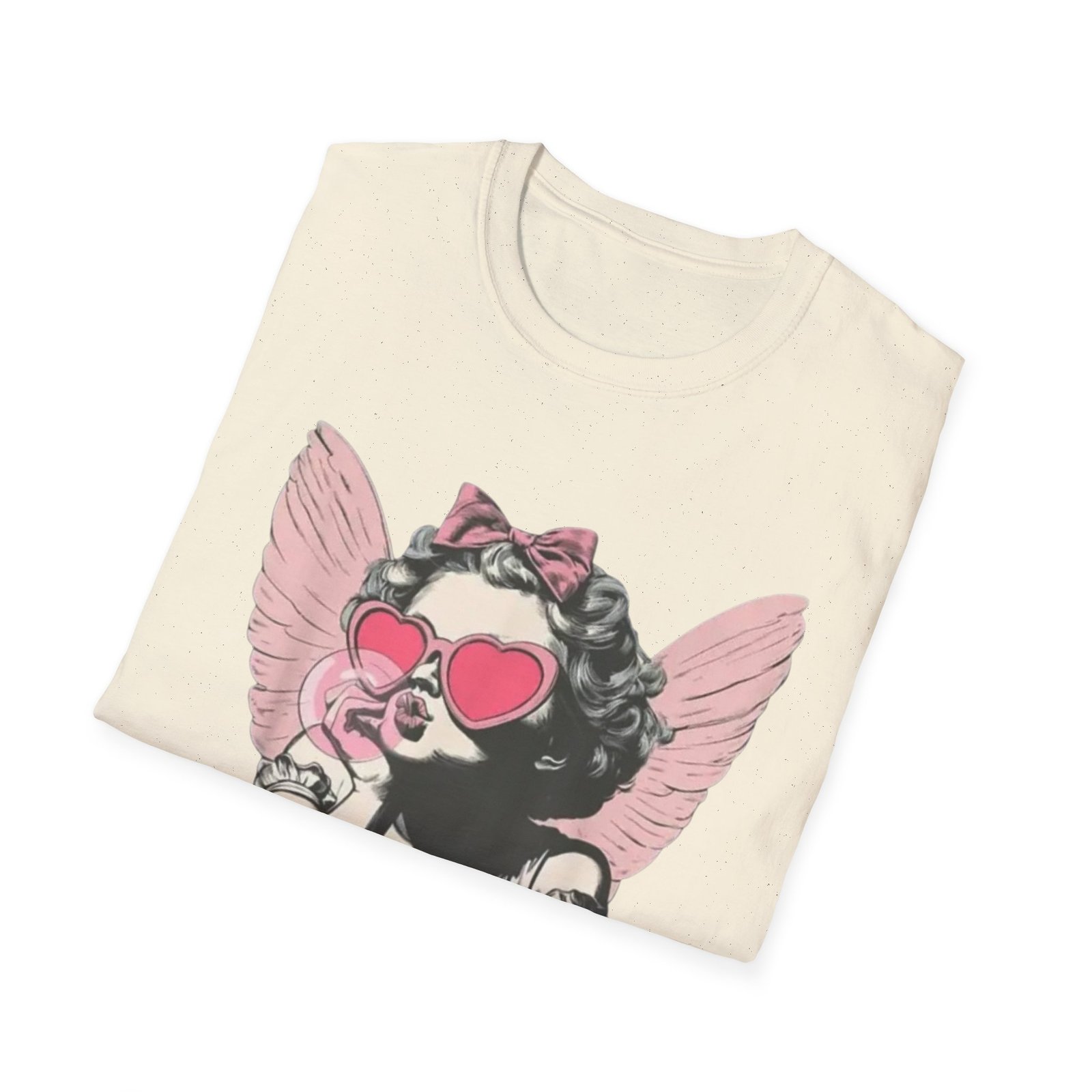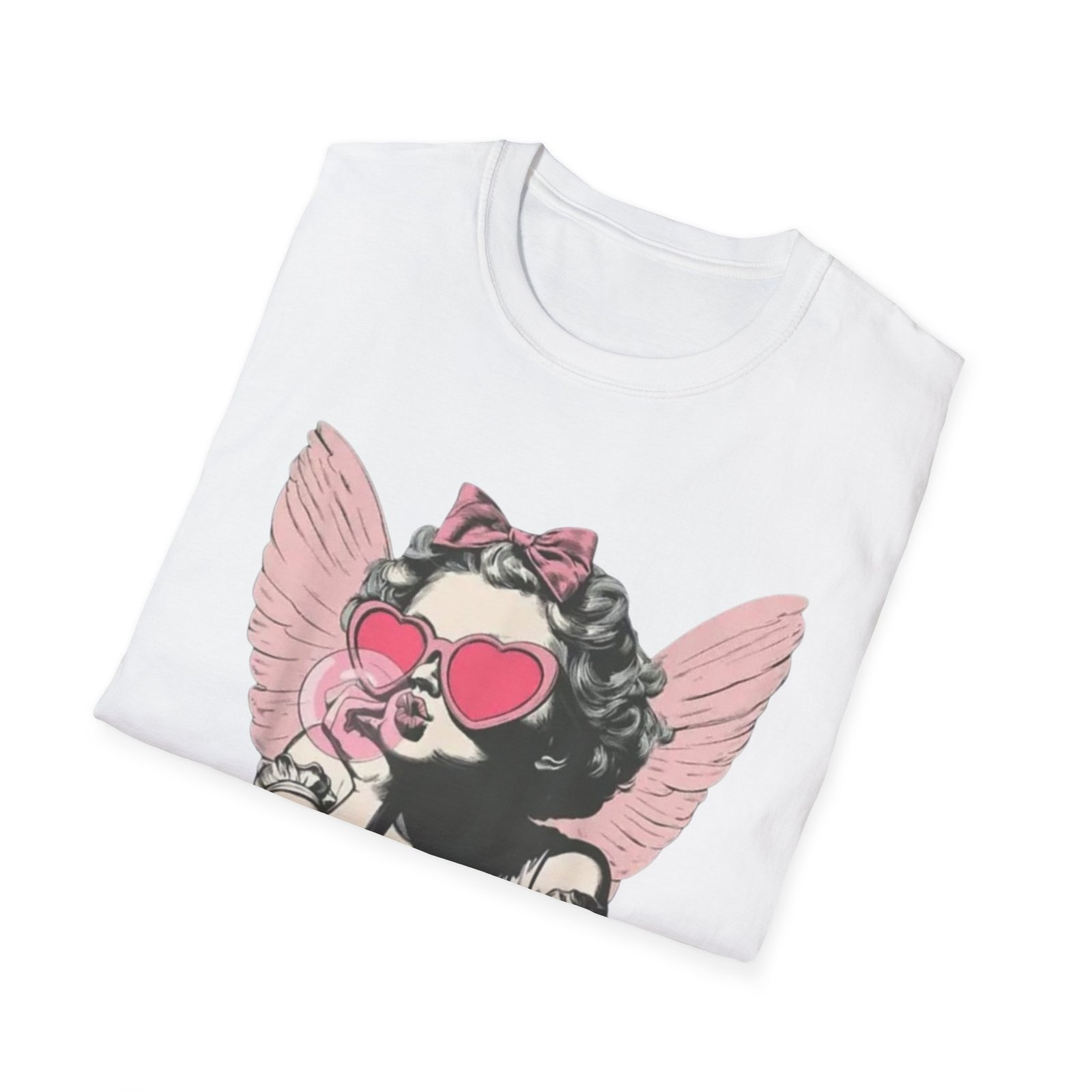 A lightweight, soft cotton tee printed with a playful, retro-inspired angelic girl graphic — pink heart-shaped sunglasses, a bow, and delicate wings give it a cheeky, nostalgic edge. The shirt sits cleanly on the body with a classic crew neckline and smooth tubular knit that keeps the silhouette simple so the artwork takes center stage. Wear it when you want to mix vintage charm with a little attitude: layered under a denim jacket for city strolls, tossed on for coffee with friends, or worn at casual weekend gatherings to spark smiles and conversations.