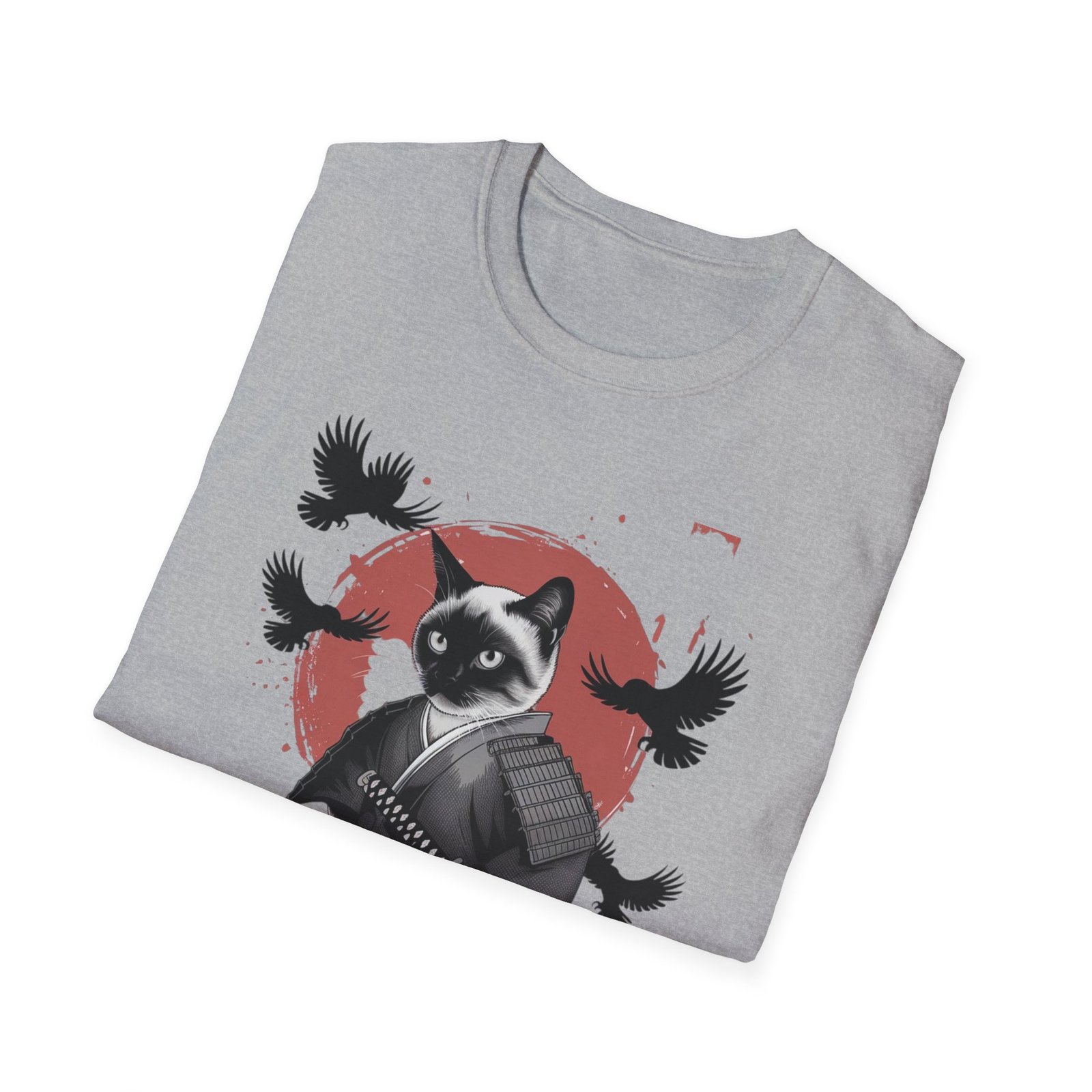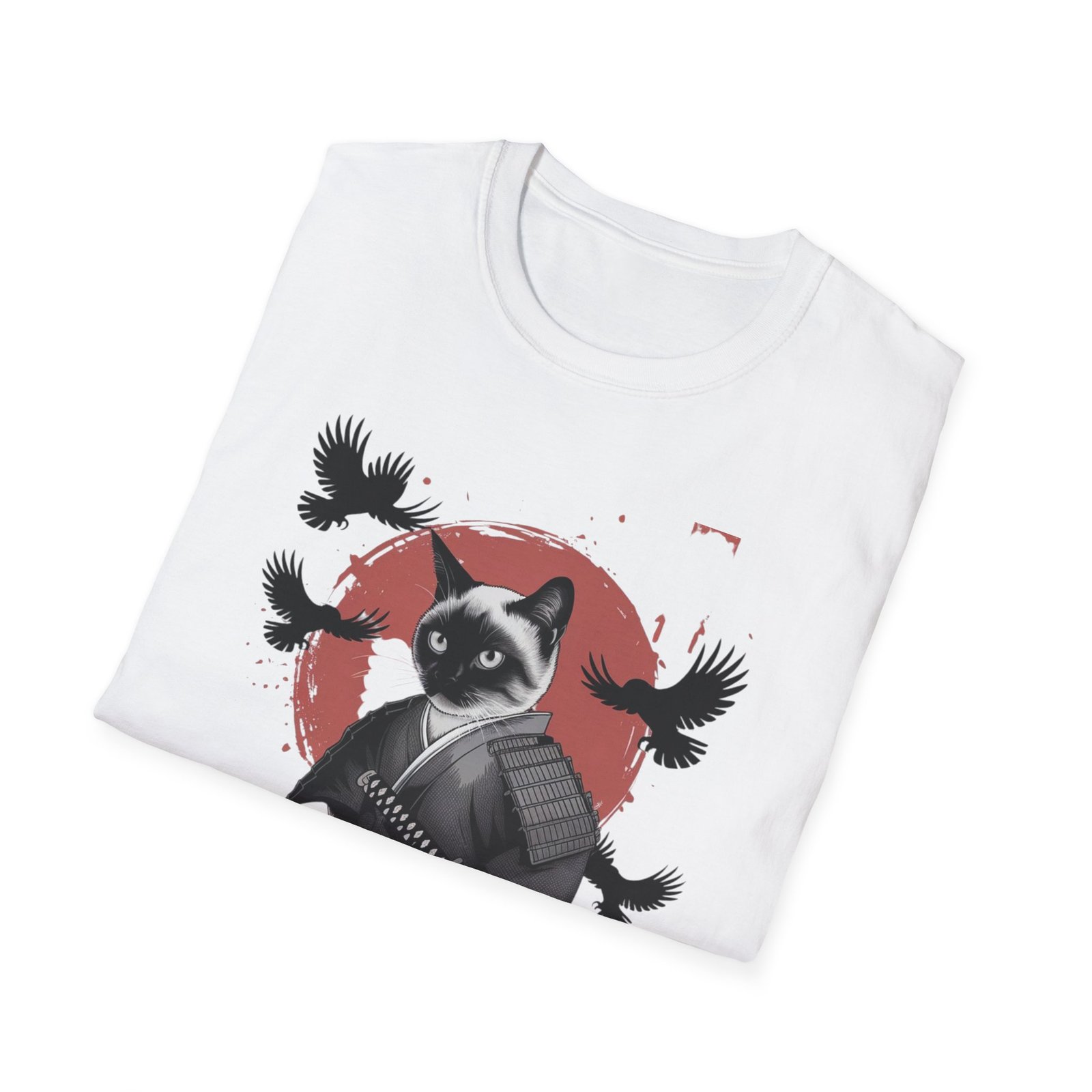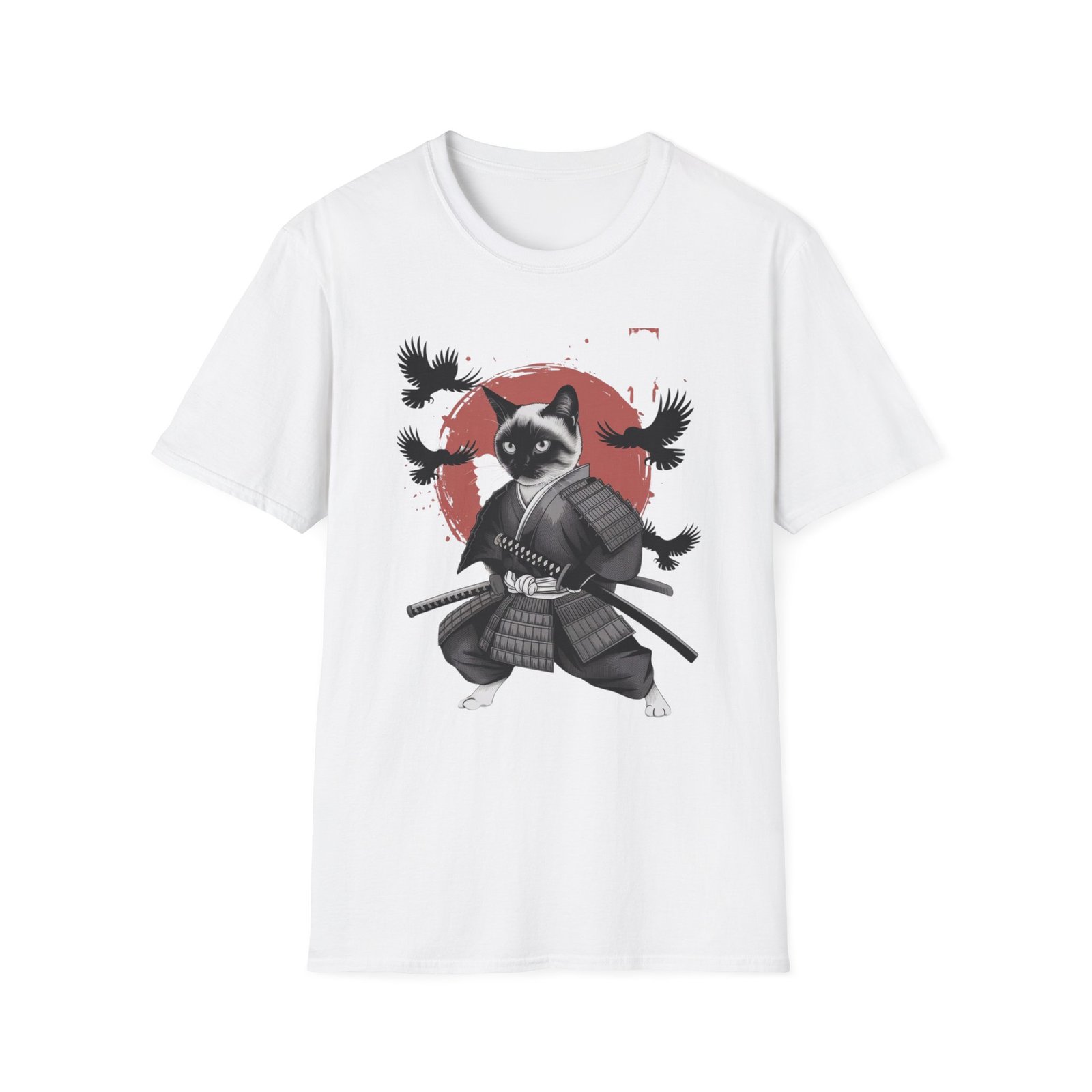 A fun and unique Samurai kitty design adorns this softstyle T-Shirt, giving off a playful and whimsical vibe. Perfect for cat lovers and those who appreciate quirky art. Ideal for casual wear or as a statement piece for gatherings, parties, or everyday wear. Relevant for cat-themed events, comic conventions, and casual outings.