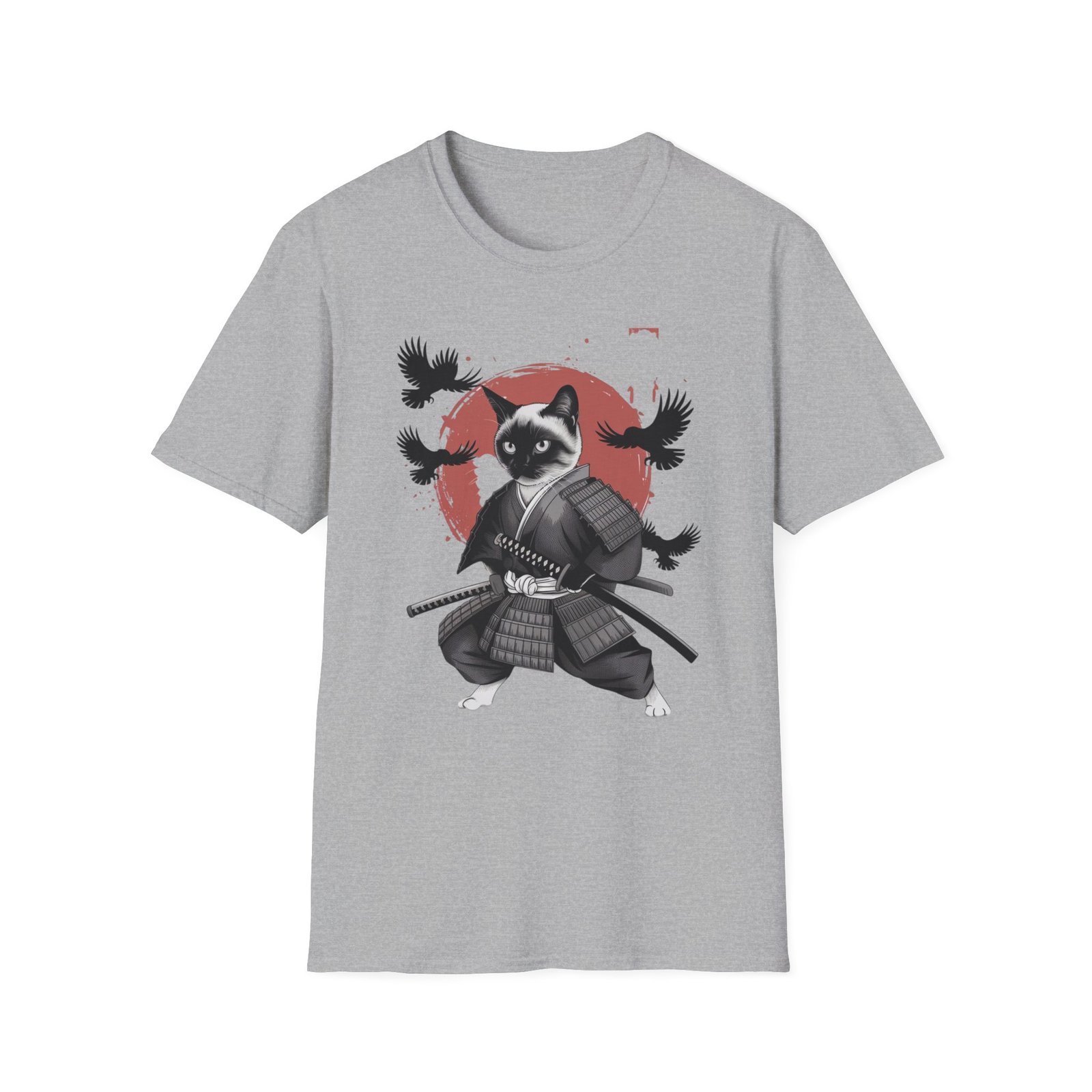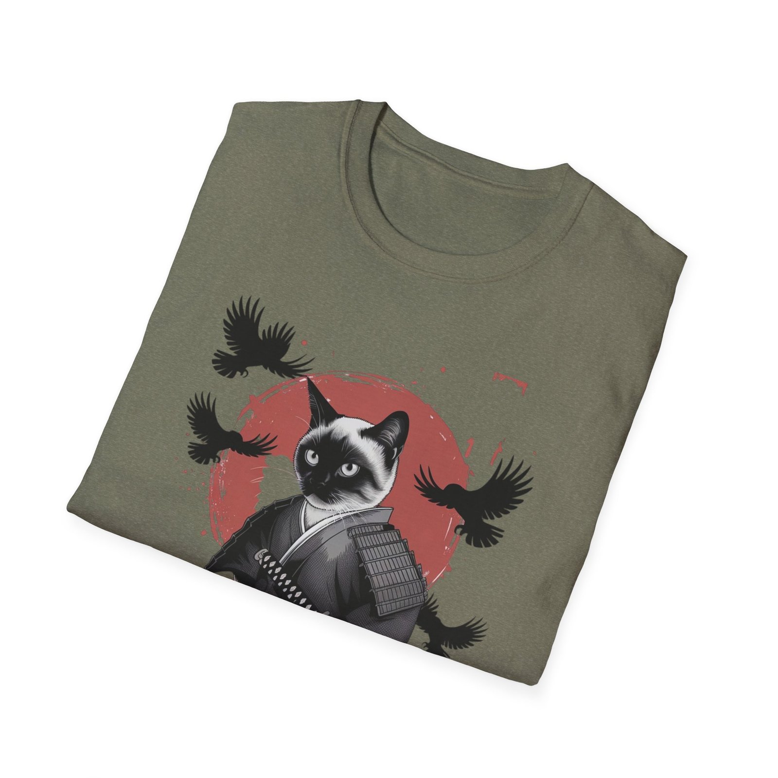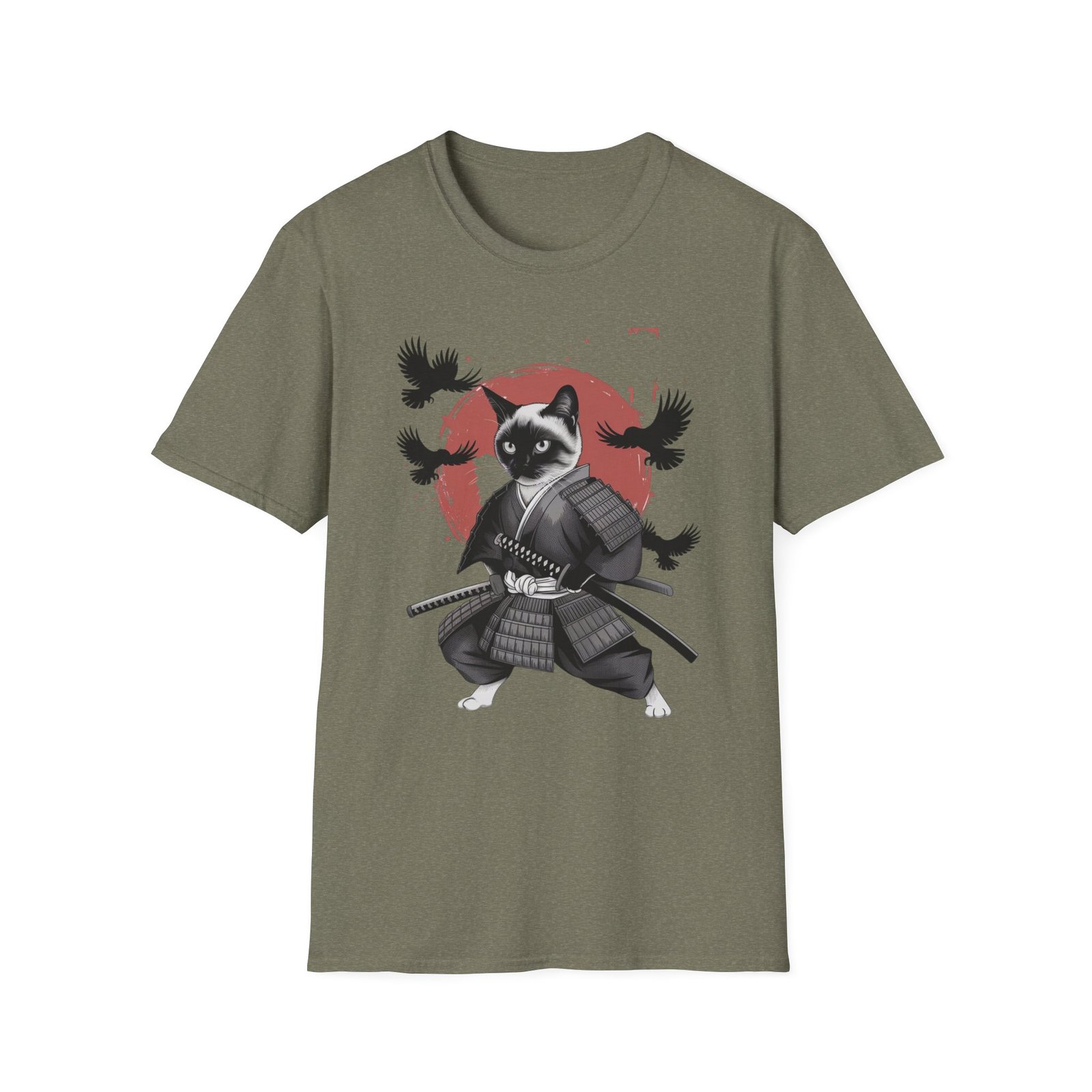 A fun and unique Samurai kitty design adorns this softstyle T-Shirt, giving off a playful and whimsical vibe. Perfect for cat lovers and those who appreciate quirky art. Ideal for casual wear or as a statement piece for gatherings, parties, or everyday wear. Relevant for cat-themed events, comic conventions, and casual outings.
