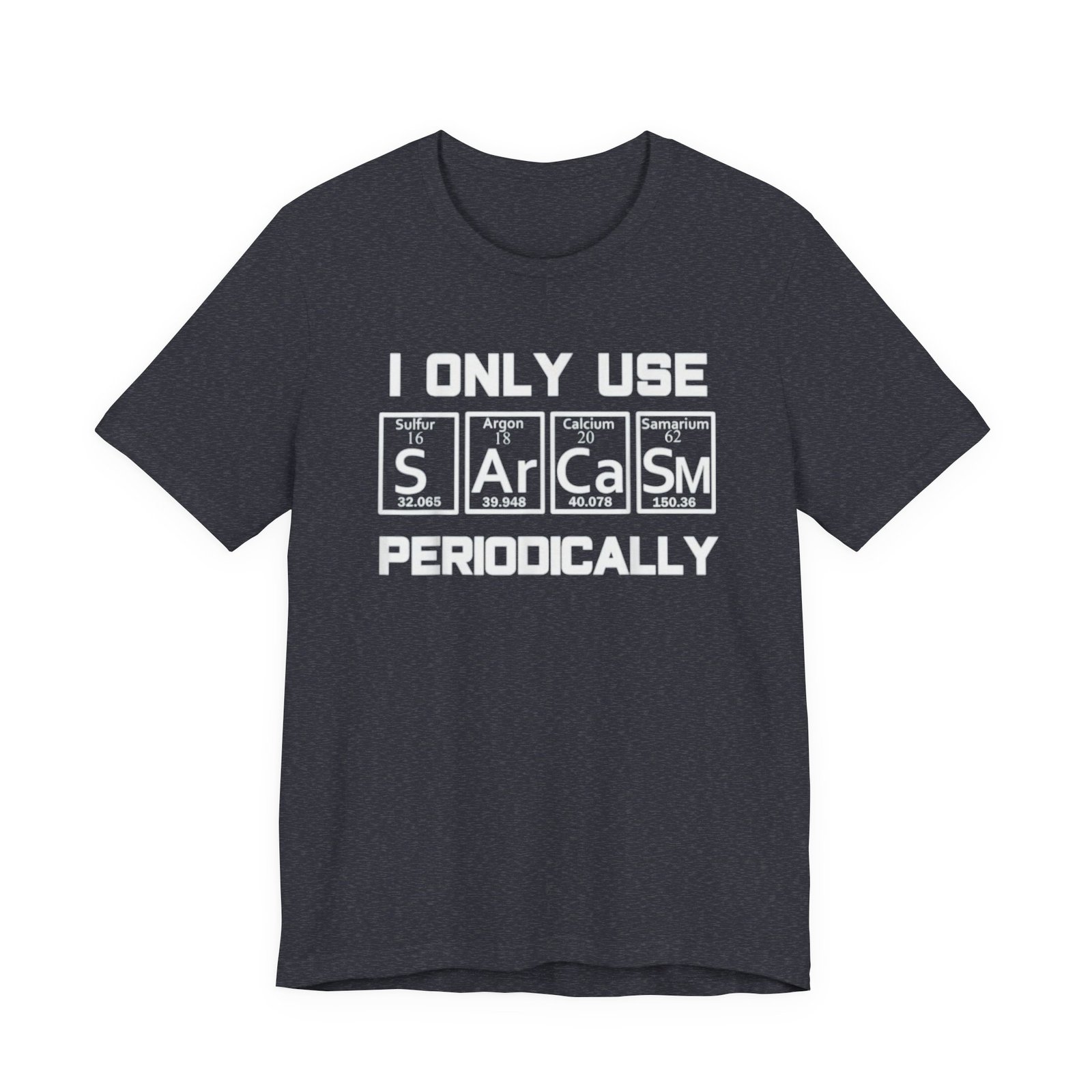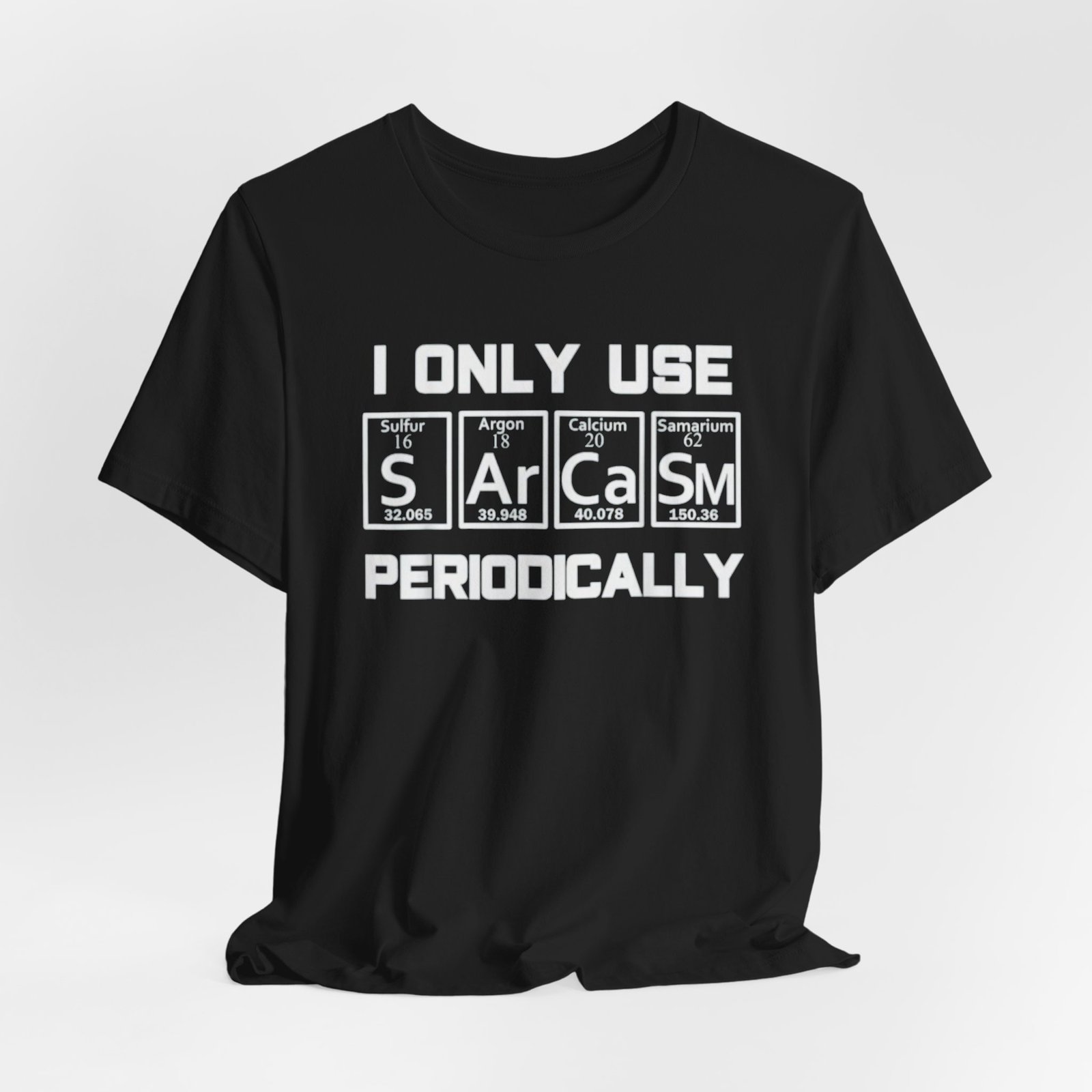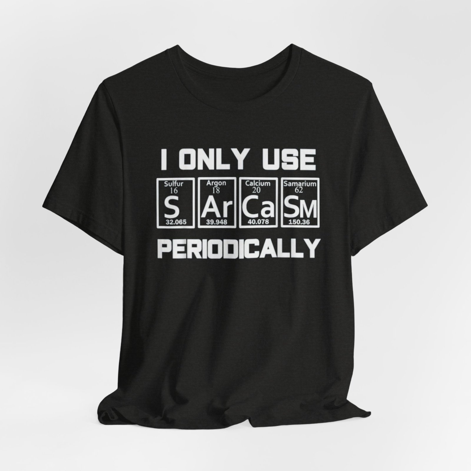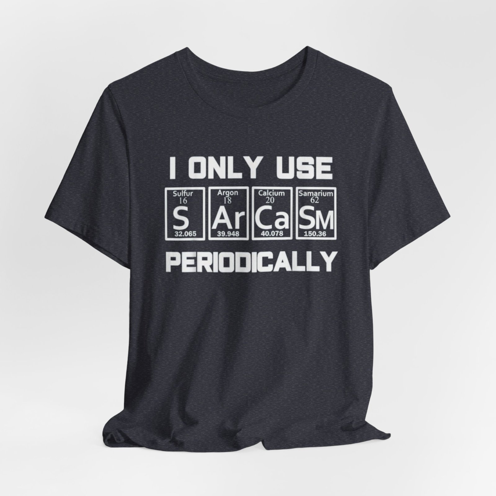 This lightweight cotton tee carries a sly, science‑y sense of humor — white periodic‑table style lettering reads “I ONLY USE SArCaSm PERIODICALLY,” letting a dry wit do the talking. Breathable Airlume combed and ring‑spun cotton keeps the shirt soft and airy for everyday wear. The retail cut and crew neckline create a neat, casual silhouette you can layer under jackets or wear on its own. Thoughtful construction details — side seams, ribbed collar, shoulder tape and a tear‑away label — keep the tee comfortable and long‑lasting. Made with responsibly produced Bella+Canvas blanks and printed with crisp, durable techniques, this shirt suits anyone who likes clever wordplay and low‑key, nerdy style.