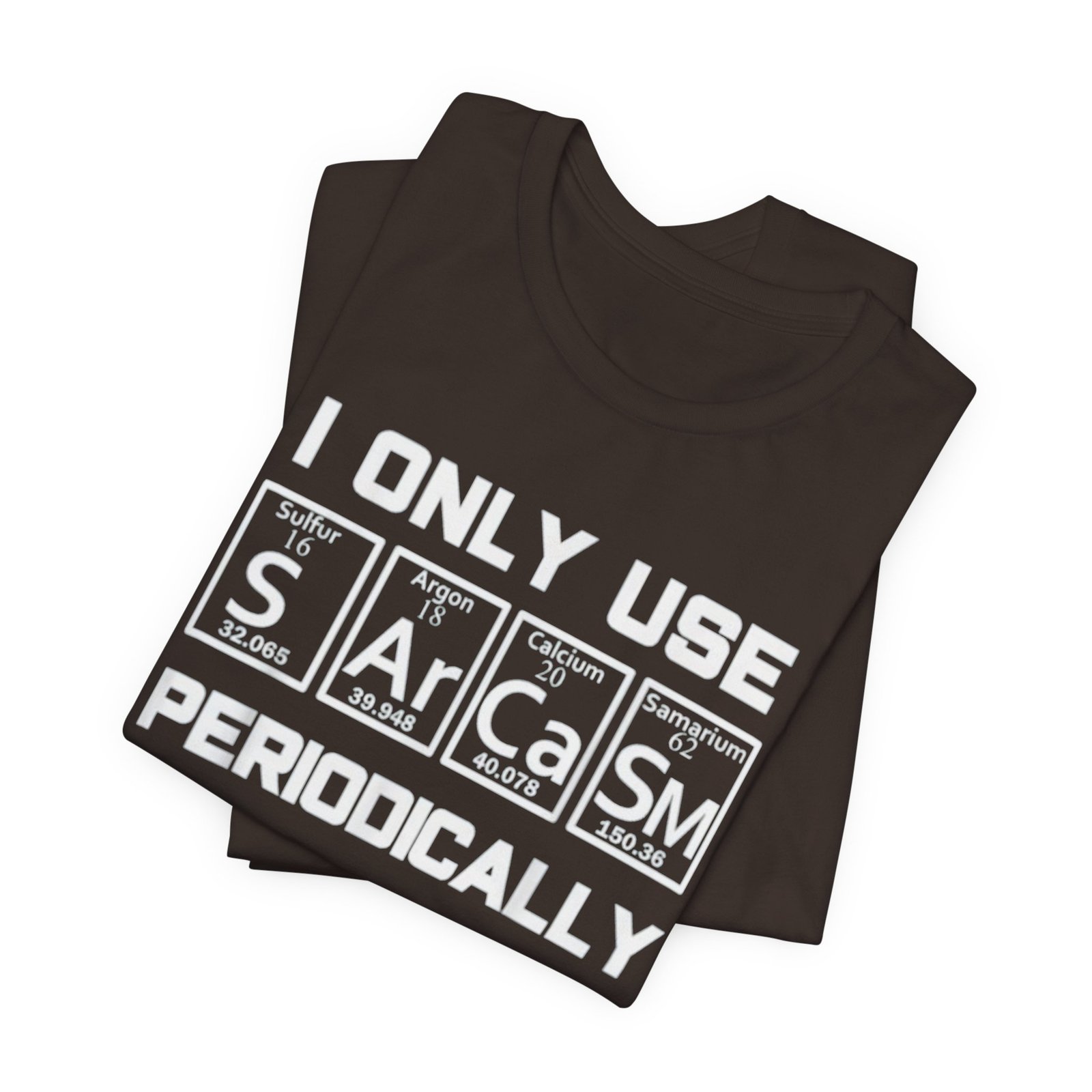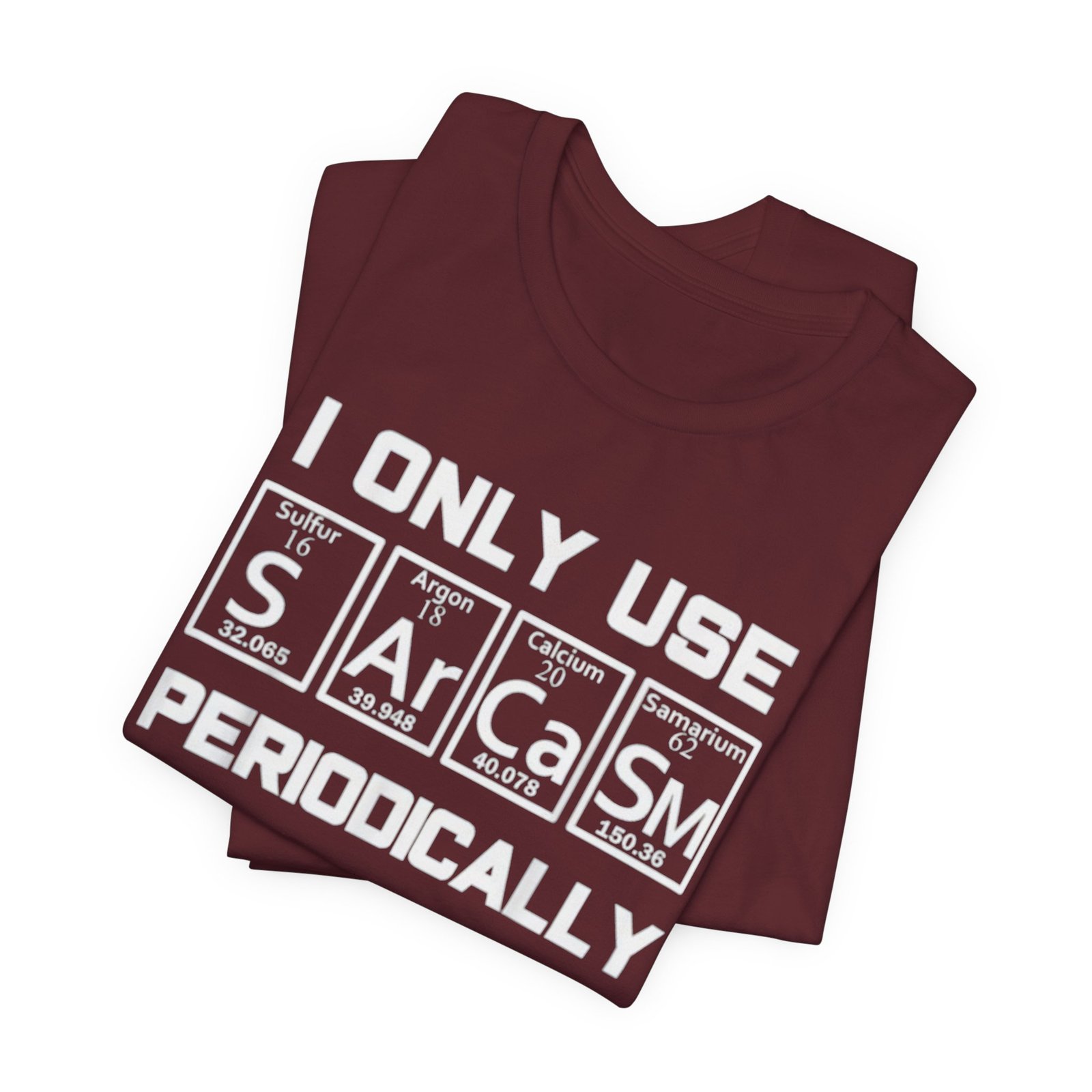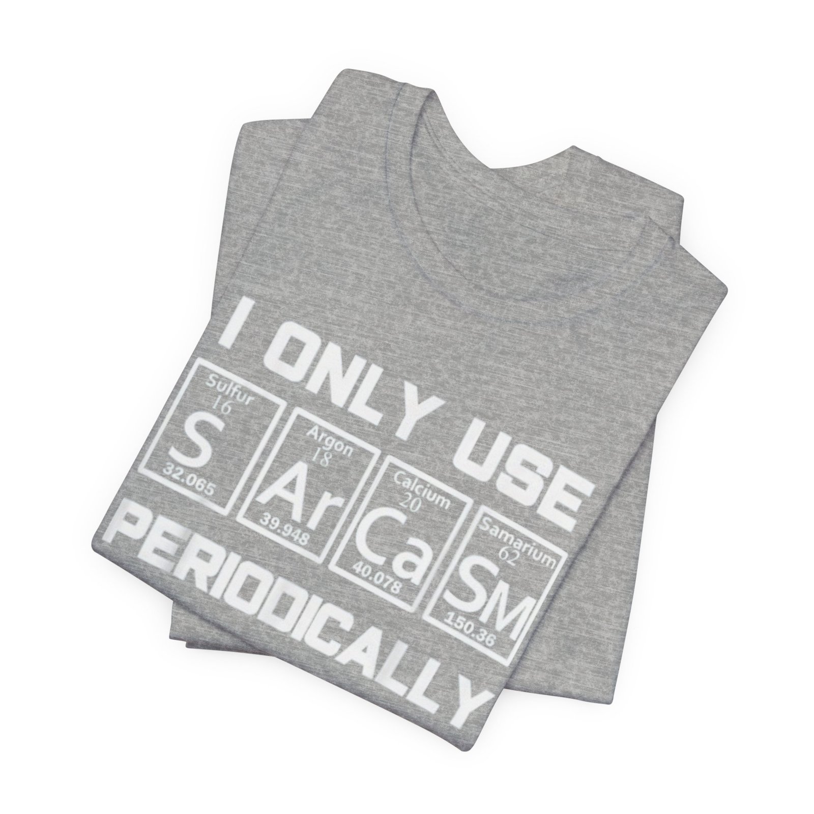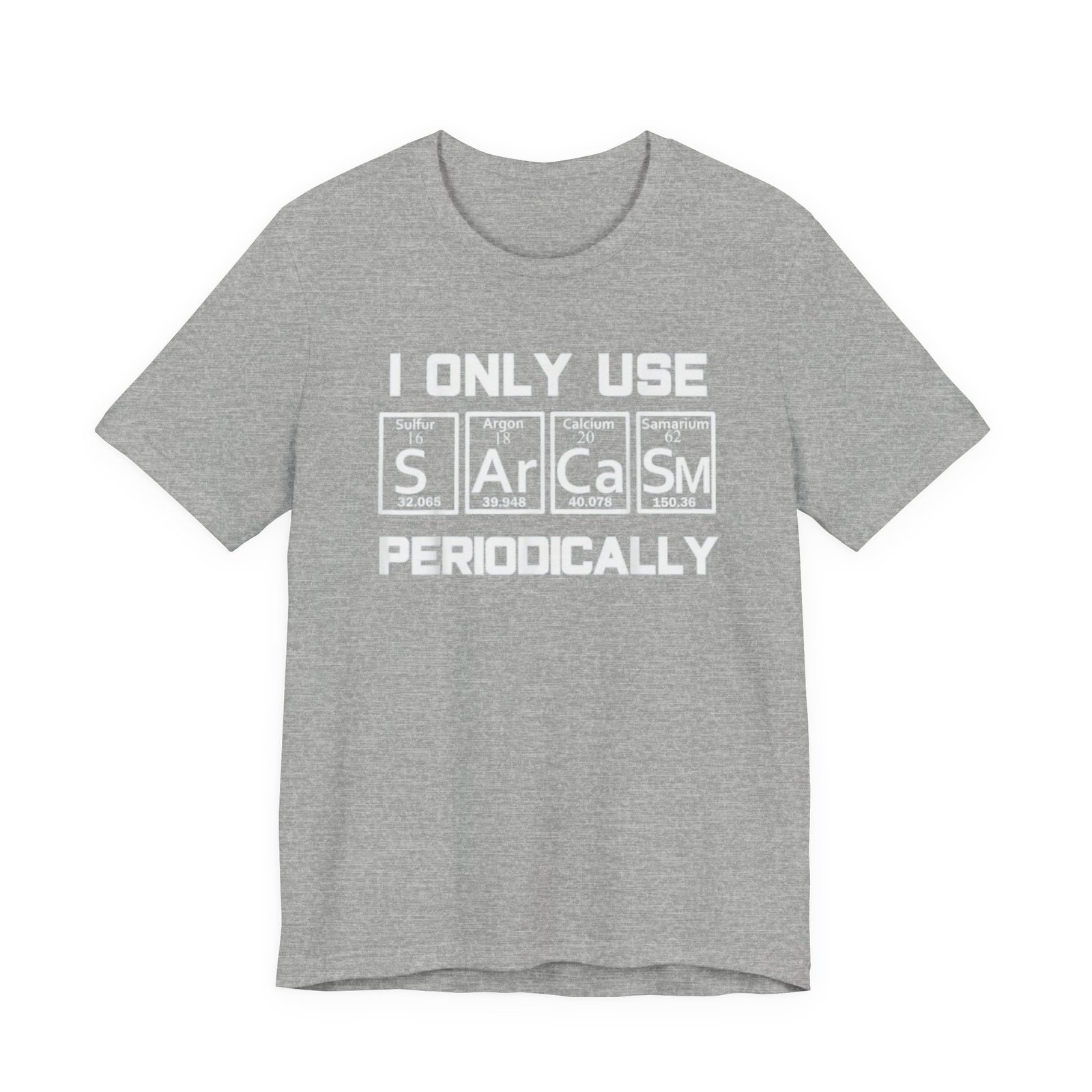 This lightweight cotton tee carries a sly, science‑y sense of humor — white periodic‑table style lettering reads “I ONLY USE SArCaSm PERIODICALLY,” letting a dry wit do the talking. Breathable Airlume combed and ring‑spun cotton keeps the shirt soft and airy for everyday wear. The retail cut and crew neckline create a neat, casual silhouette you can layer under jackets or wear on its own. Thoughtful construction details — side seams, ribbed collar, shoulder tape and a tear‑away label — keep the tee comfortable and long‑lasting. Made with responsibly produced Bella+Canvas blanks and printed with crisp, durable techniques, this shirt suits anyone who likes clever wordplay and low‑key, nerdy style.