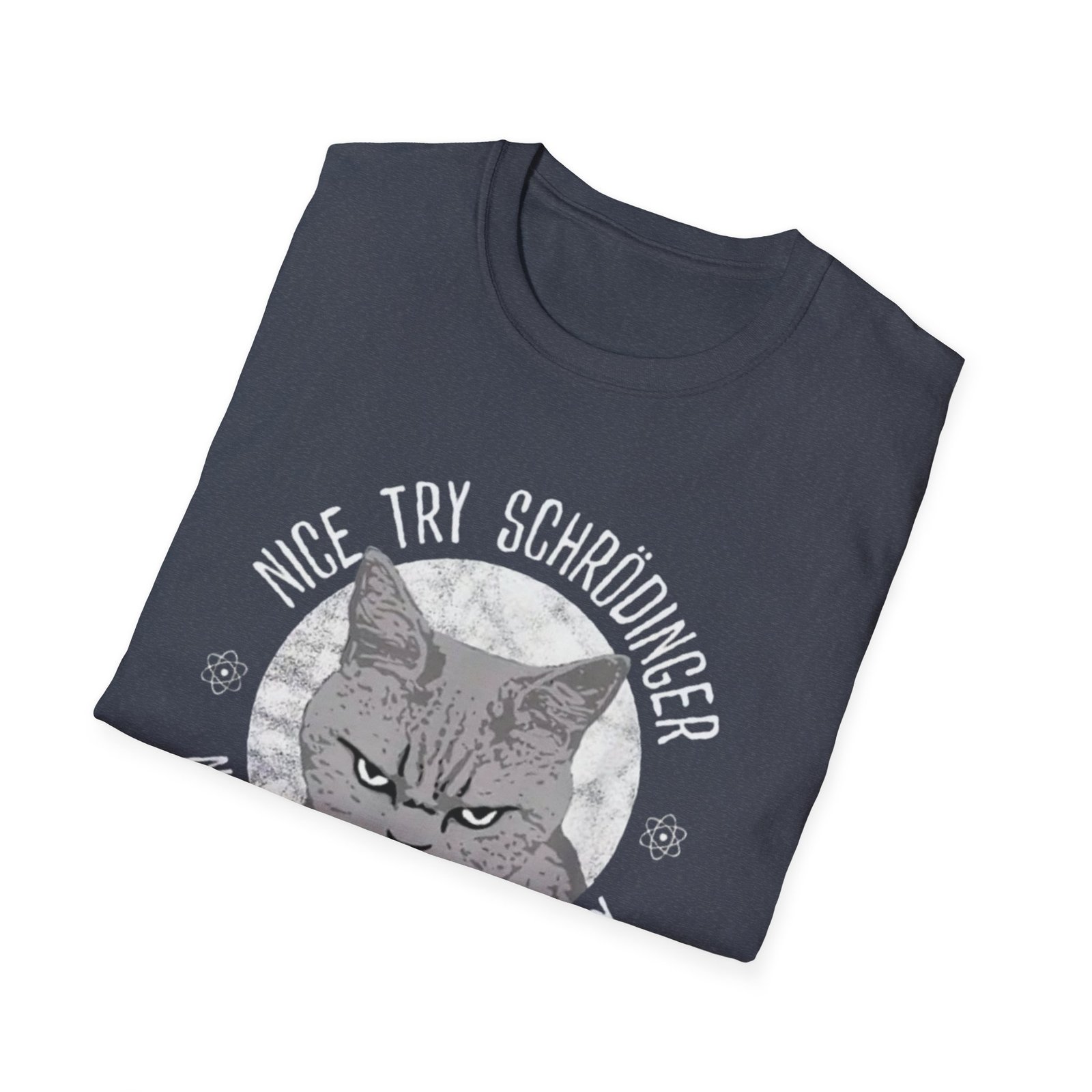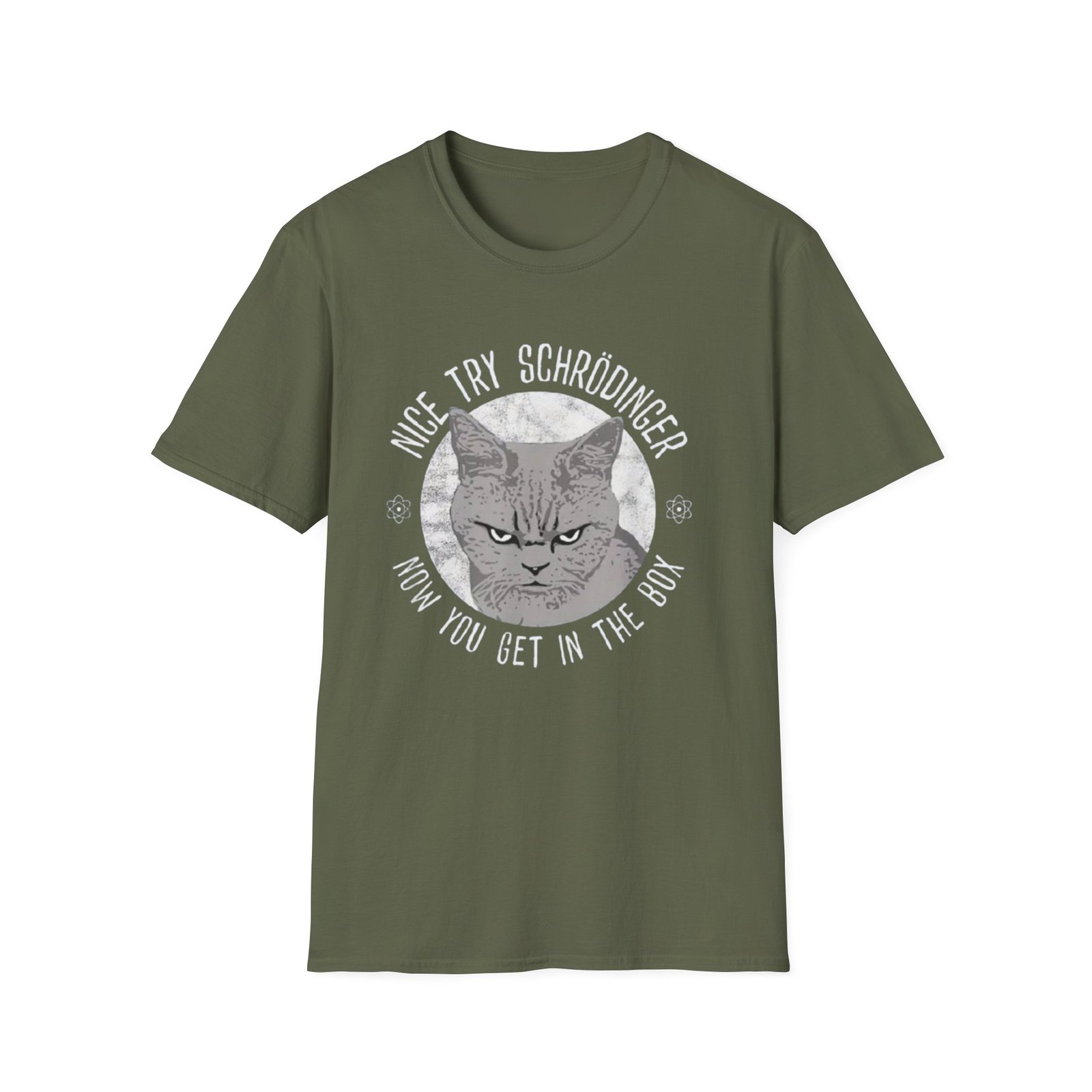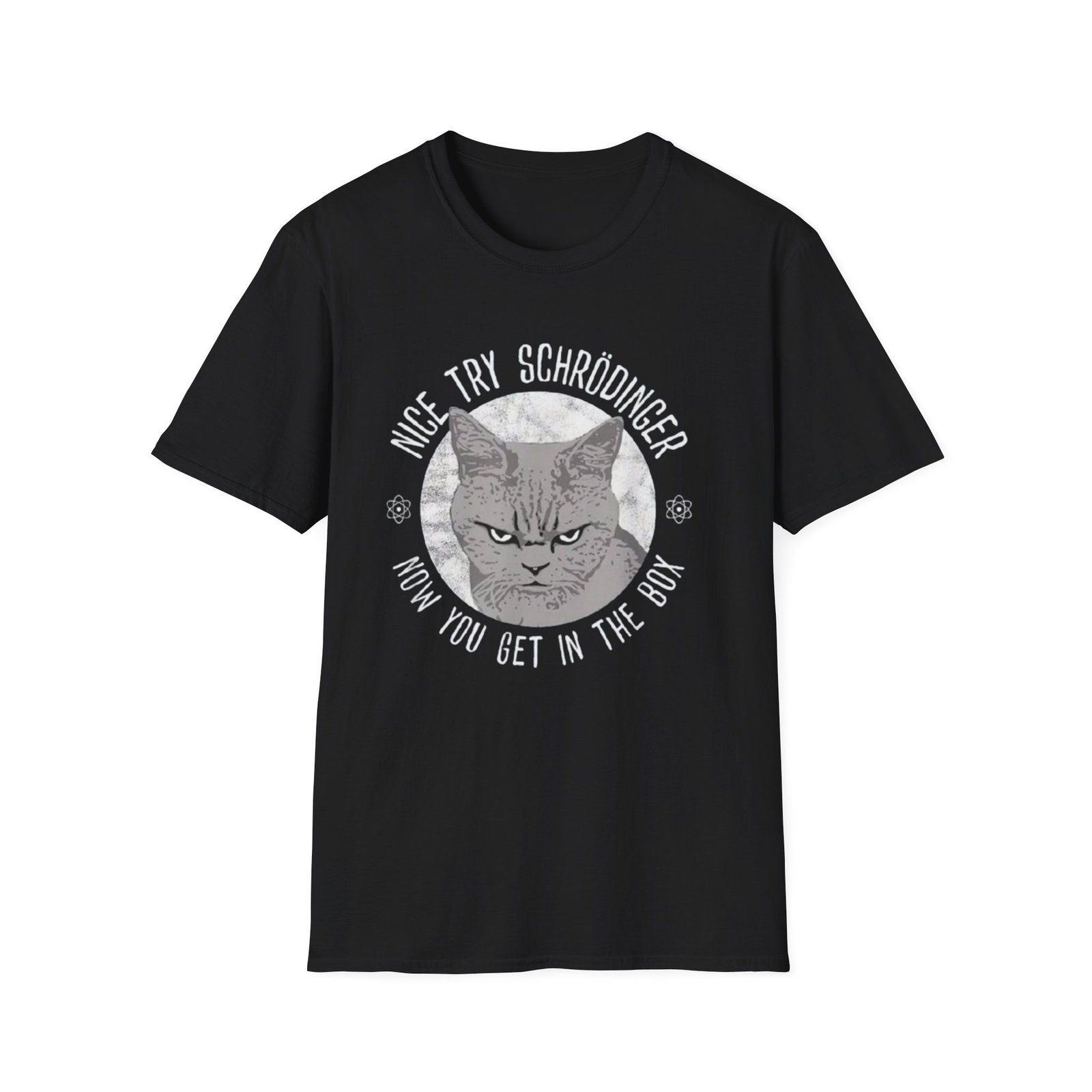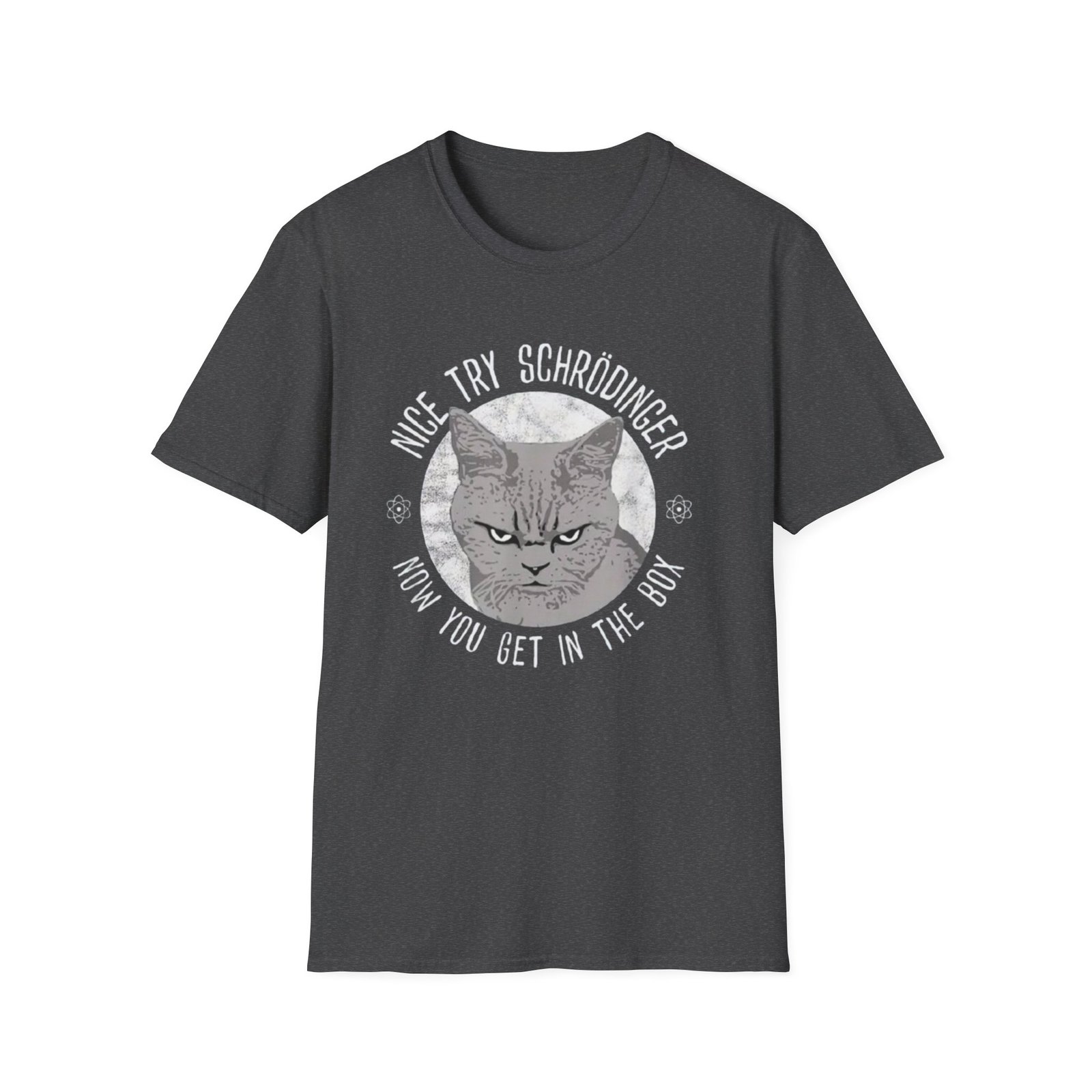 This lightweight crew neck tee wears like a quiet joke you and your smartest friends keep repeating. A deadpan cat face is framed by a distressed circular badge and the wry line “Nice try Schrödinger, now you get in the box” — a tiny rebellion for anyone who loves science, dark humor, or cats that look like they mean it. The soft ring-spun cotton drapes easily, so the design reads clearly without feeling stiff. Wear it to laid-back lectures, study nights, casual coffee runs, or whenever you want to signal that your humor has both claws and curiosity.