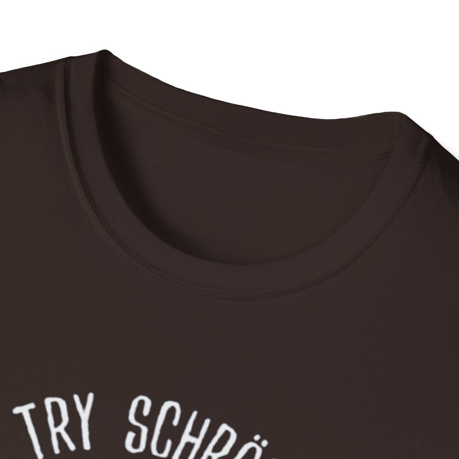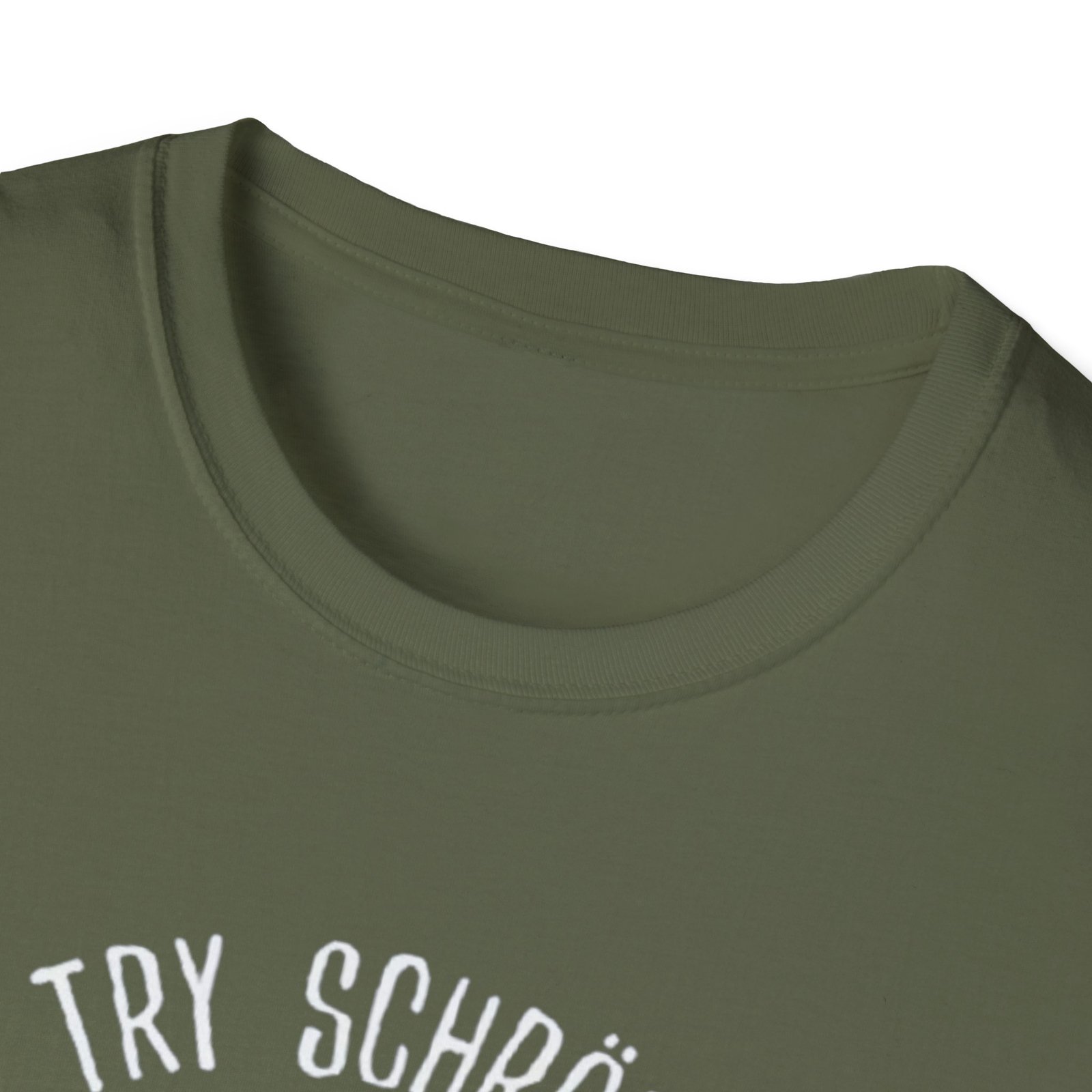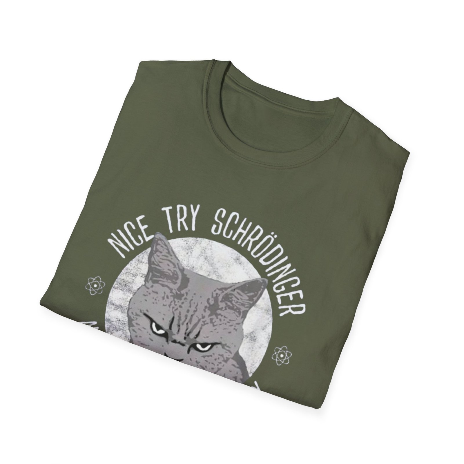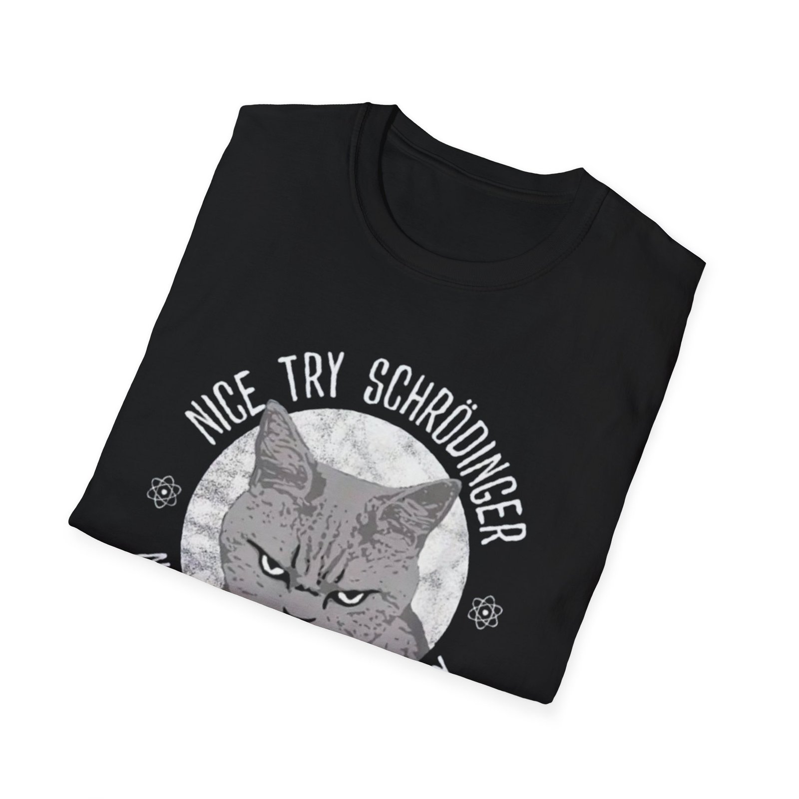This lightweight crew neck tee wears like a quiet joke you and your smartest friends keep repeating. A deadpan cat face is framed by a distressed circular badge and the wry line “Nice try Schrödinger, now you get in the box” — a tiny rebellion for anyone who loves science, dark humor, or cats that look like they mean it. The soft ring-spun cotton drapes easily, so the design reads clearly without feeling stiff. Wear it to laid-back lectures, study nights, casual coffee runs, or whenever you want to signal that your humor has both claws and curiosity.