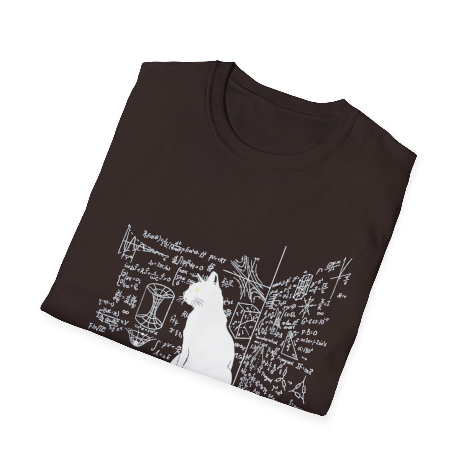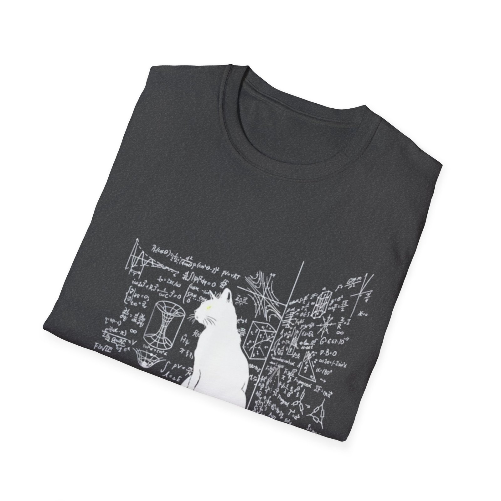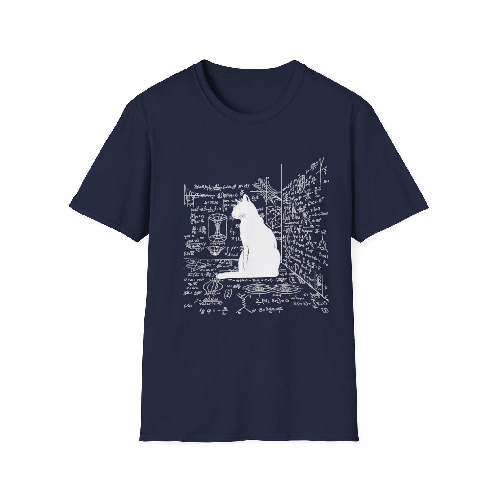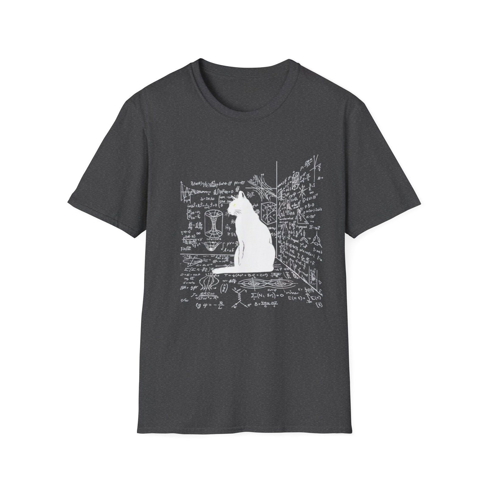 A soft, lightweight tee that reads like a quiet moment in a maker’s sketchbook. A crisp white silhouette of a seated cat sits against a backdrop of hand-drawn equations, notes and corner sketches — like a studio wall where ideas and diagrams live. The shirt’s breathable ring-spun cotton and smooth print surface make the artwork feel part of the fabric, not just on top of it. Wear it to long nights of tinkering, classroom lectures, or lazy afternoons with your sketchpad. It’s understated, a little whimsical, and made to move with you through creative work and everyday life.
