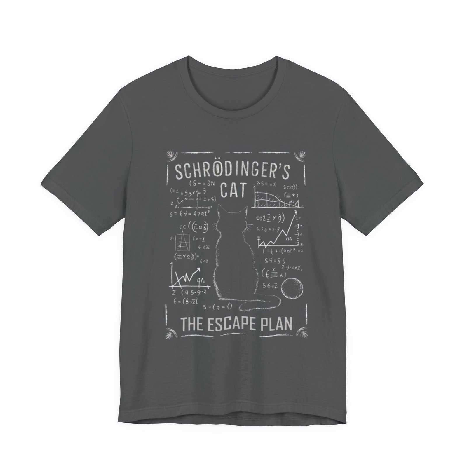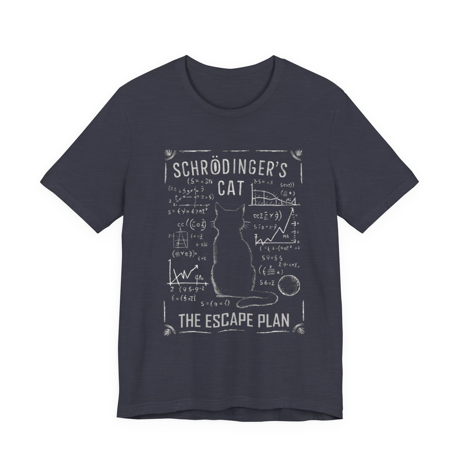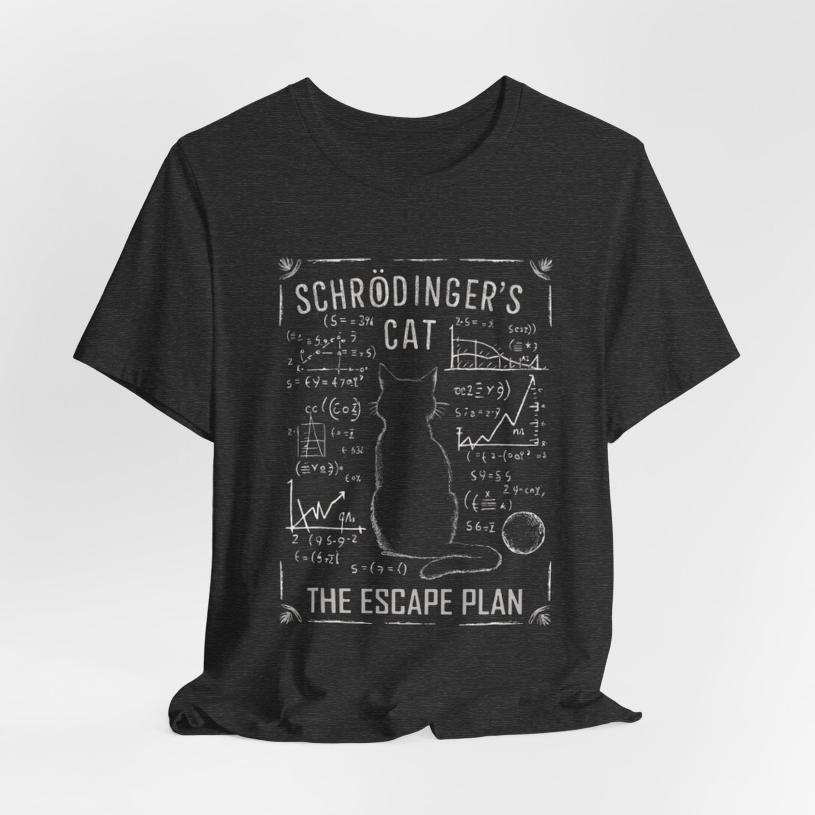Soft, breathable tee with a geeky wink — a chalkboard-style design frames a silhouetted cat surrounded by equations and diagrams labeled “Schrödinger’s Cat: The Escape Plan.” It reads like a scientist’s doodle: playful, clever, and a little mysterious. The shirt drapes neatly with a retail fit and crew neckline, keeping the silhouette smart and easy to layer. Wear it to labs, study sessions, trivia nights, or low-key gatherings where a subtle laugh and a shared love of physics land well.