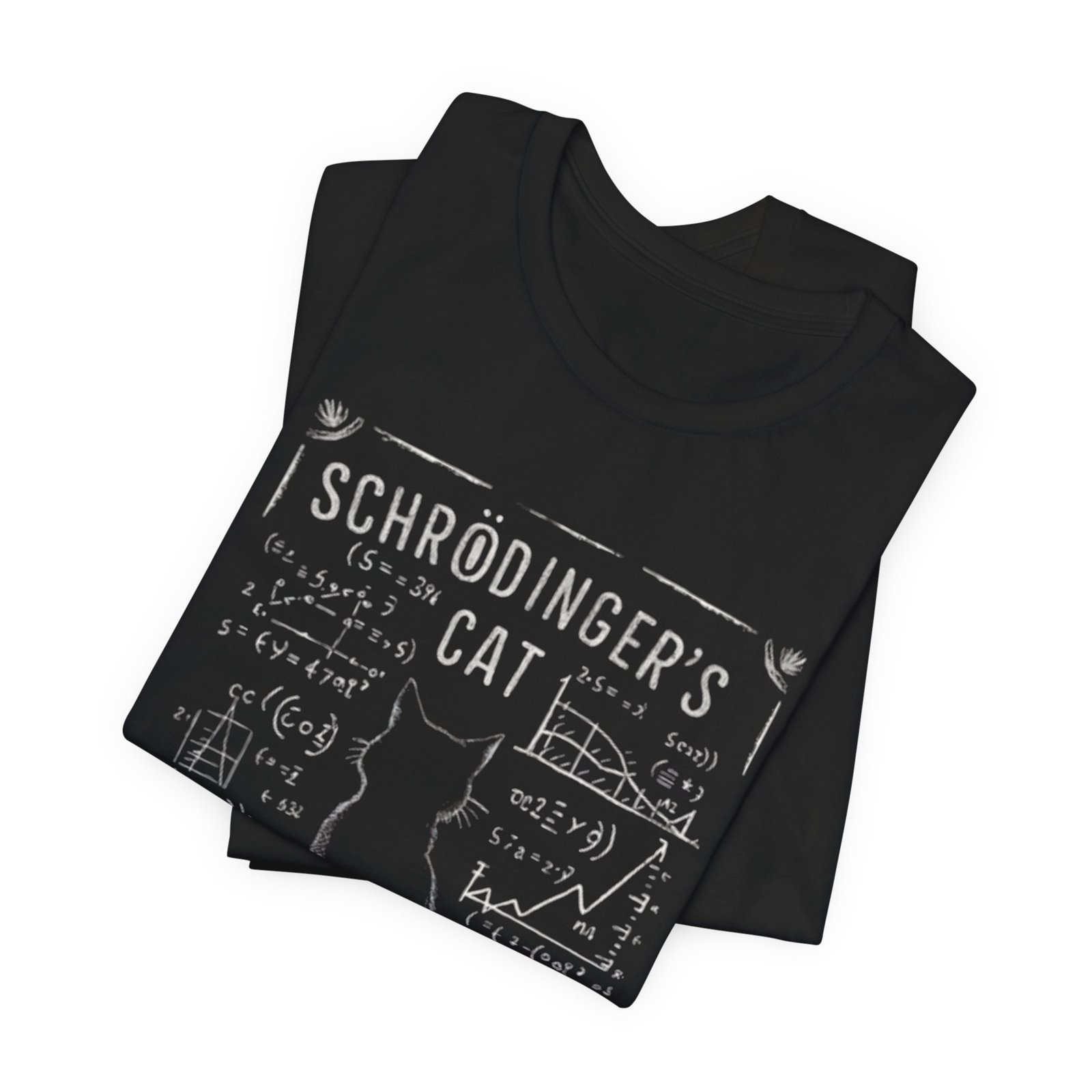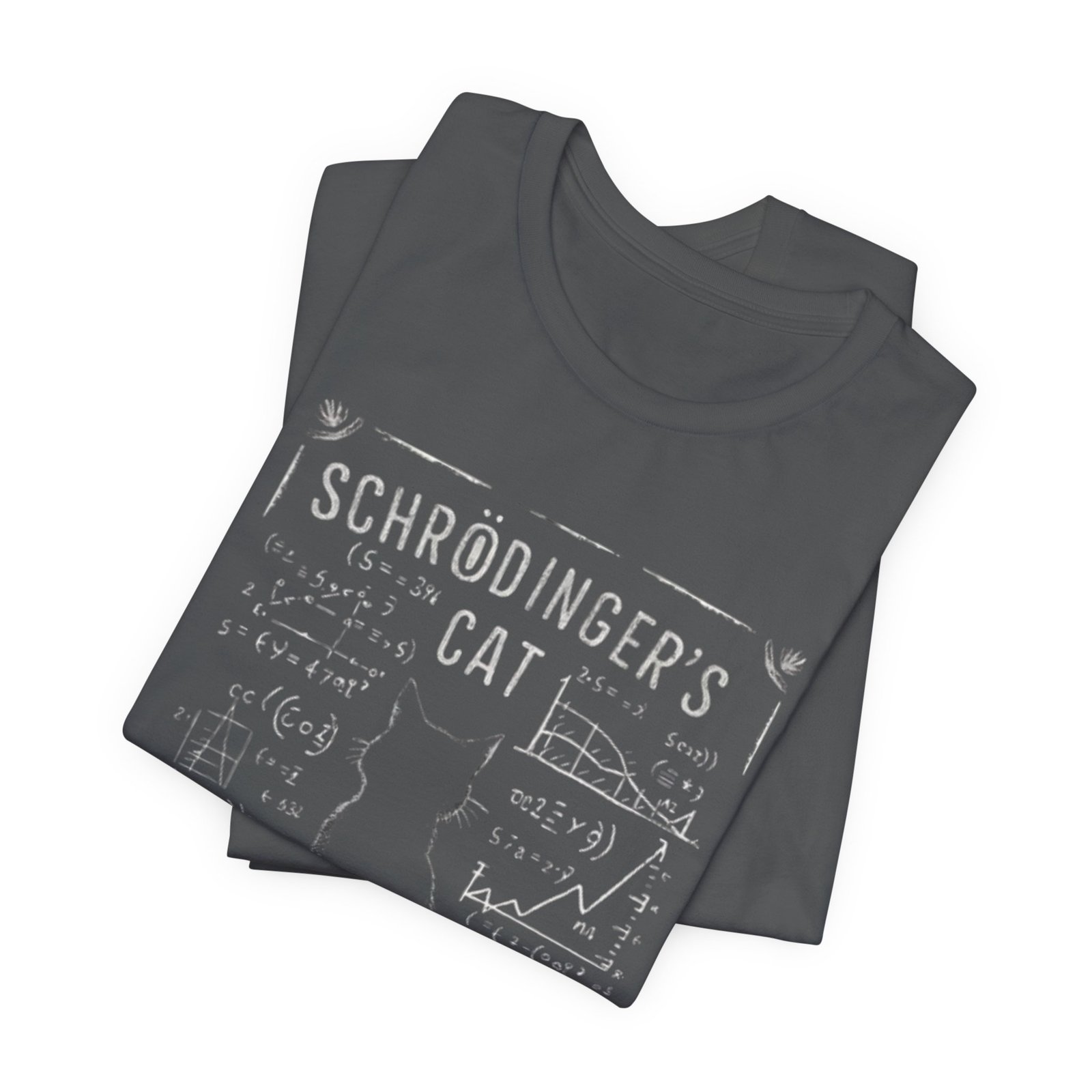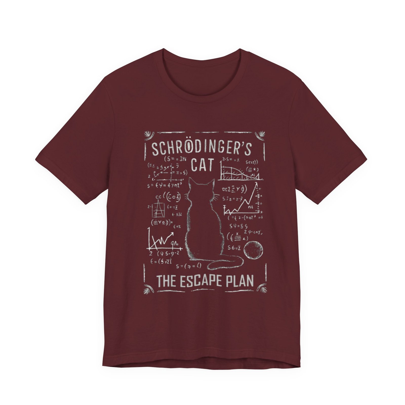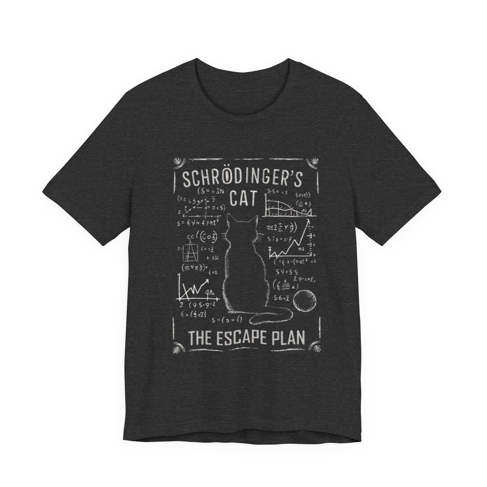 Soft, breathable tee with a geeky wink — a chalkboard-style design frames a silhouetted cat surrounded by equations and diagrams labeled “Schrödinger’s Cat: The Escape Plan.” It reads like a scientist’s doodle: playful, clever, and a little mysterious. The shirt drapes neatly with a retail fit and crew neckline, keeping the silhouette smart and easy to layer. Wear it to labs, study sessions, trivia nights, or low-key gatherings where a subtle laugh and a shared love of physics land well.