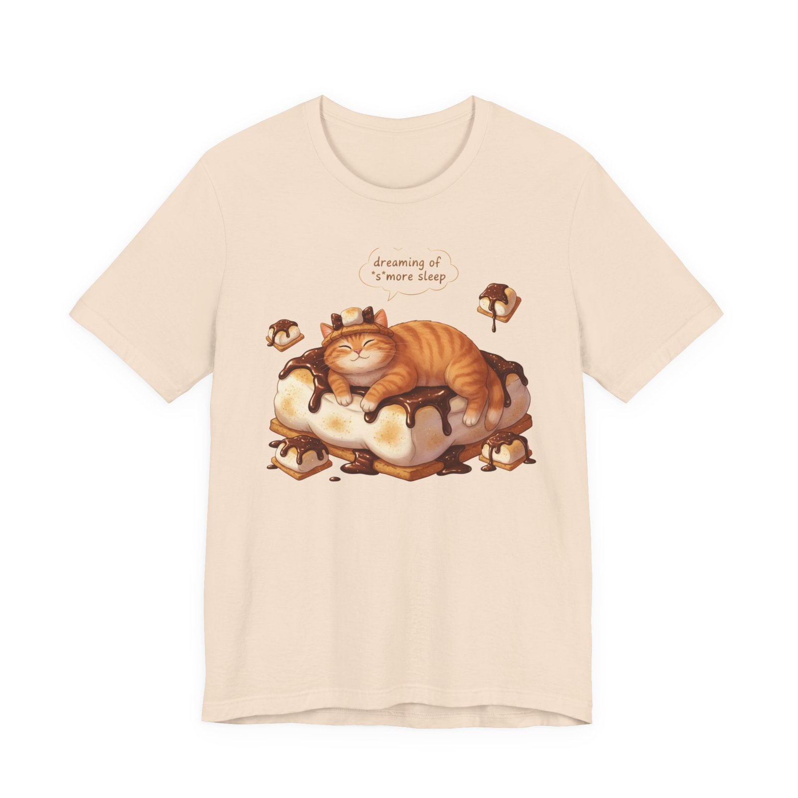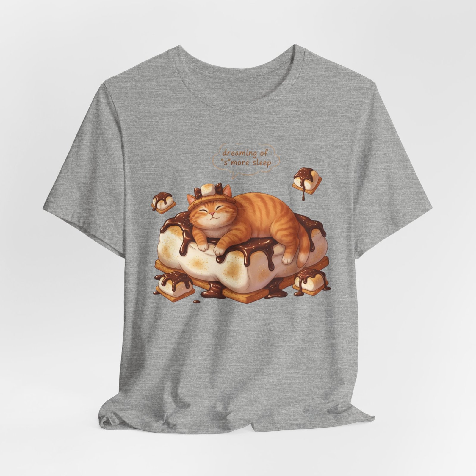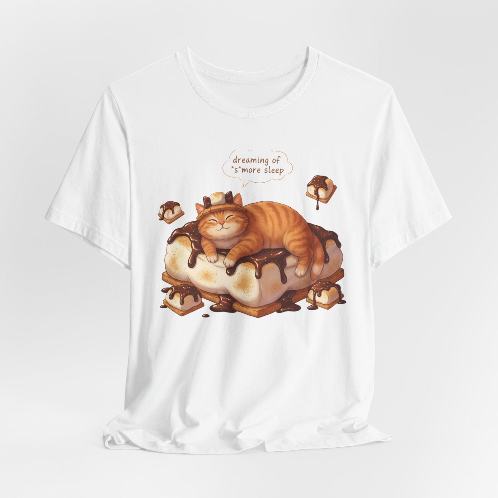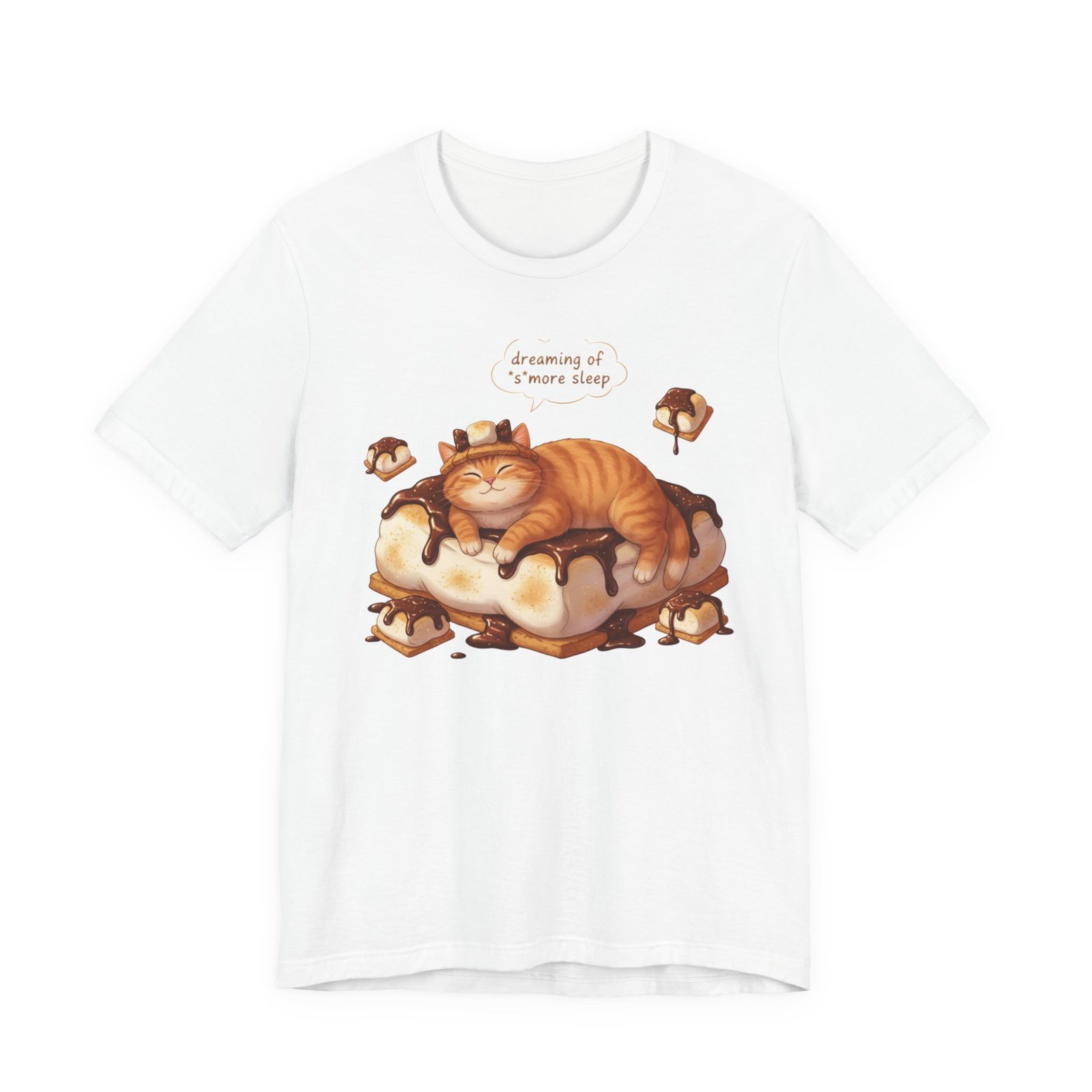 Sink into cozy afternoons with this lightweight cotton tee that wears like a warm, familiar hug. The front art shows a blissful orange tabby curled on a gooey marshmallow square, with drips of chocolate and tiny toasted bits floating around—an image that reads like a sleepy snack-daydream. Soft, breathable Airlume combed cotton keeps the shirt airy for lounging or layering. The crew neckline and retail fit keep the look tidy while letting the illustration take center stage. Wear it when you want a gentle, whimsical moment—reading by a window, sipping tea after a long walk, or sharing a quiet laugh with friends who love cats and sweet comfort.
