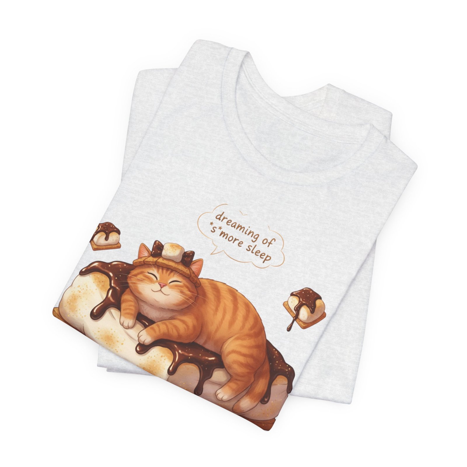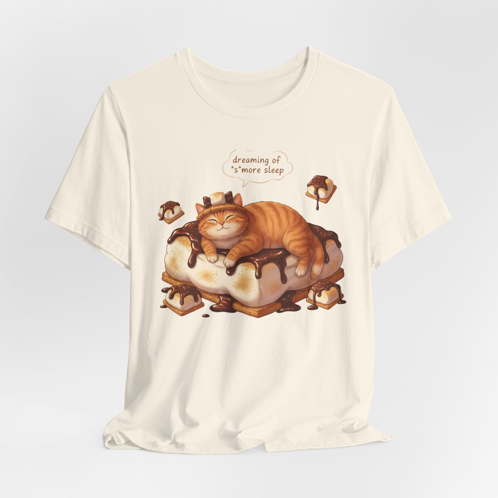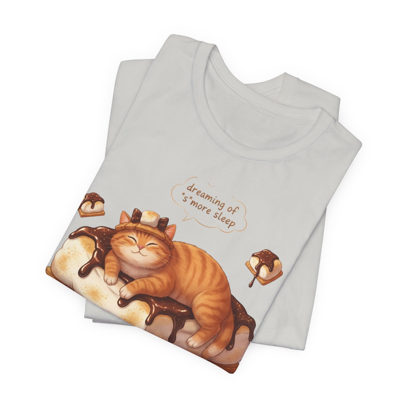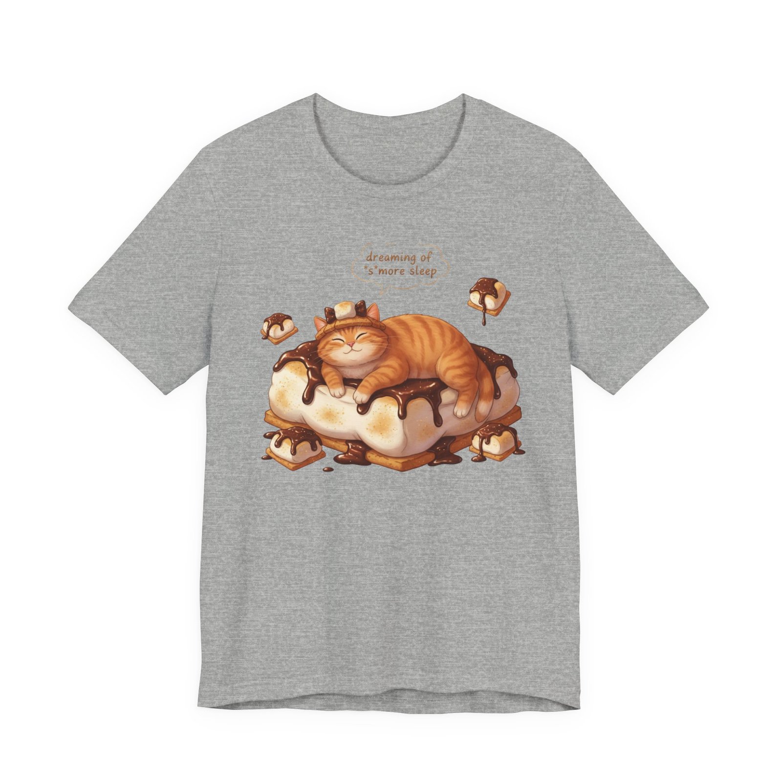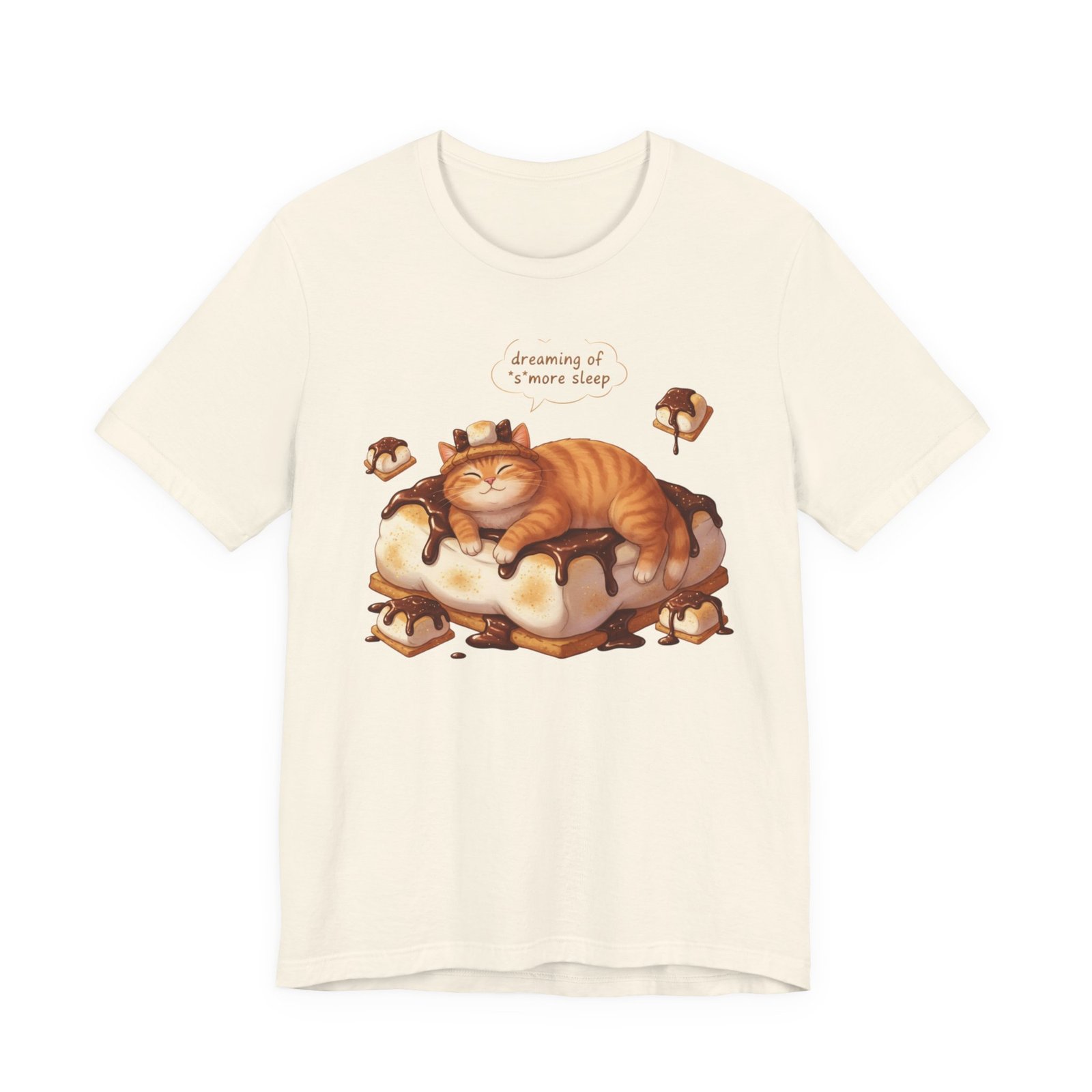 Sink into cozy afternoons with this lightweight cotton tee that wears like a warm, familiar hug. The front art shows a blissful orange tabby curled on a gooey marshmallow square, with drips of chocolate and tiny toasted bits floating around—an image that reads like a sleepy snack-daydream. Soft, breathable Airlume combed cotton keeps the shirt airy for lounging or layering. The crew neckline and retail fit keep the look tidy while letting the illustration take center stage. Wear it when you want a gentle, whimsical moment—reading by a window, sipping tea after a long walk, or sharing a quiet laugh with friends who love cats and sweet comfort.