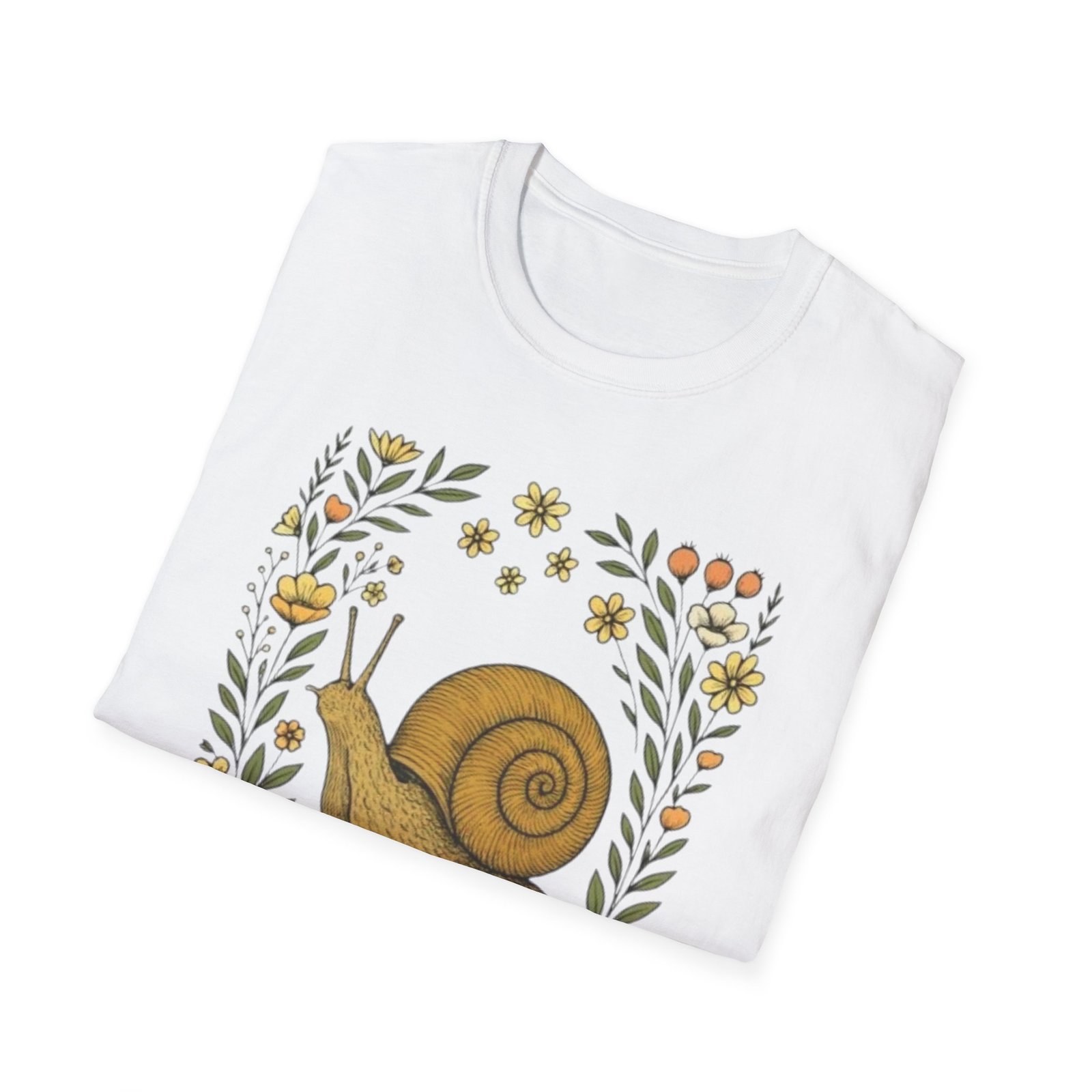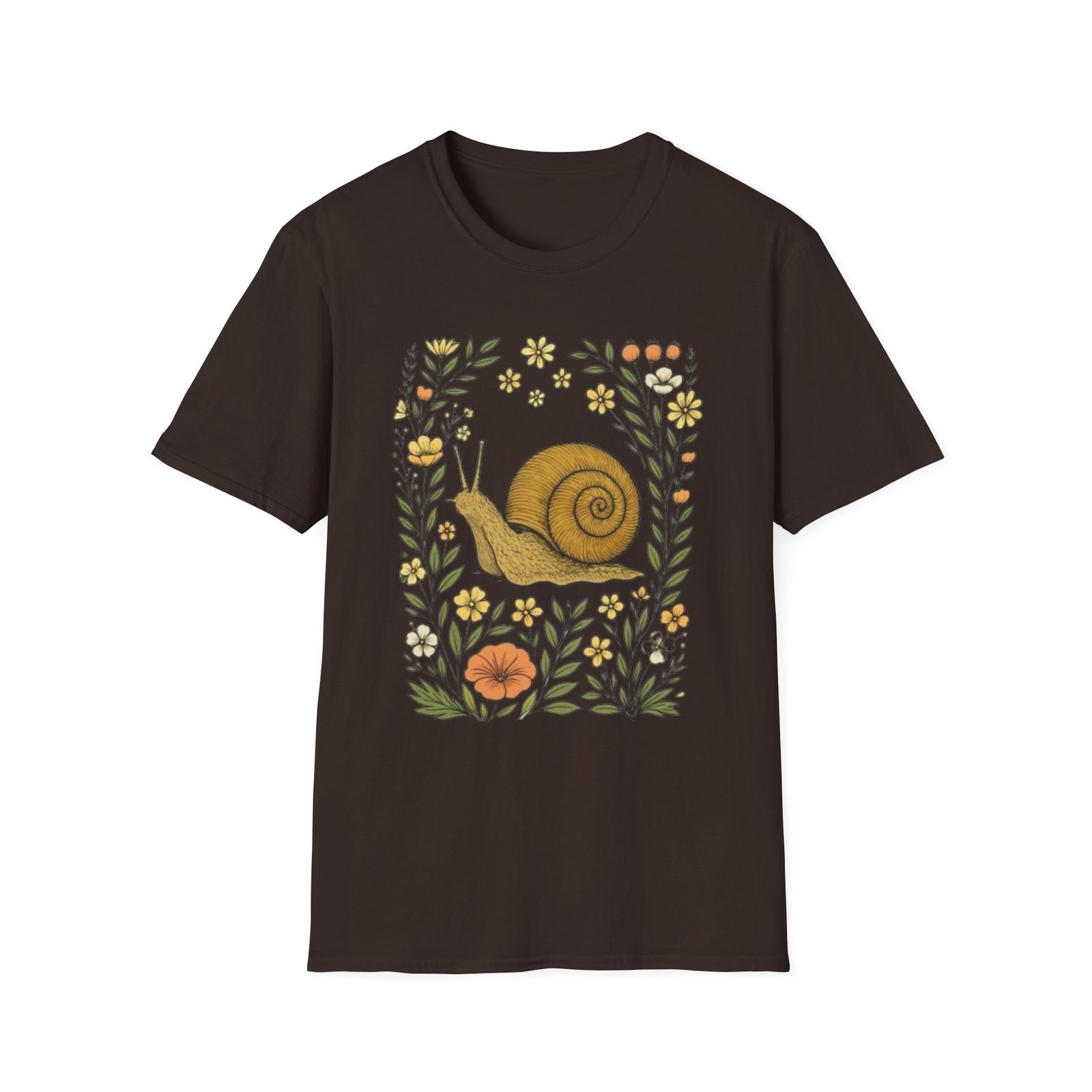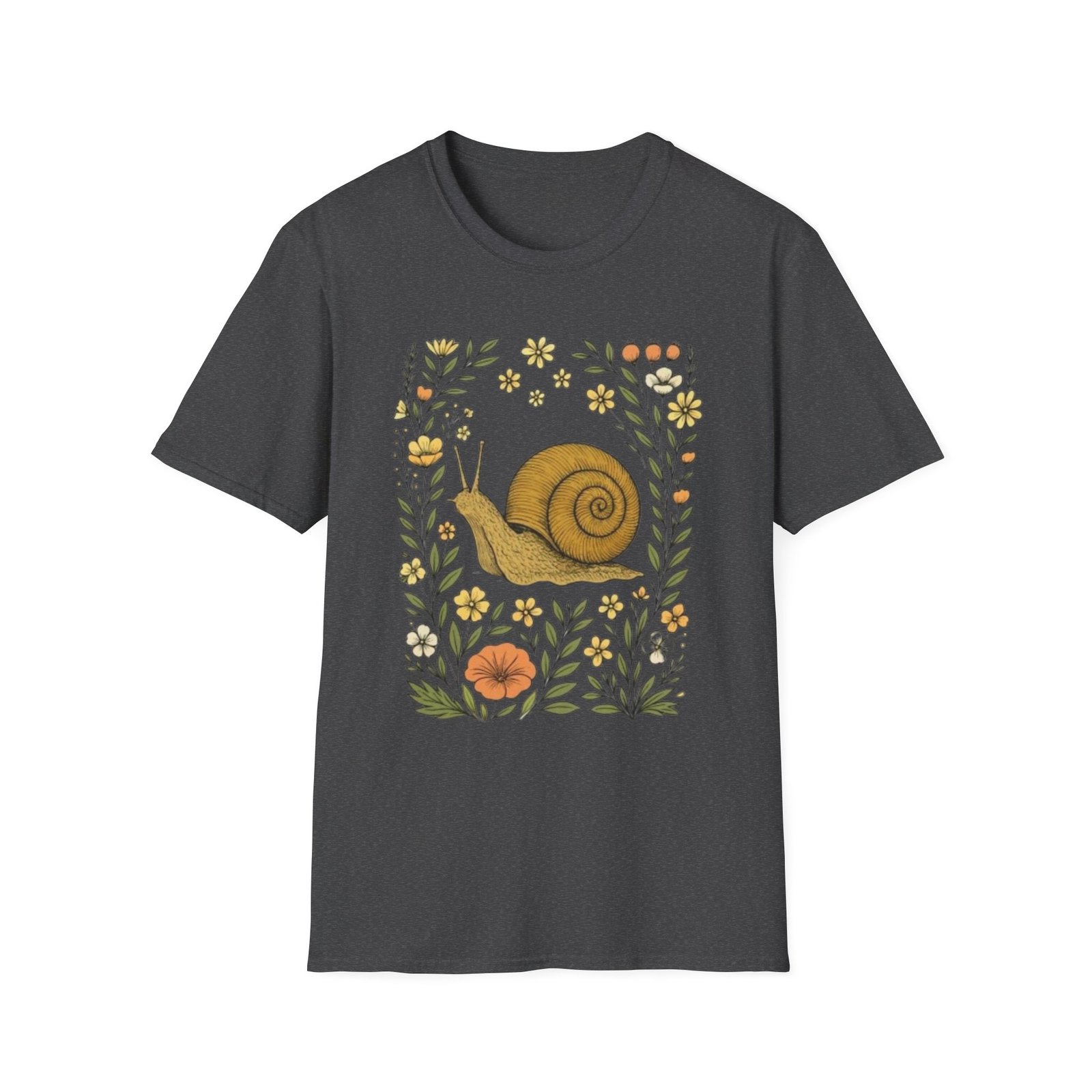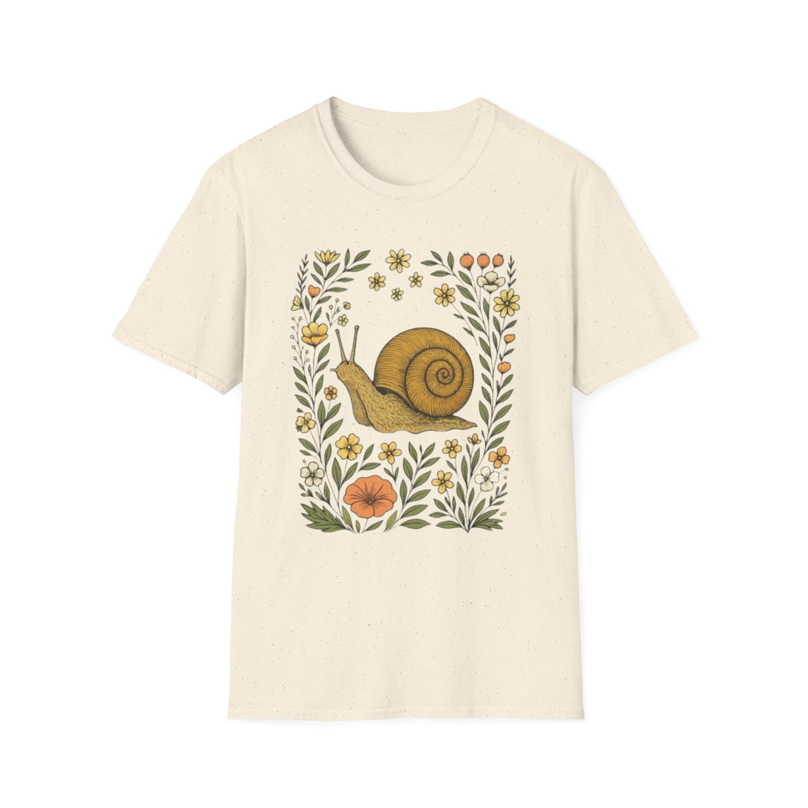 Lightweight and soft, this crew-neck tee carries a whimsical woodland print — a curled golden-brown snail framed by tiny mushrooms, leaves and wildflowers. It drapes cleanly with a classic fit and smooth hand-feel, so the art reads crisp whether layered under a jacket or worn on its own. The tear-away label and stable shoulder tape keep it comfortable all day. Wear it on slow mornings, nature walks, or anytime you want a quiet, charming reminder to slow down and notice the small things.