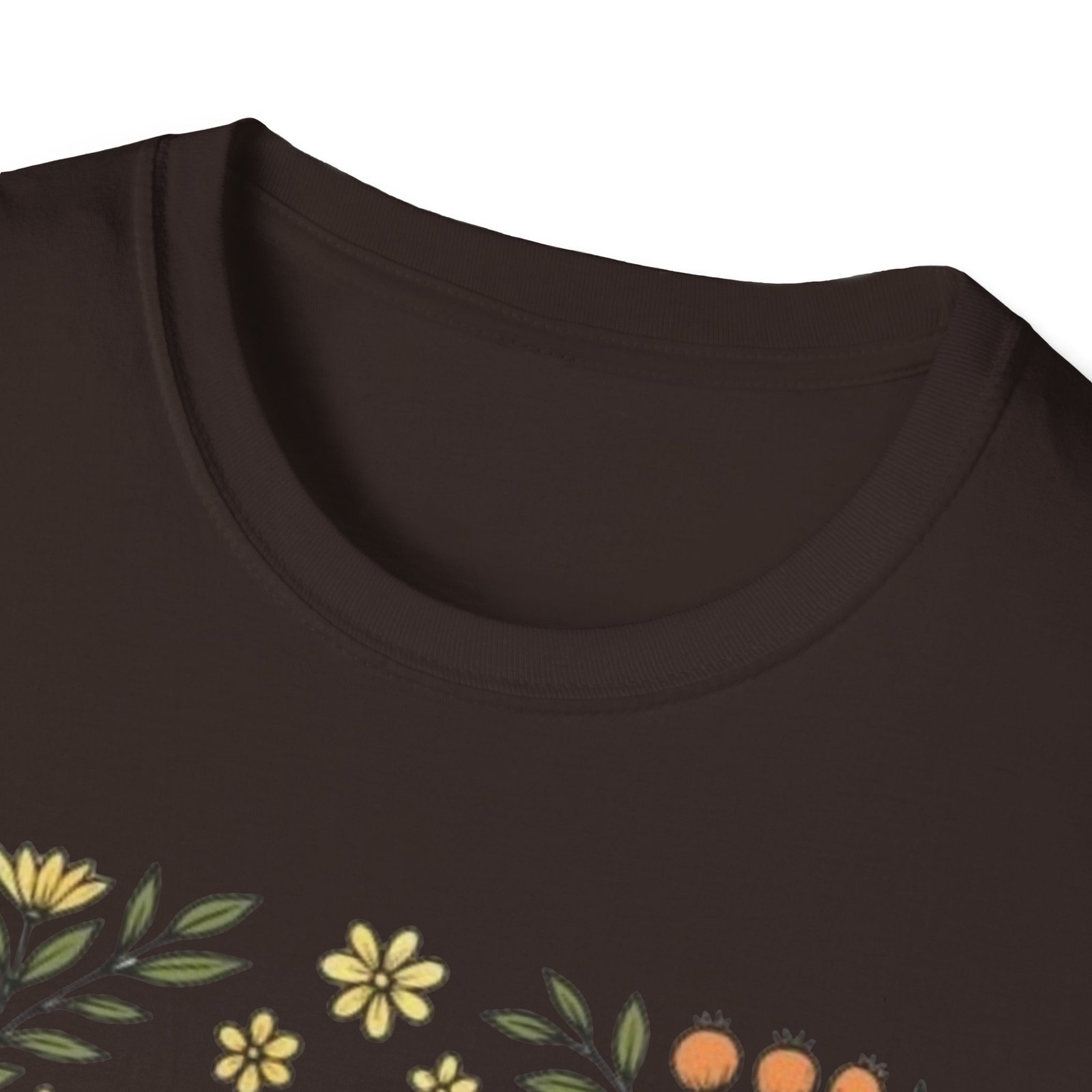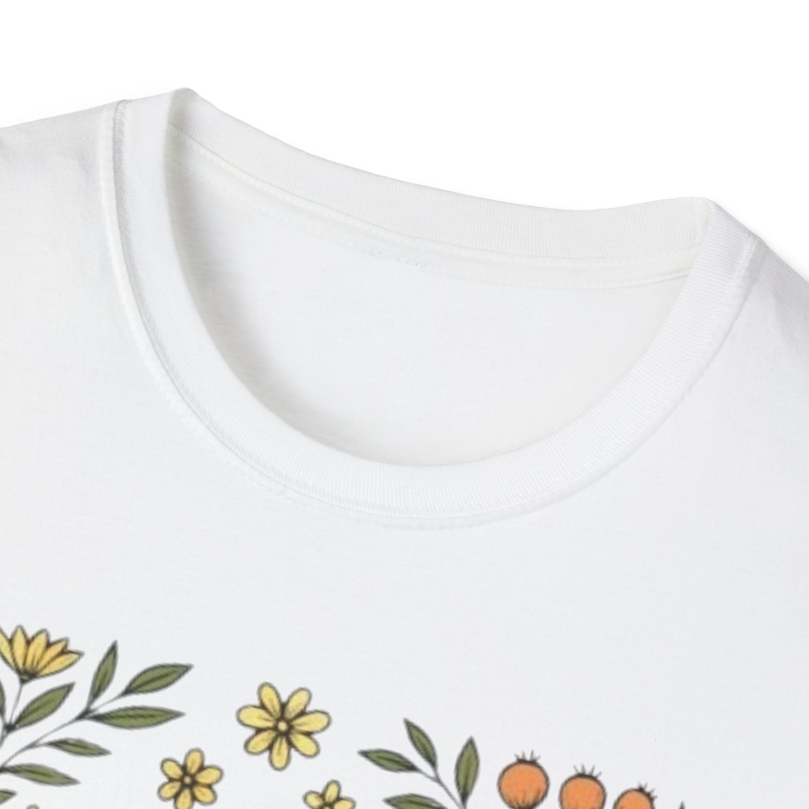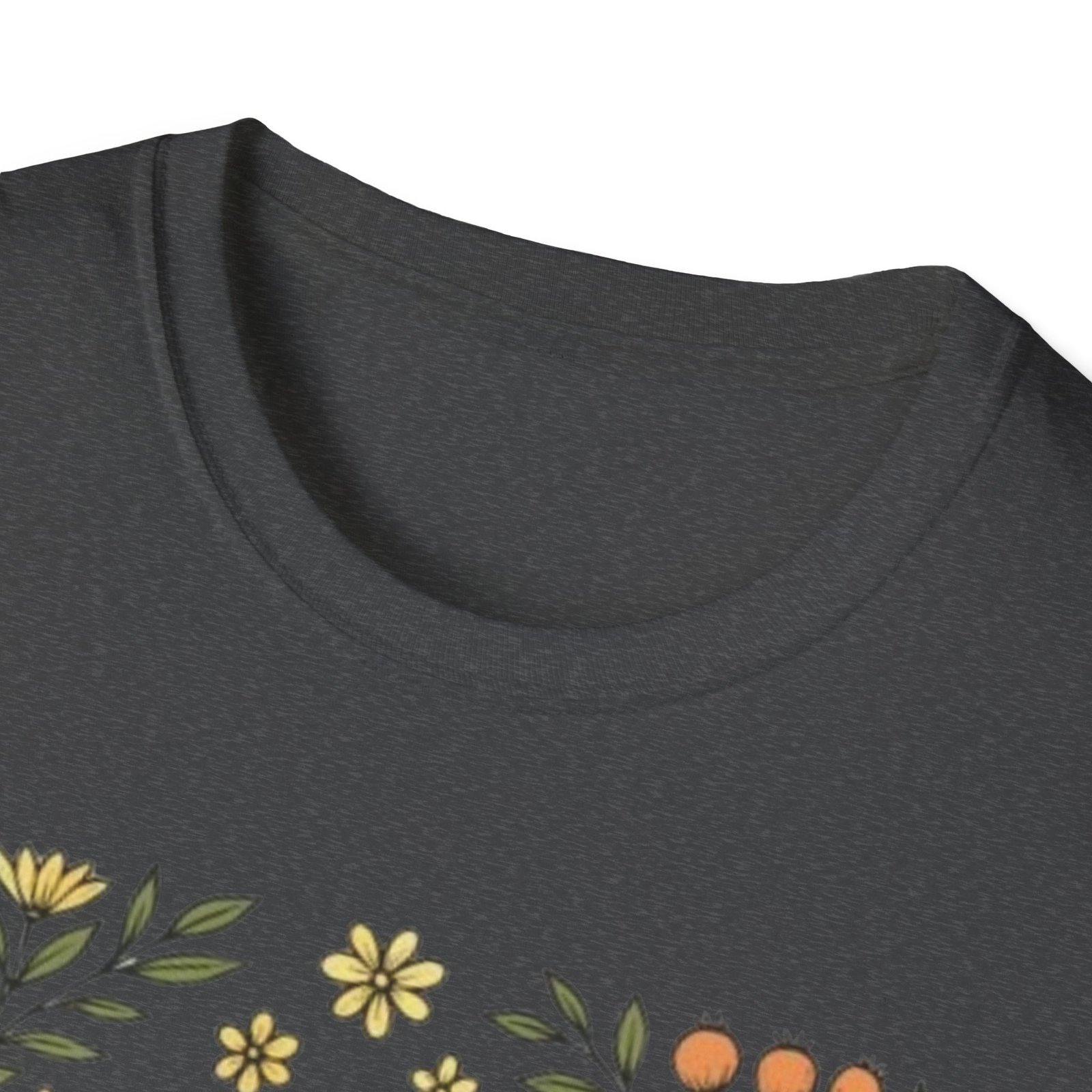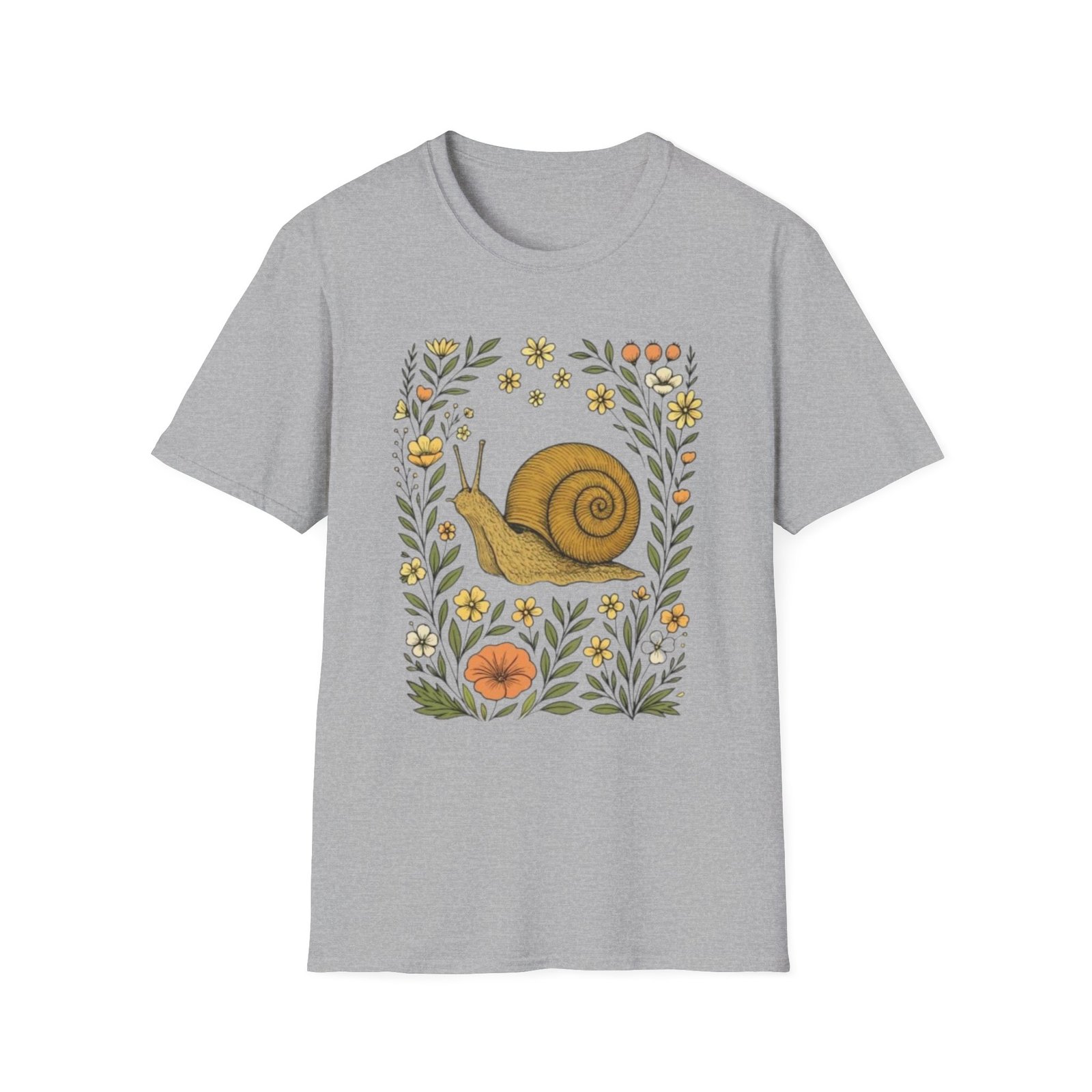 Lightweight and soft, this crew-neck tee carries a whimsical woodland print — a curled golden-brown snail framed by tiny mushrooms, leaves and wildflowers. It drapes cleanly with a classic fit and smooth hand-feel, so the art reads crisp whether layered under a jacket or worn on its own. The tear-away label and stable shoulder tape keep it comfortable all day. Wear it on slow mornings, nature walks, or anytime you want a quiet, charming reminder to slow down and notice the small things.
