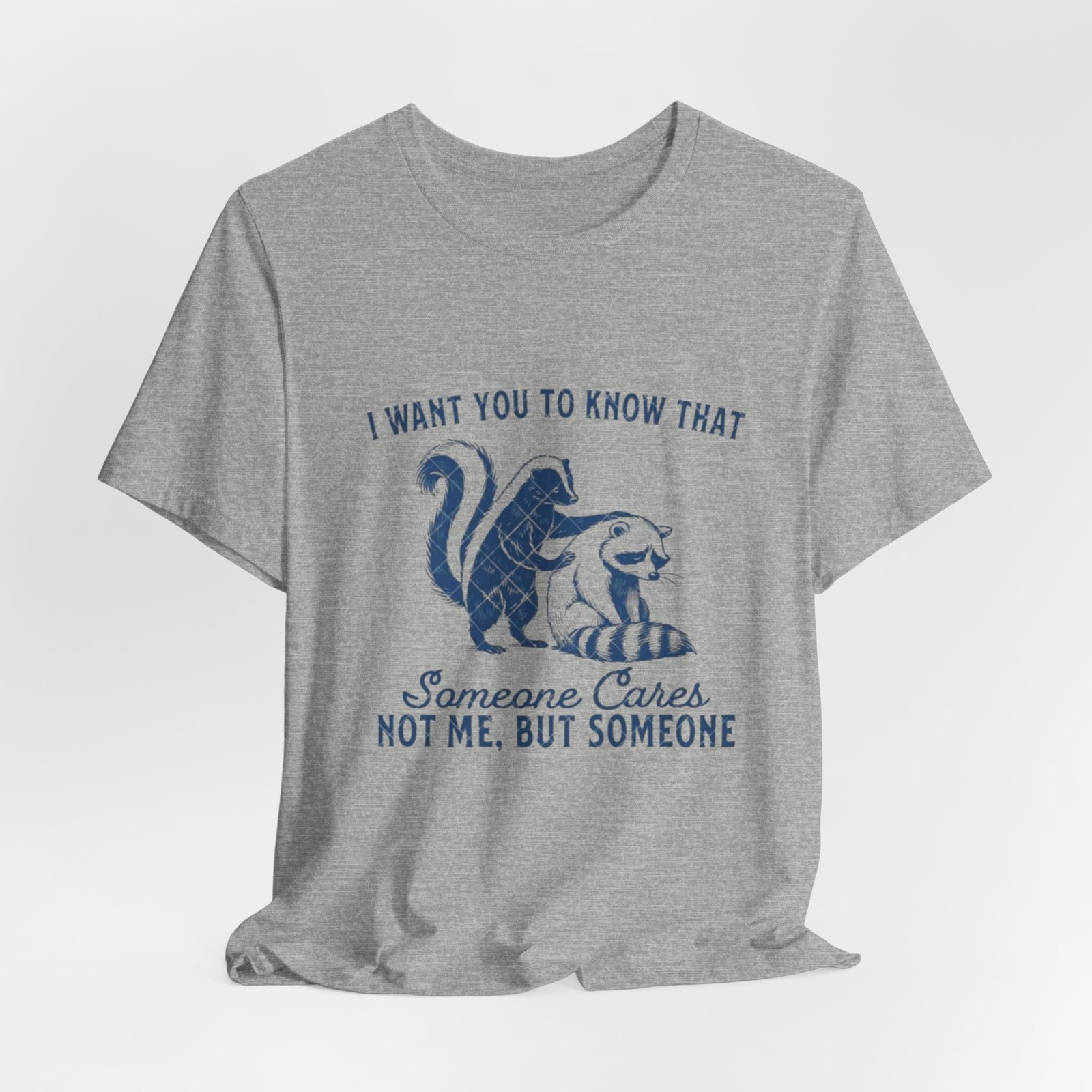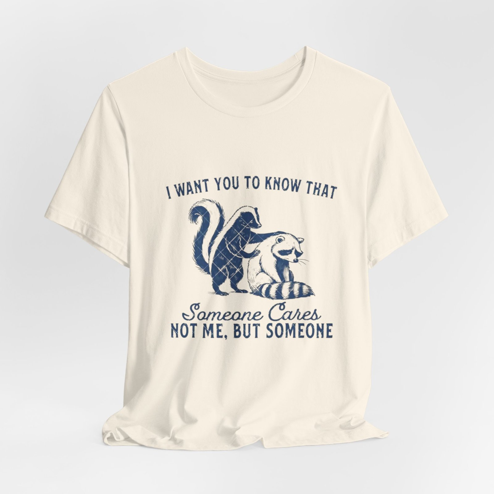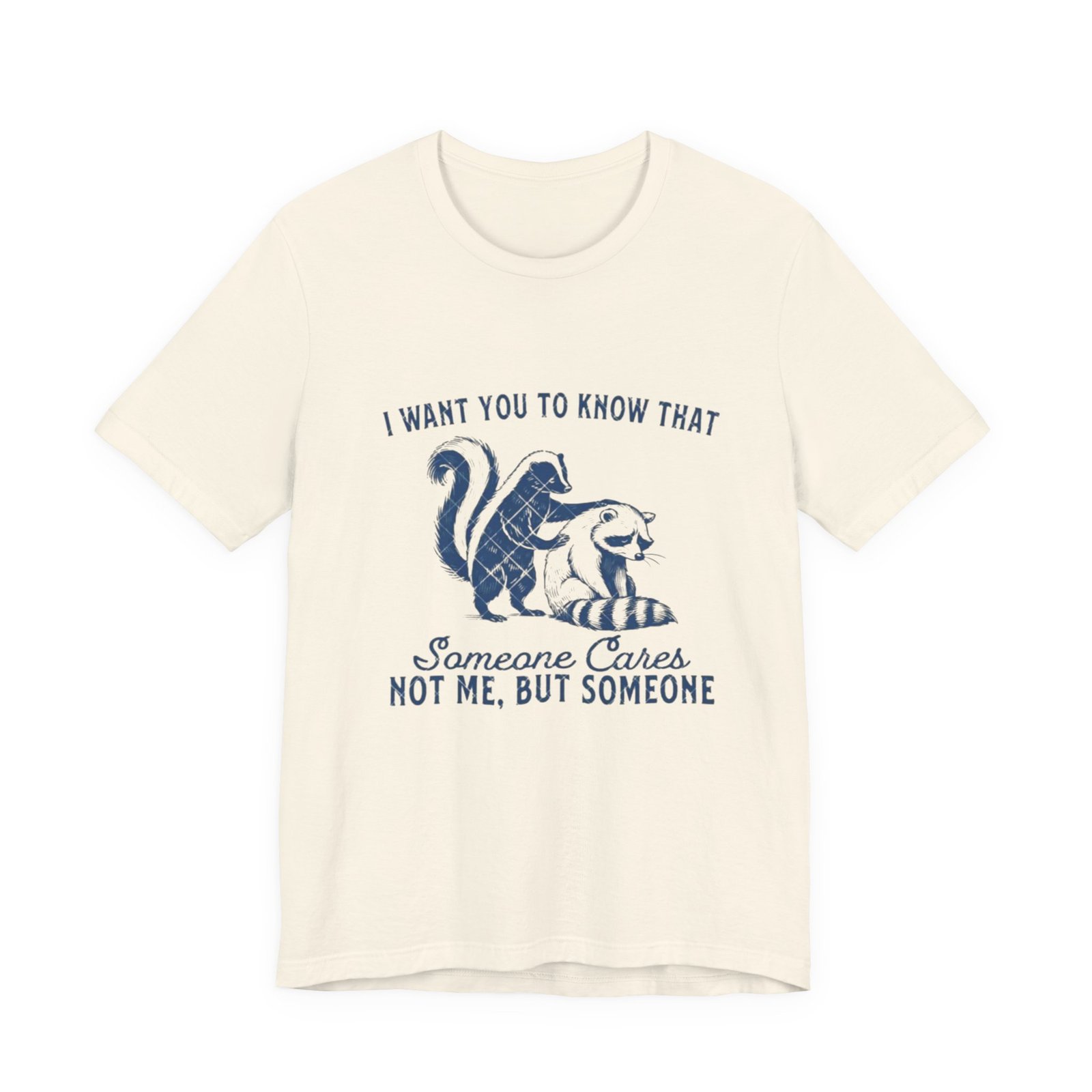 Soft, breathable tee with a gentle vintage-inspired design that quietly says someone cares. The front shows a hand-drawn skunk and cat nestled together with the phrase “I want you to know that someone cares. Not me, but someone,” rendered in textured navy ink for a lived-in, cozy look. Lightweight Airlume combed and ring-spun cotton keeps the fabric airy and comfortable. Thoughtful construction—side seams, shoulder tape and a ribbed knit collar—helps this shirt hold shape through many wears and washes. The printed neck label and sleeves use modern printing methods for crisp detail while the tear-away label keeps skin comfortable. Subtle, kind, and wearable: it slips easily into everyday wardrobes and small acts of comfort.