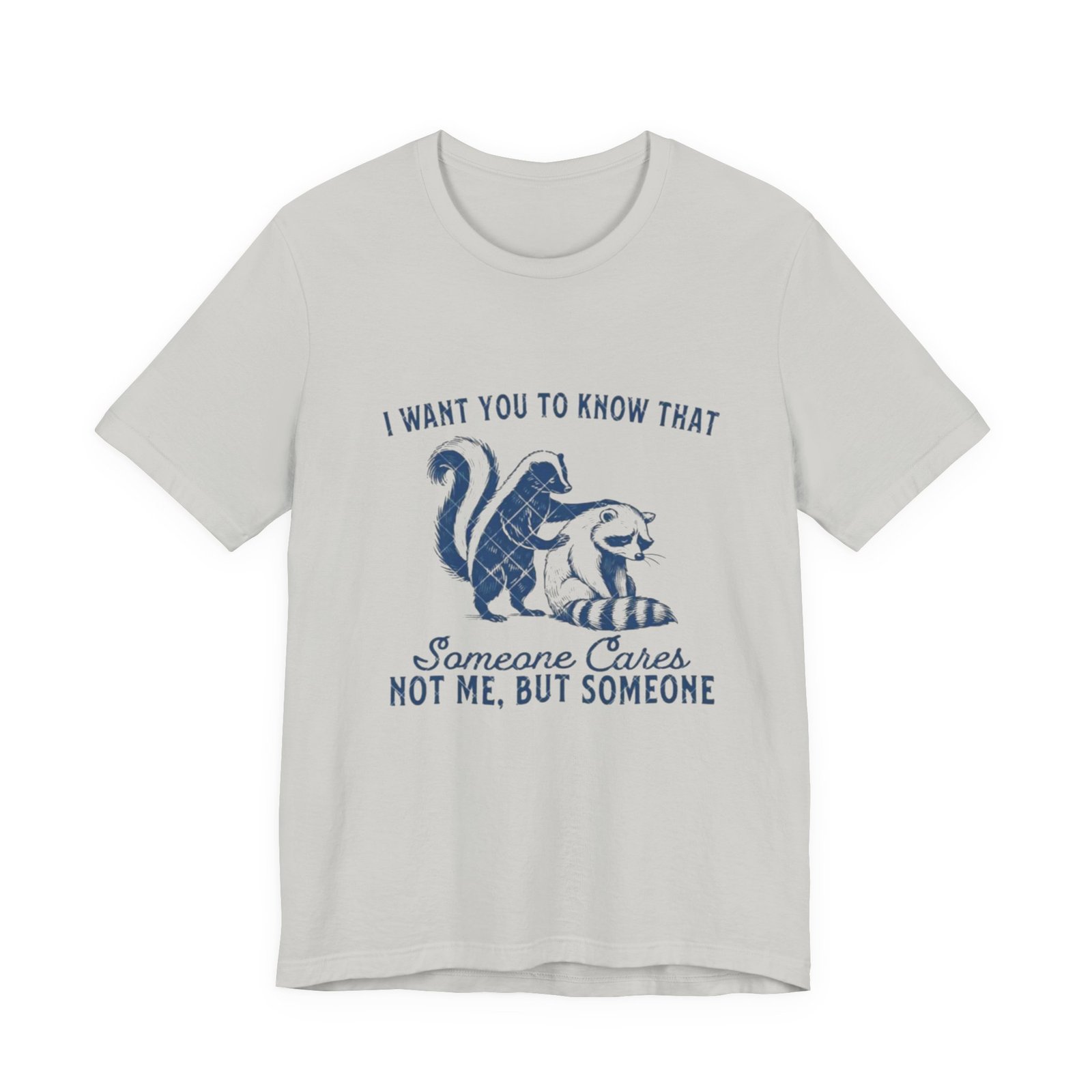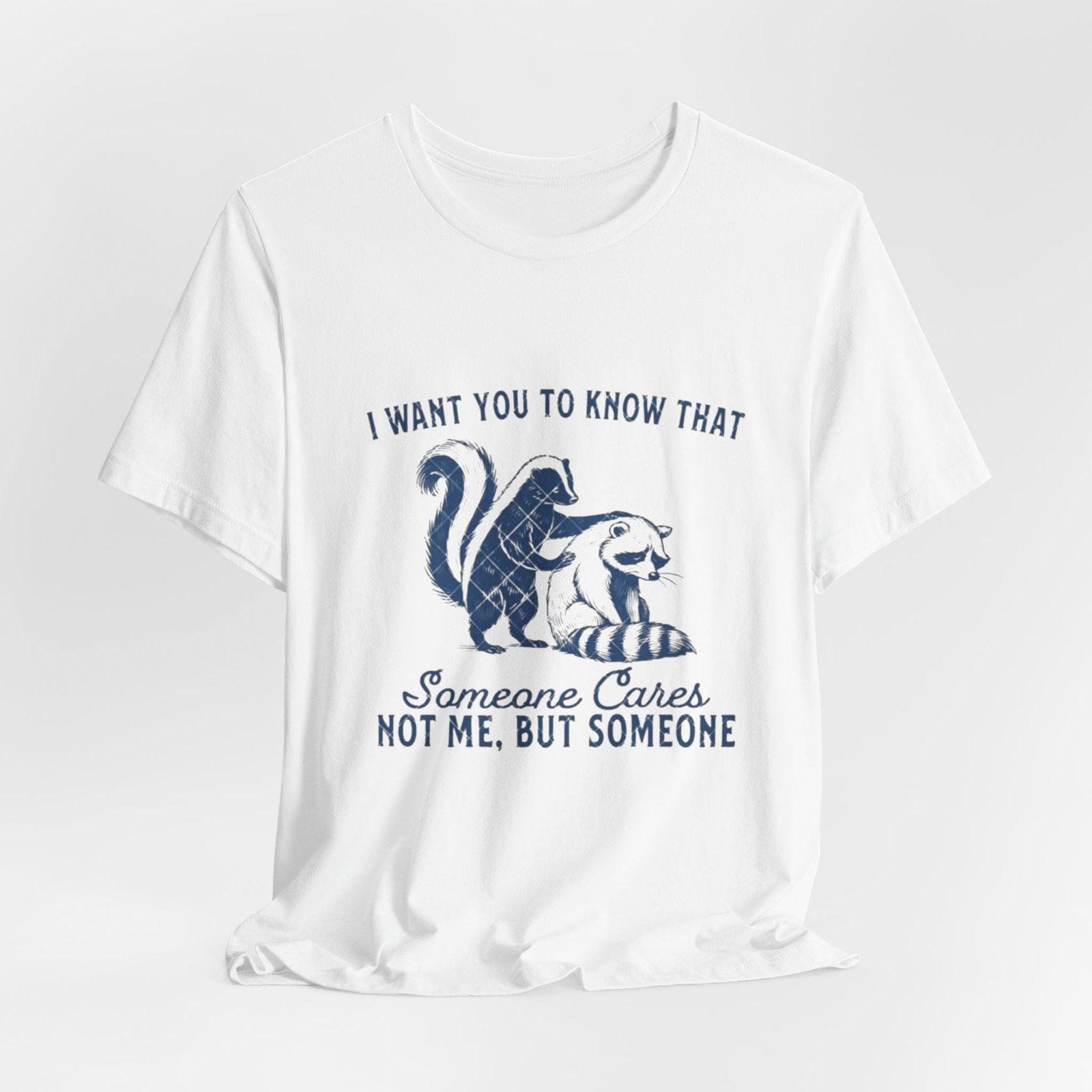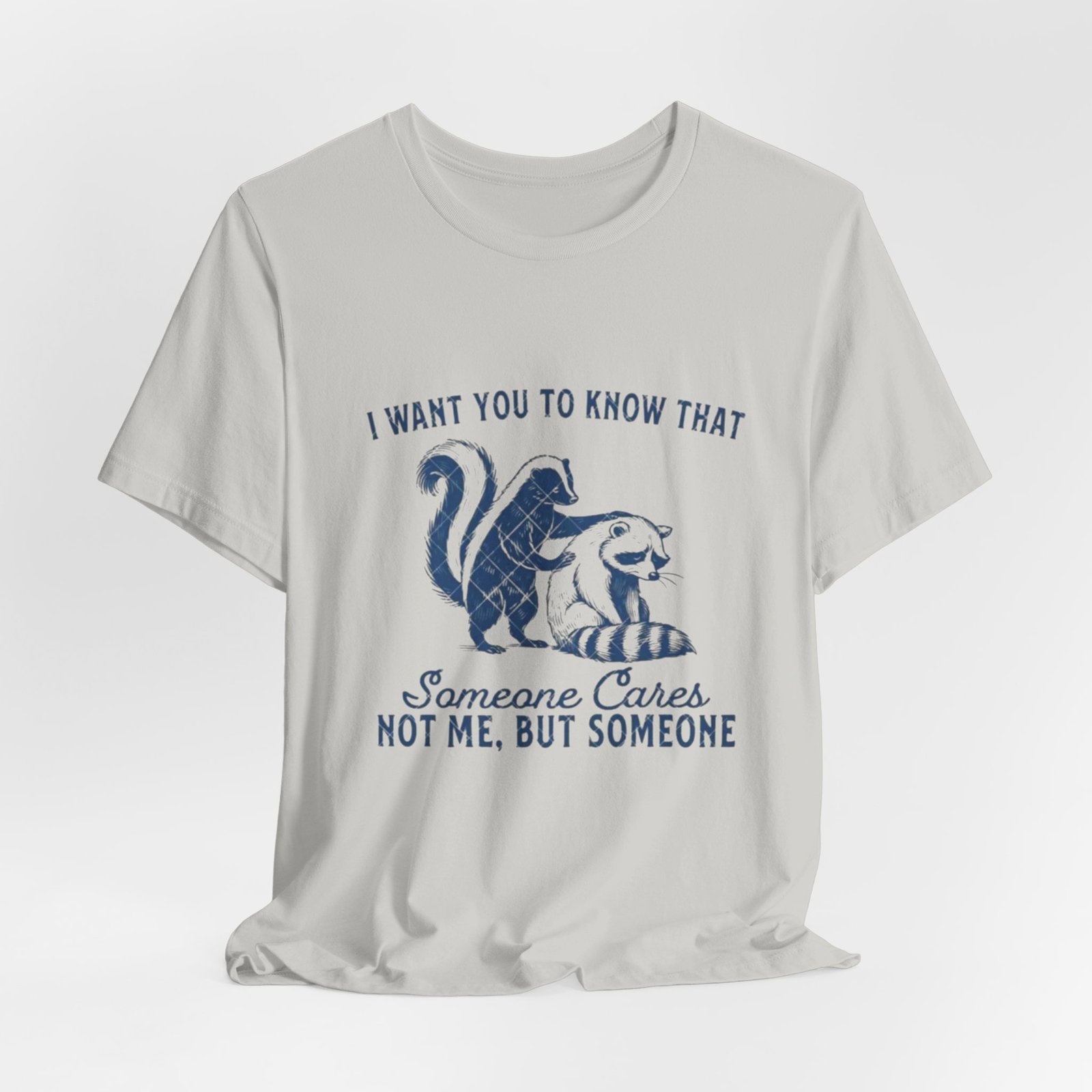 Soft, breathable tee with a gentle vintage-inspired design that quietly says someone cares. The front shows a hand-drawn skunk and cat nestled together with the phrase “I want you to know that someone cares. Not me, but someone,” rendered in textured navy ink for a lived-in, cozy look. Lightweight Airlume combed and ring-spun cotton keeps the fabric airy and comfortable. Thoughtful construction—side seams, shoulder tape and a ribbed knit collar—helps this shirt hold shape through many wears and washes. The printed neck label and sleeves use modern printing methods for crisp detail while the tear-away label keeps skin comfortable. Subtle, kind, and wearable: it slips easily into everyday wardrobes and small acts of comfort.