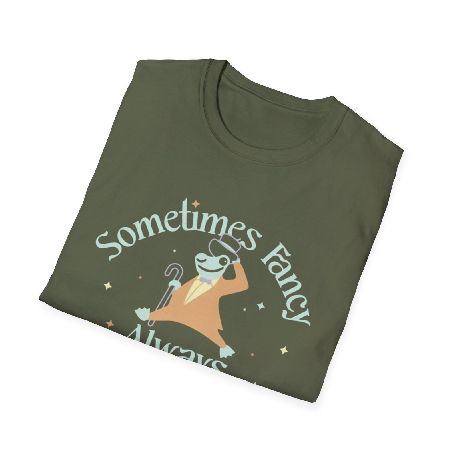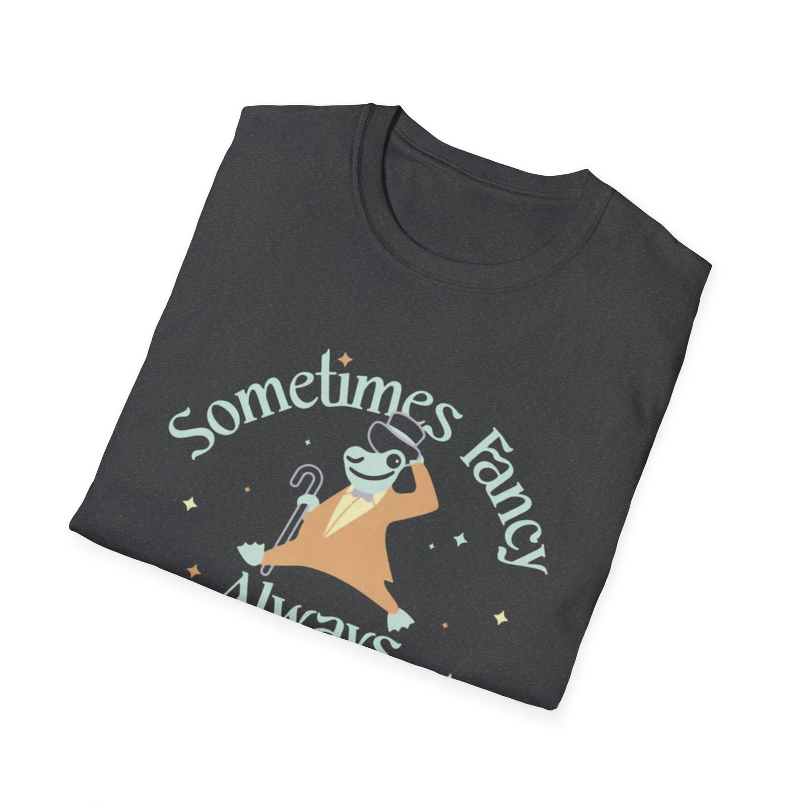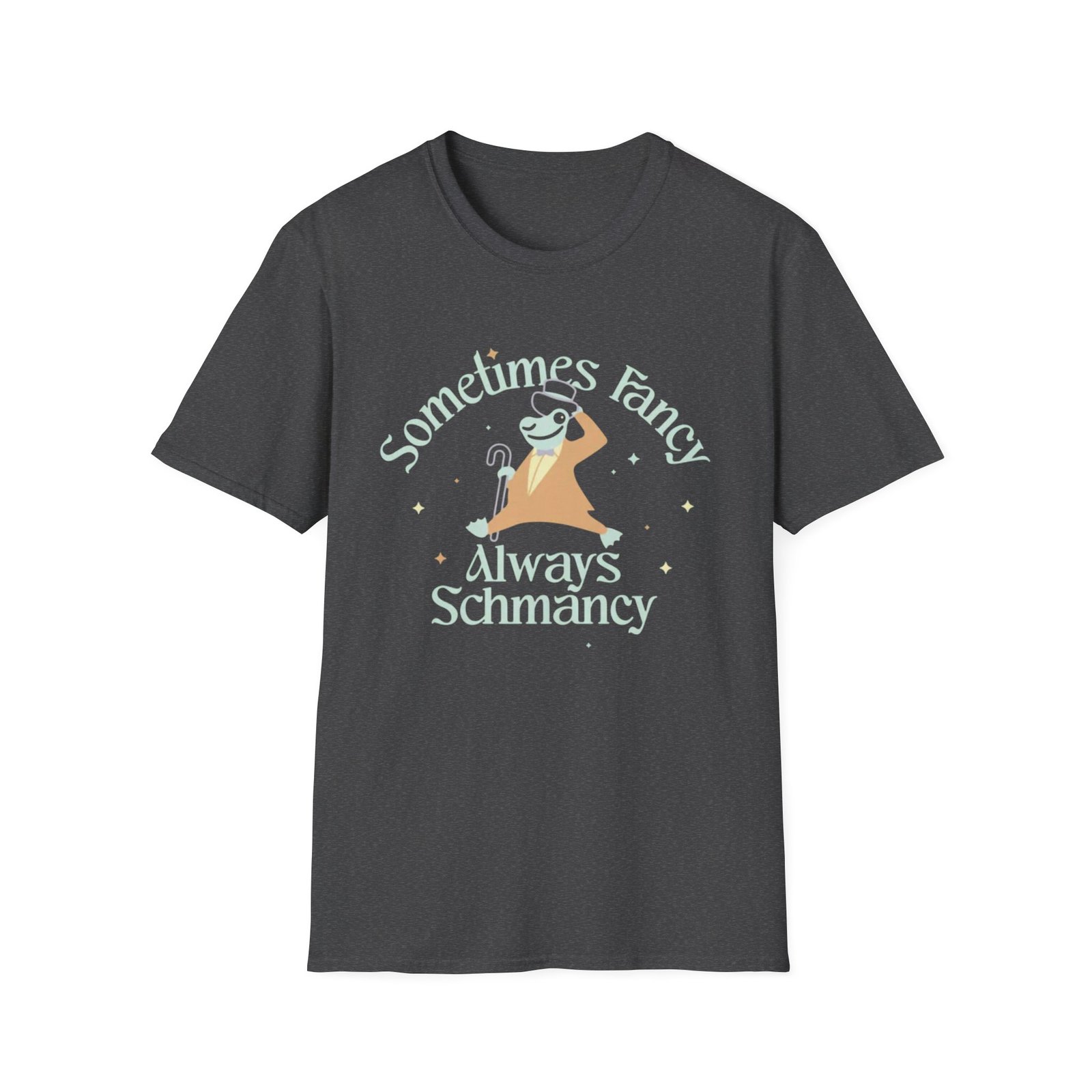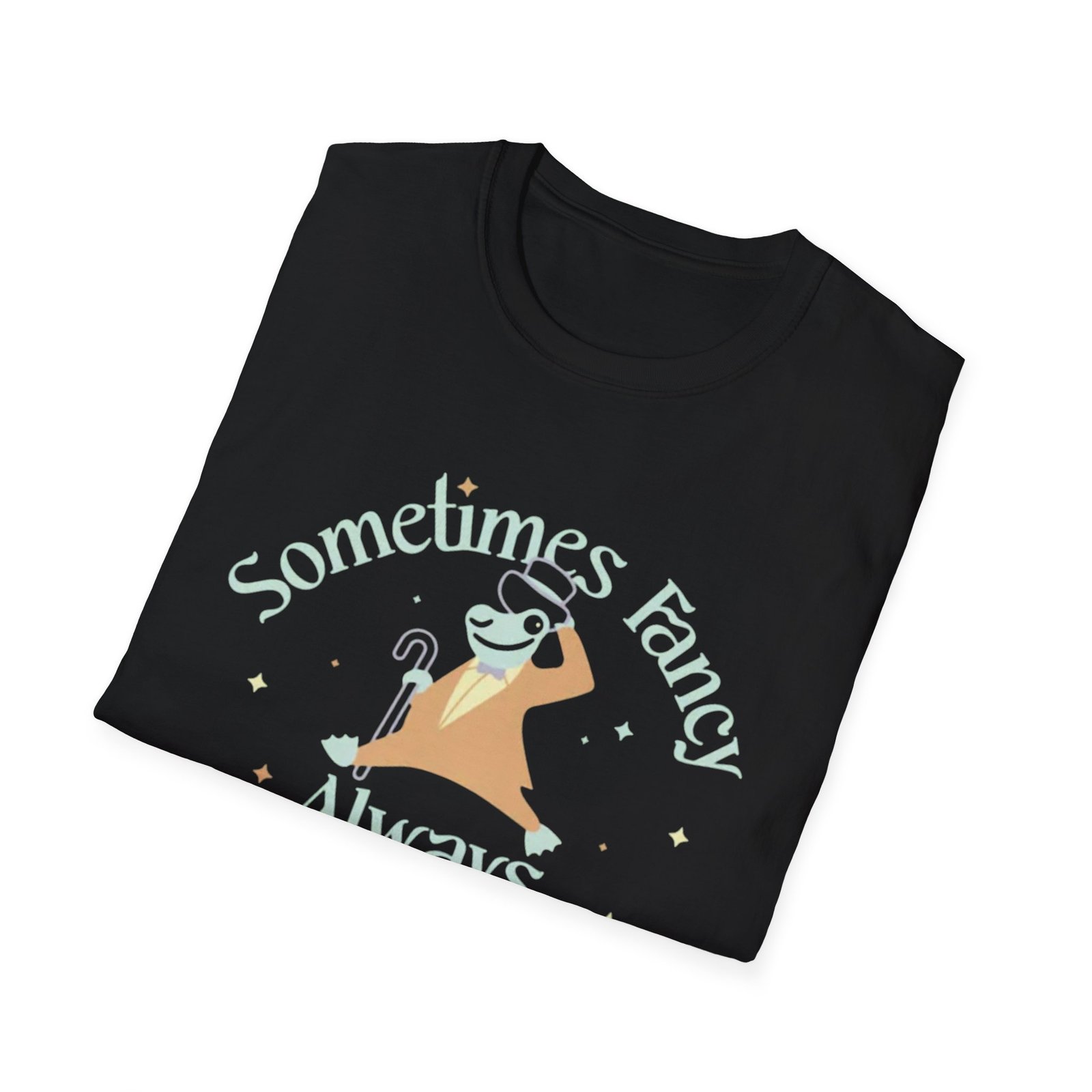 Soft, breathable tee with a cheeky, witchy vibe — a cozy staple that reads like a tiny personality statement. The front art shows a relaxed, smiling creature draped in a blanket and hat, framed by the hand-lettered phrase “Sometimes Fancy, Always Schmancy.” It feels playful and low-effort elegant: the muted palette and simple stars keep the look approachable while the crisp print pops on darker fabrics. Wear it when you want to be charming without trying too hard — for low-key hangouts, late-night tarot sessions, market strolls, or curling up with a good book.