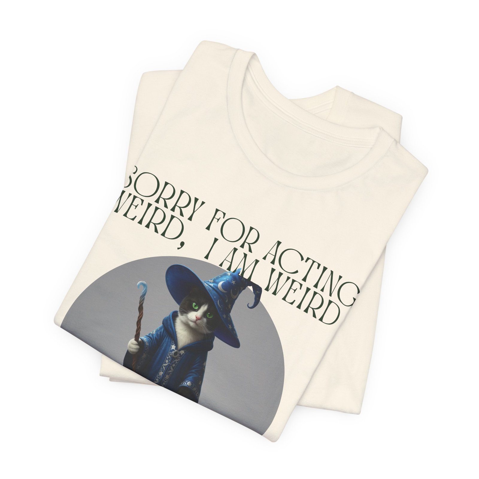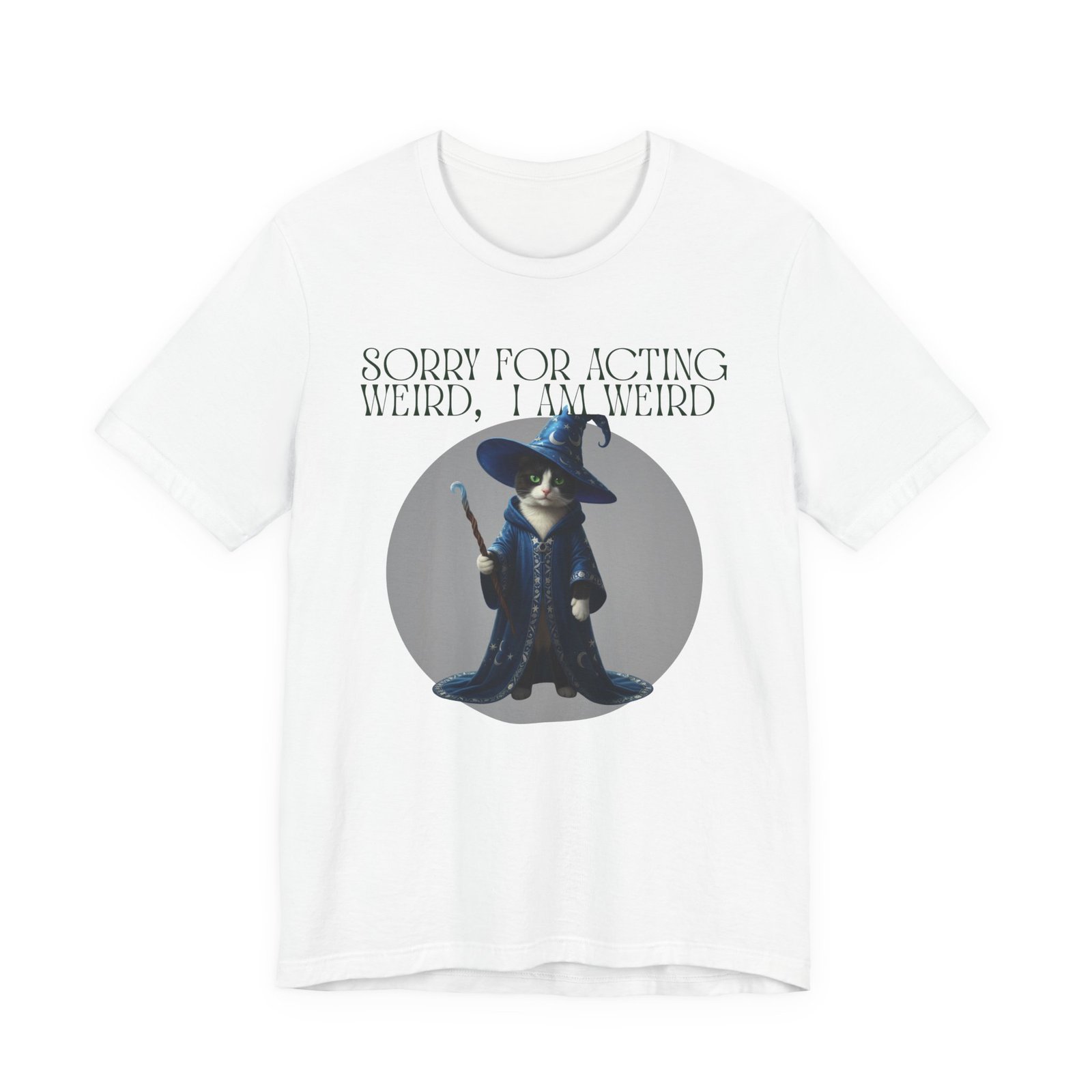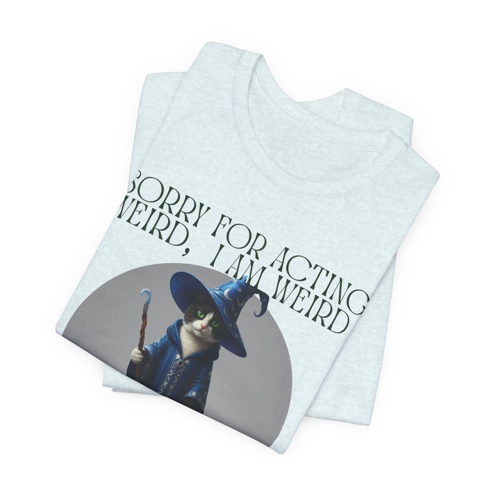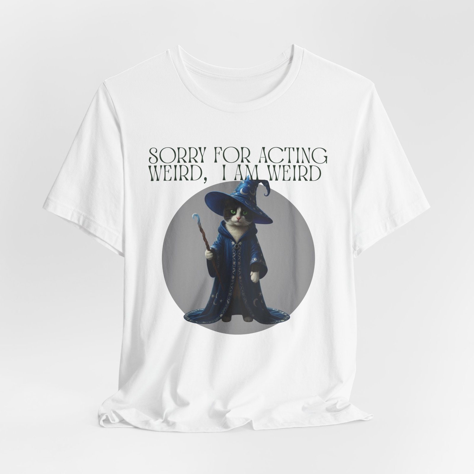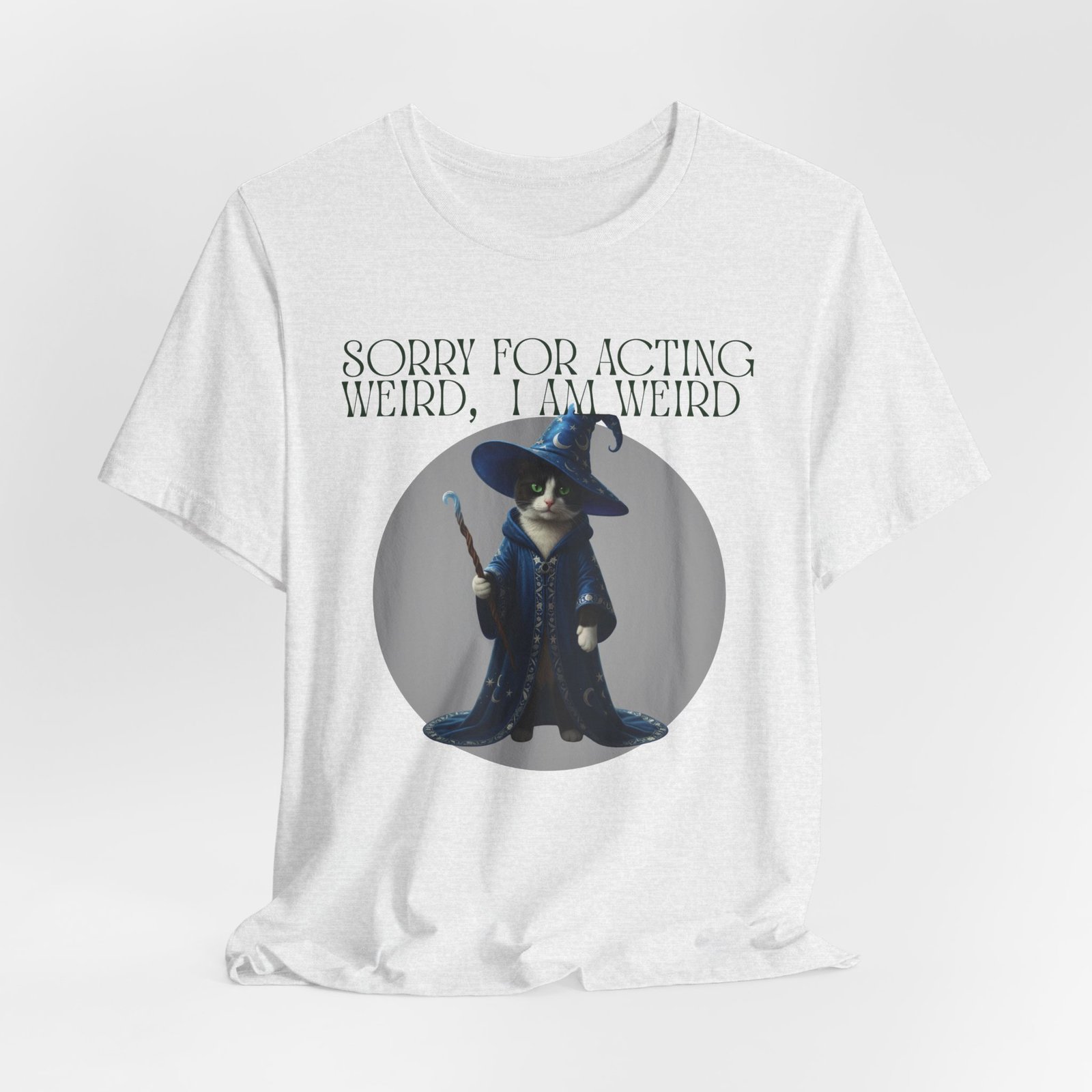 Soft, breathable cotton and a playful design come together in this casual tee made for folks who embrace their oddities. A whimsical wizard cat stands framed on the chest, beneath the cheeky line: “SORRY FOR ACTING WEIRD, I AM WEIRD.” It reads like a little secret handshake—subtle, silly, and sincere. Wear it to slow mornings with coffee, low-key game nights, or wandering through a weekend market. The crew neckline and retail fit keep the silhouette neat enough to layer under a jacket or wear on its own. Lightweight Airlume cotton keeps you cool while the ribbed collar and side seams hold the shape wash after wash. Ethically made blanks and a tear-away label mean comfort you can feel good about.