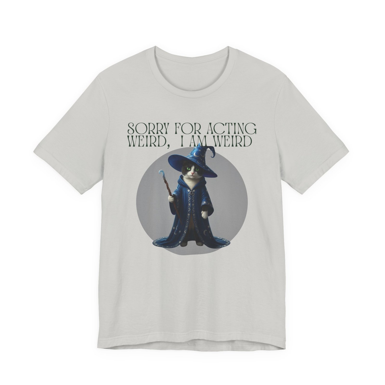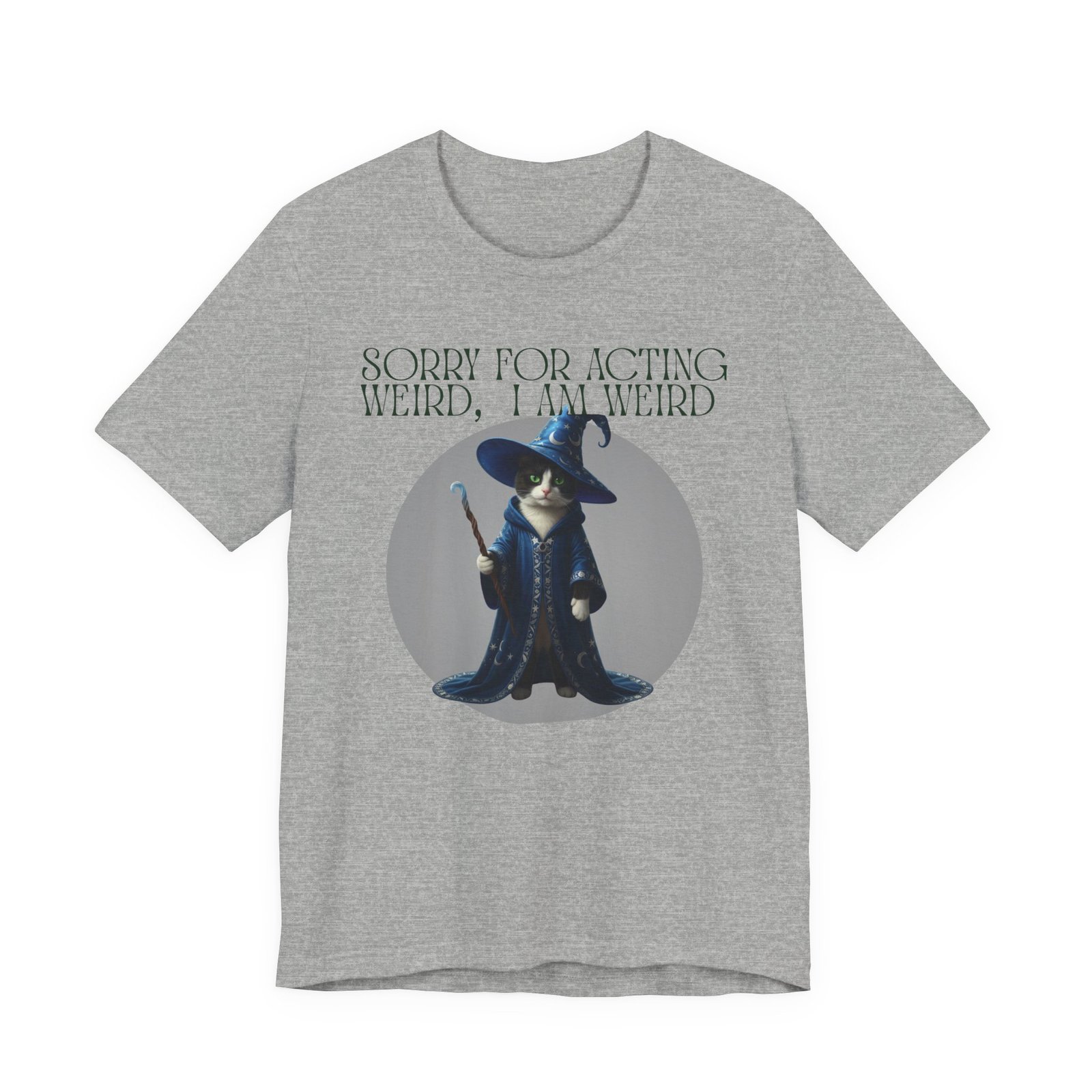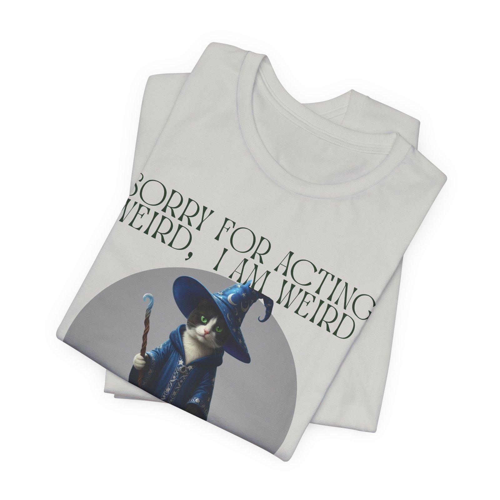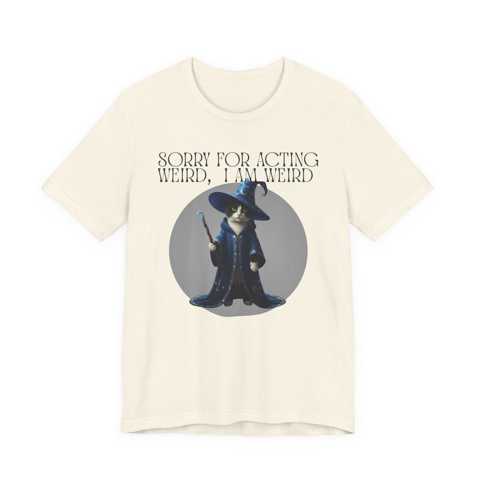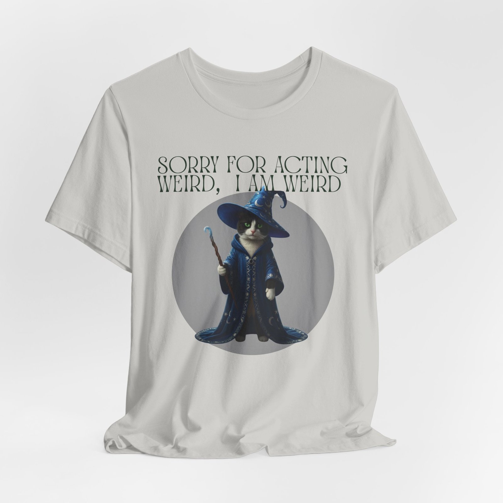 Soft, breathable cotton and a playful design come together in this casual tee made for folks who embrace their oddities. A whimsical wizard cat stands framed on the chest, beneath the cheeky line: “SORRY FOR ACTING WEIRD, I AM WEIRD.” It reads like a little secret handshake—subtle, silly, and sincere. Wear it to slow mornings with coffee, low-key game nights, or wandering through a weekend market. The crew neckline and retail fit keep the silhouette neat enough to layer under a jacket or wear on its own. Lightweight Airlume cotton keeps you cool while the ribbed collar and side seams hold the shape wash after wash. Ethically made blanks and a tear-away label mean comfort you can feel good about.