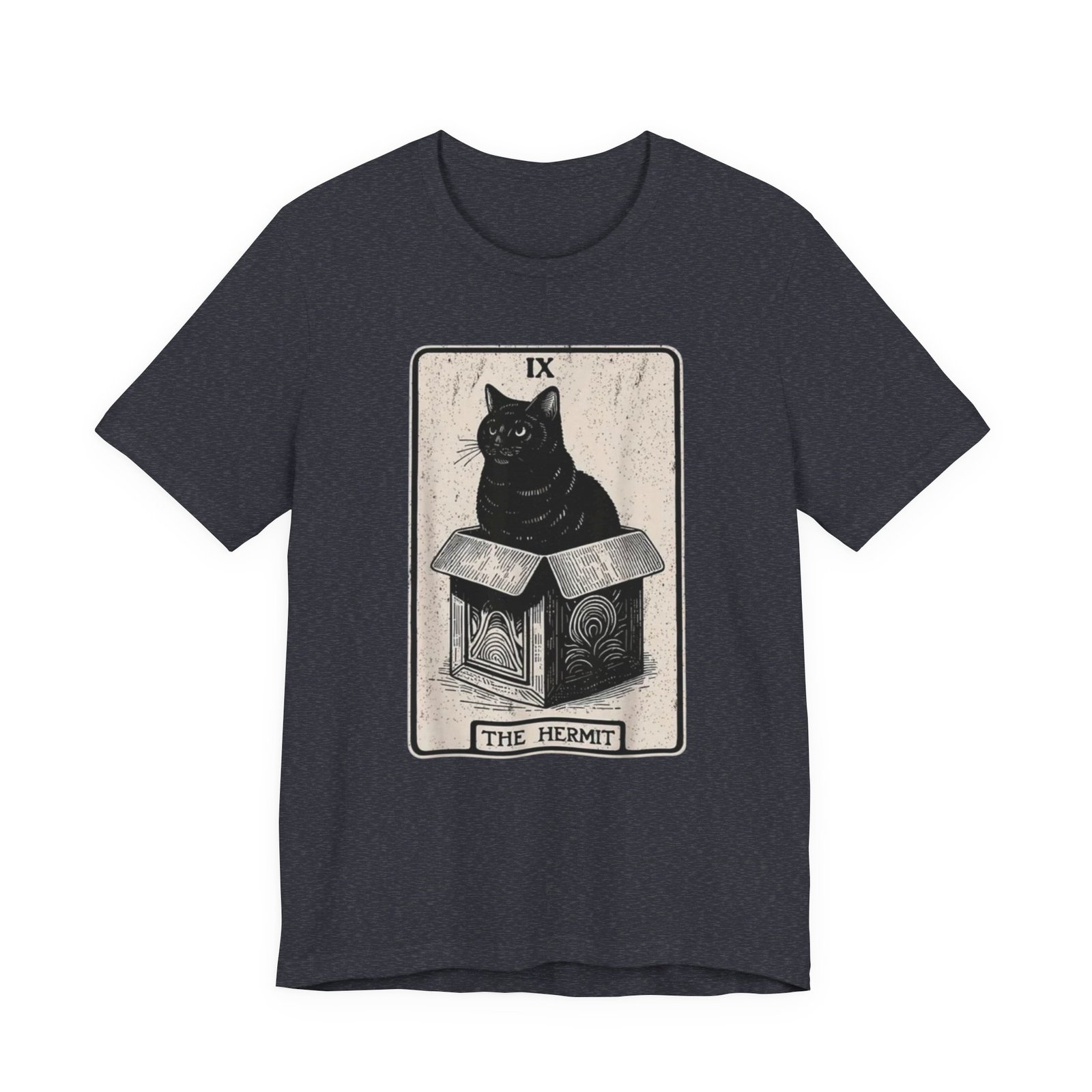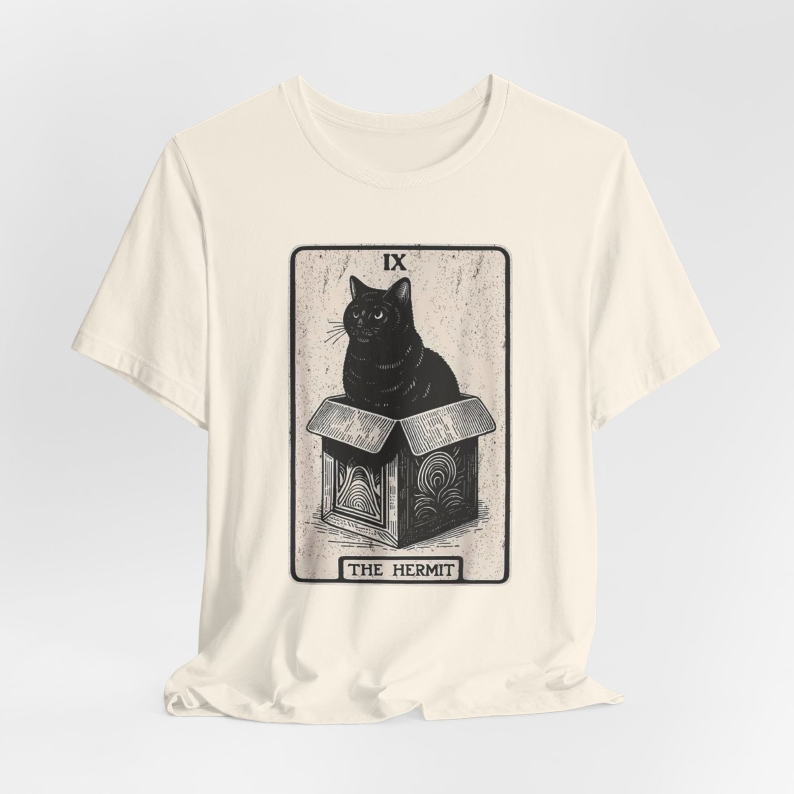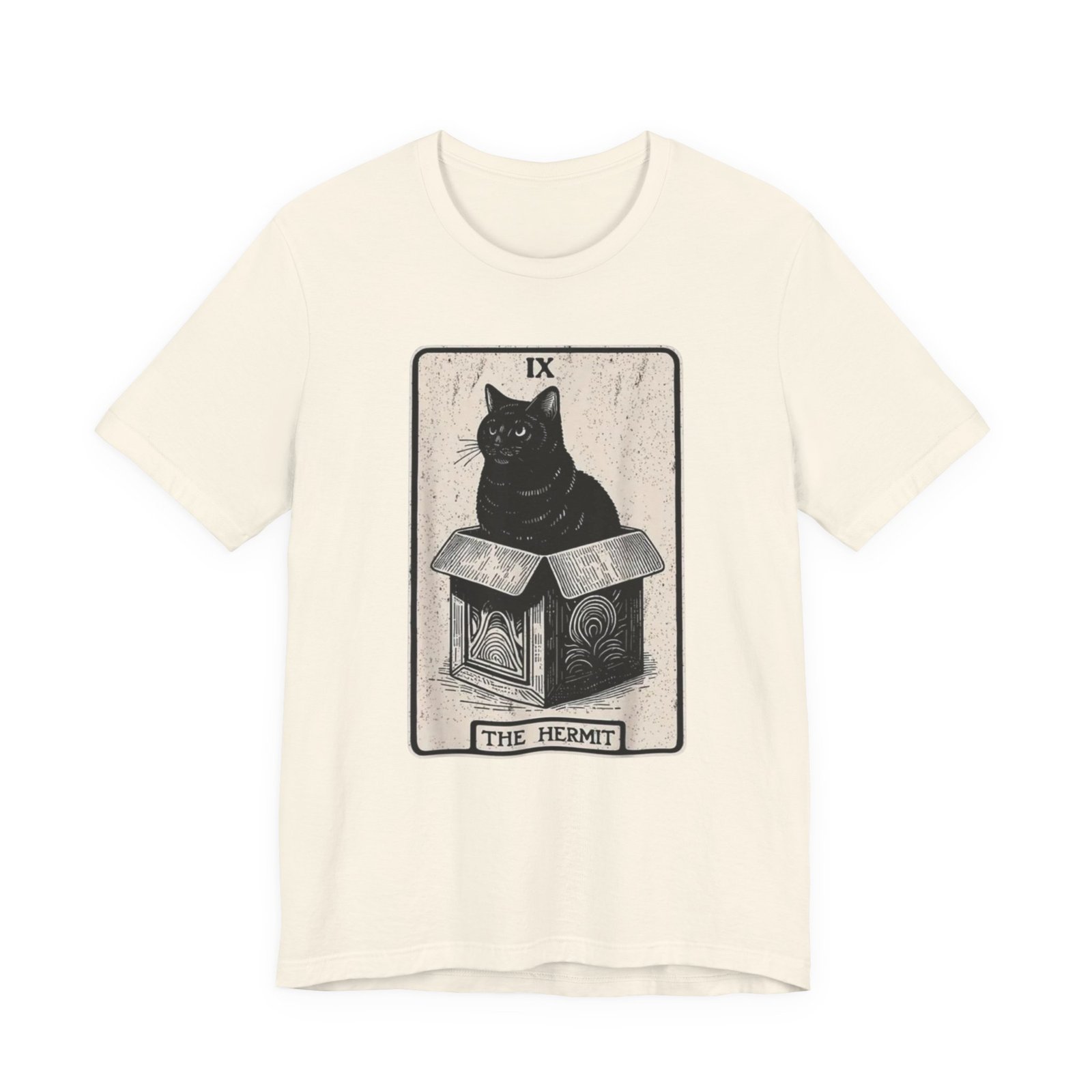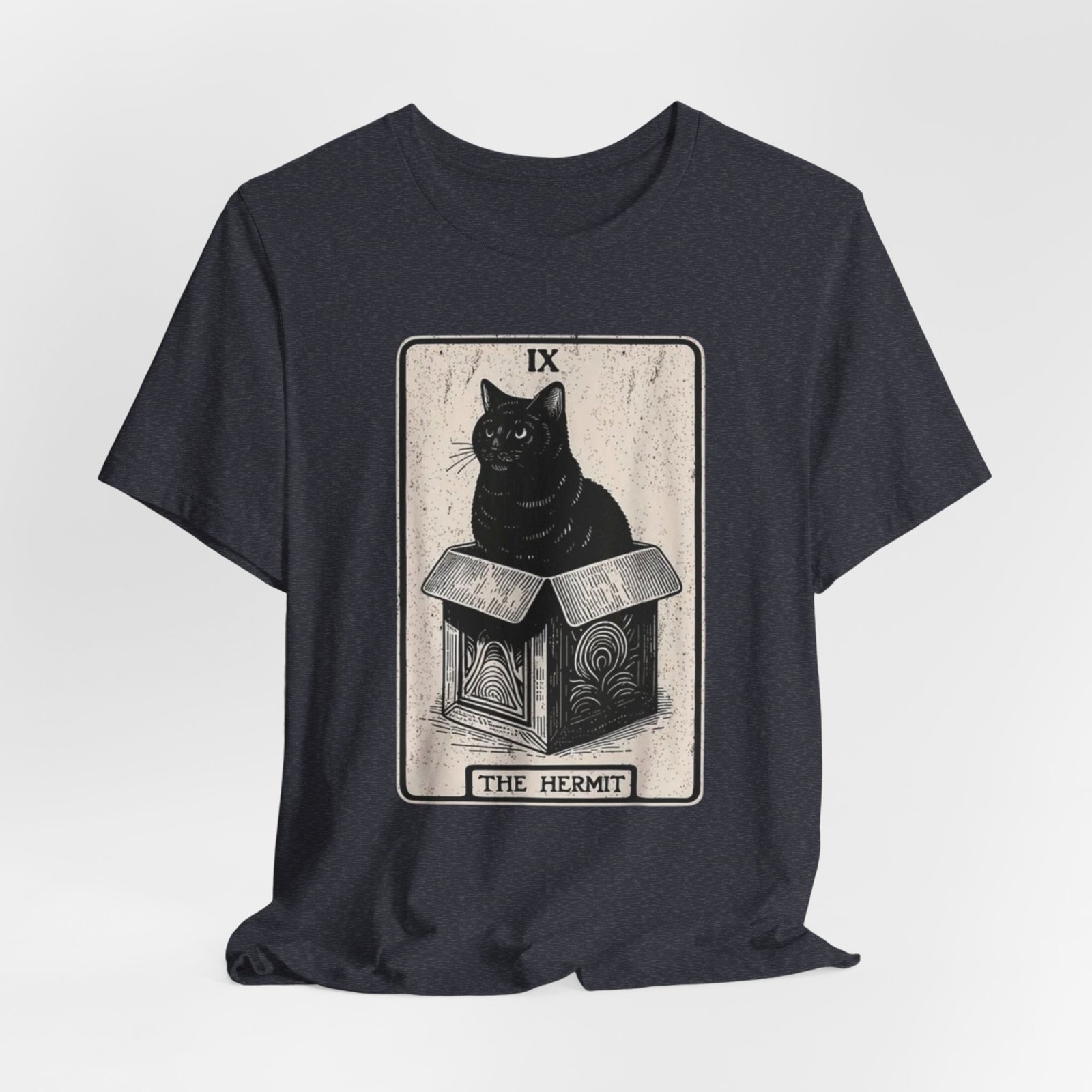 Soft, breathable cotton with a quietly bold print — this tee settles in like a familiar old friend. The front features a detailed, tarot-inspired illustration: a black cat perched on a carved box beneath the title “The Hermit.” Inked in muted tones, the art reads as thoughtful and a little mysterious, blending vintage card aesthetics with modern street style. Wear it while wandering bookshops, sketching at a café, or layering under a worn jacket for evenings at a low-lit show. The crew neckline and retail fit keep the silhouette clean and wearable; the lightweight Airlume cotton feels gentle against the skin and breathes through long days. Ethically made blanks and a tear-away label mean comfort without compromise. This shirt resonates with people who favor quiet symbolism, cozy routines, and artful details that reveal themselves over time.
