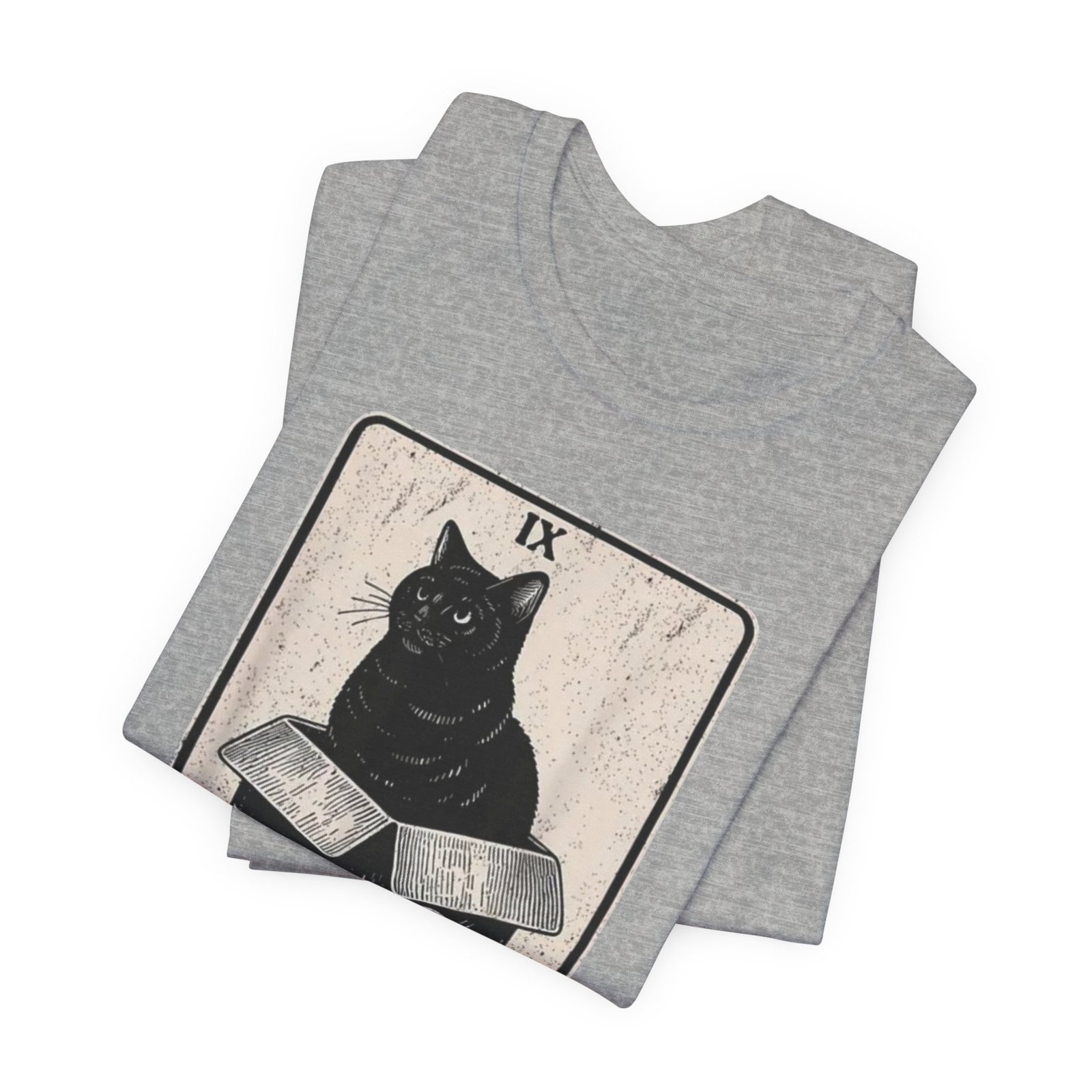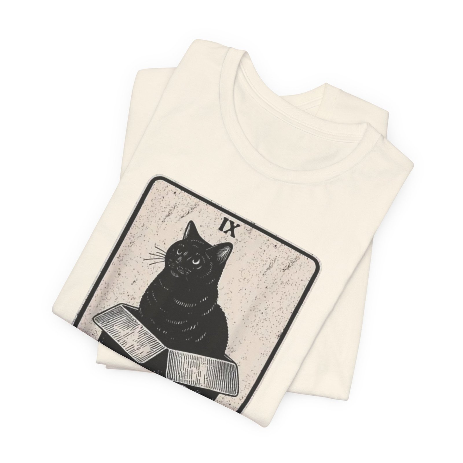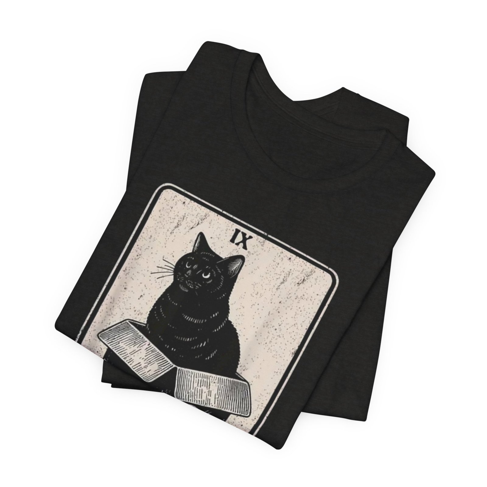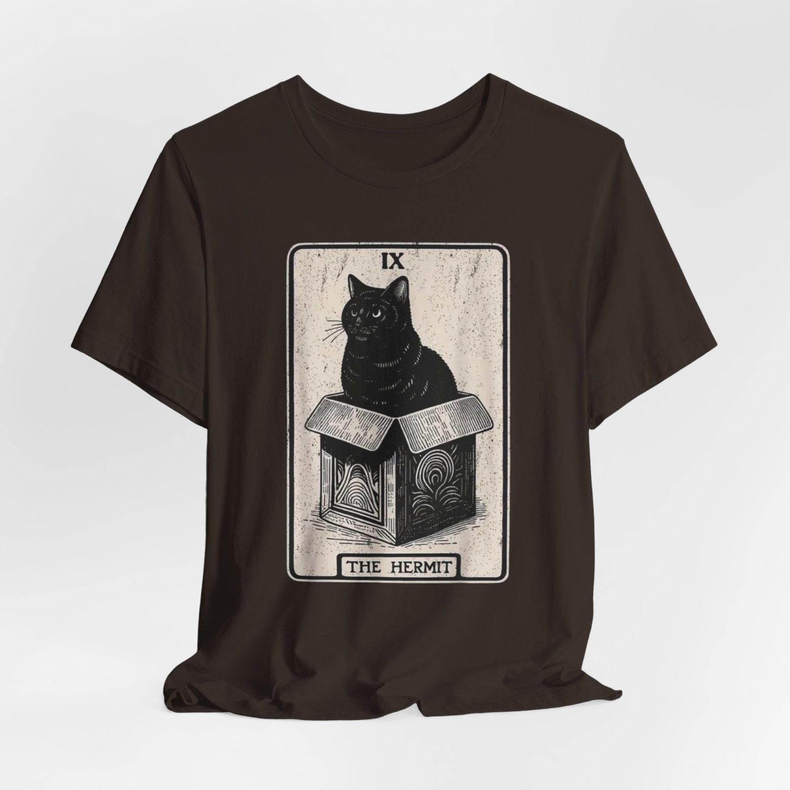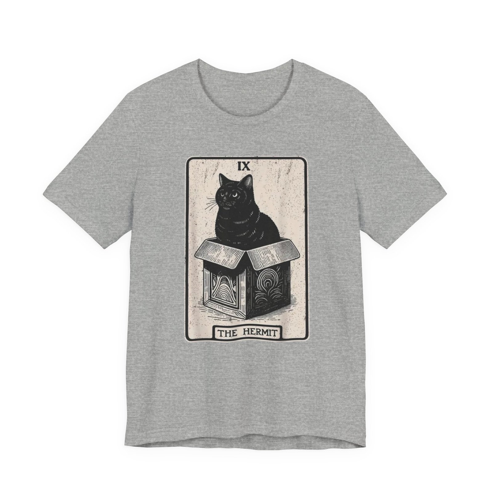 Soft, breathable cotton with a quietly bold print — this tee settles in like a familiar old friend. The front features a detailed, tarot-inspired illustration: a black cat perched on a carved box beneath the title “The Hermit.” Inked in muted tones, the art reads as thoughtful and a little mysterious, blending vintage card aesthetics with modern street style. Wear it while wandering bookshops, sketching at a café, or layering under a worn jacket for evenings at a low-lit show. The crew neckline and retail fit keep the silhouette clean and wearable; the lightweight Airlume cotton feels gentle against the skin and breathes through long days. Ethically made blanks and a tear-away label mean comfort without compromise. This shirt resonates with people who favor quiet symbolism, cozy routines, and artful details that reveal themselves over time.