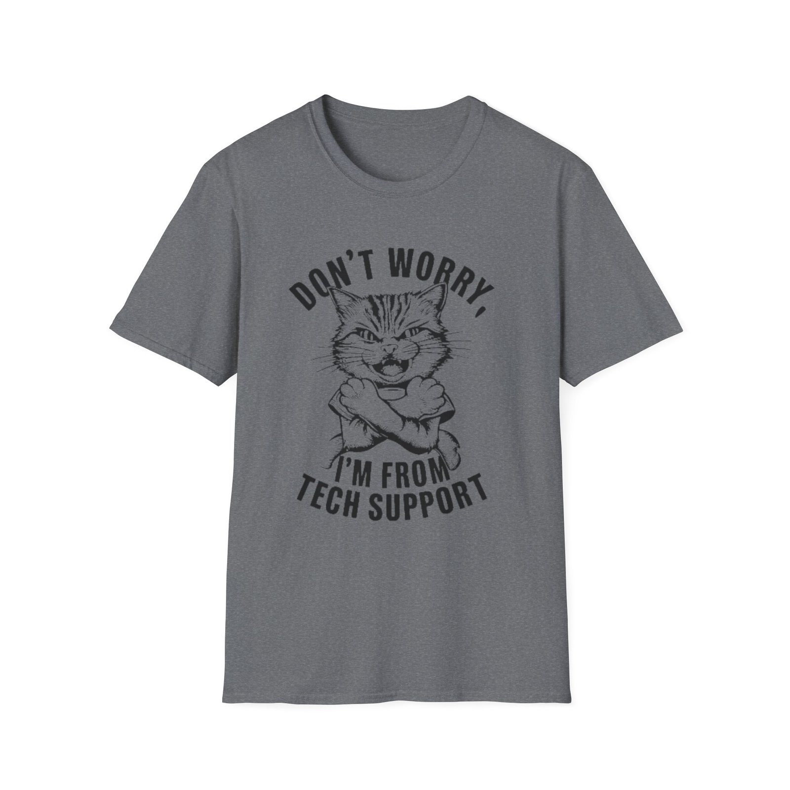 Lightweight, soft, and quietly confident — this tee carries a grin and a message. A cheeky illustrated cat folds its paws and declares “Don’t worry, I’m from tech support,” bringing a little wry humor to long help-desk shifts, conference days, and remote stand-ups. The slim crew neck and classic cut sit comfortably under a hoodie or blazer. Wear it to the office when you want coworkers to smile, to meetups when you want to break the ice, or on laid-back weekends when you’re the go-to gadget person among friends. The subtle natural flecks in the undyed option and a soft, breathable hand make it feel lived-in from the first wear.