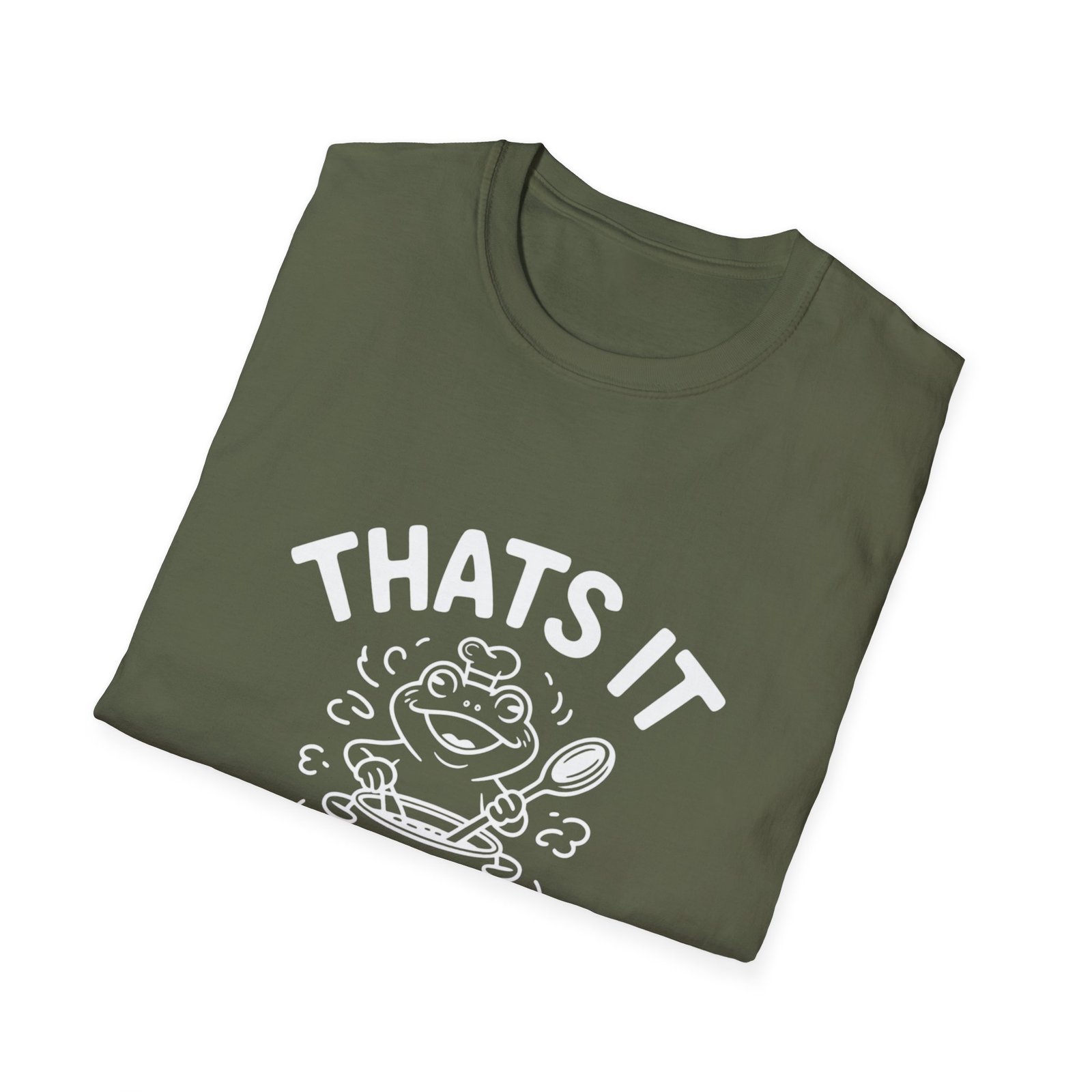 Lightweight and soft, this cotton tee wears like a lived-in classic and speaks with a wink. A bold, hand-drawn chef stirring an oversized pot sits beneath the headline “THATS IT” and the line “YOU’RE GOING IN THE SOUP” — a playful, slightly rebellious design for people who cook, banter, or just enjoy kitchen humor. The crew neck and clean silhouette layer easily under an apron or jacket. It’s breathable enough for a busy shift at the stove and relaxed enough for post-dinner lounging, carrying a sense of warmth, mischief, and home-cooked personality.
