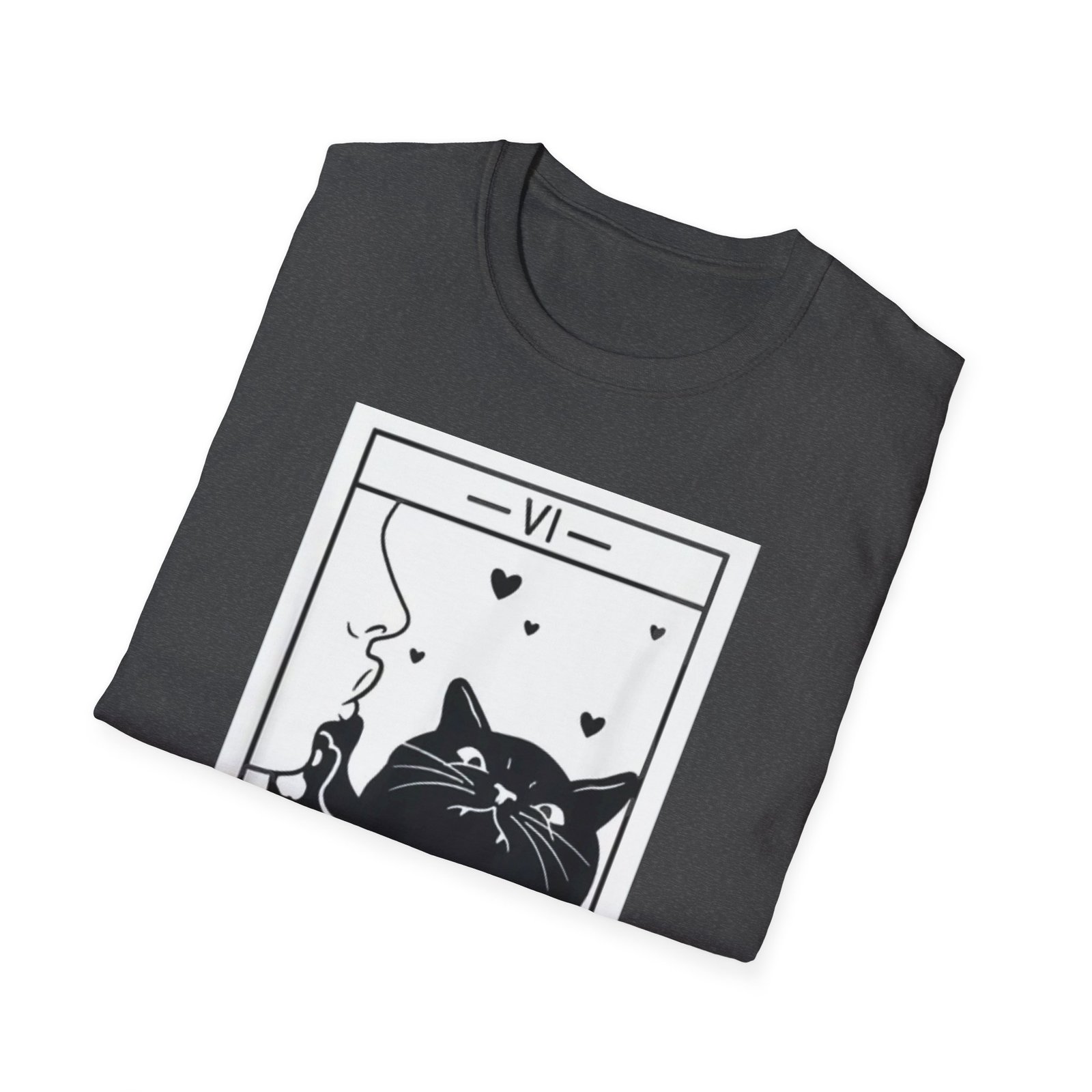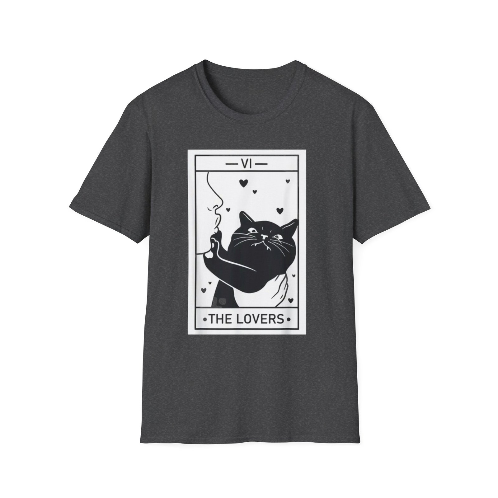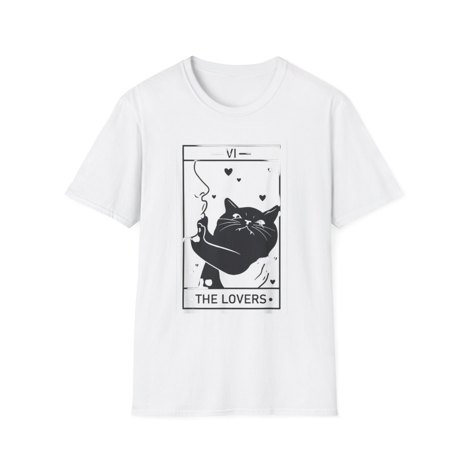 A soft, lightweight tee that reads like a little tarot story you can wear. The front shows a bold black-and-white “The Lovers” tarot card reimagined with a relaxed, whiskered cat blowing heart-shaped smoke — playful, mysterious, and quietly romantic. The fabric feels smooth against the skin and drapes cleanly thanks to its classic crew neckline and timeless fit. Wear it on slow mornings with coffee, to low-key meetups with fellow mystic-cat fans, or layered under a jacket for evenings at tarot nights and small gatherings. This shirt keeps the focus on the illustration: simple lines, high-contrast printing, and a thoughtful mood that invites smiles and double-takes.
