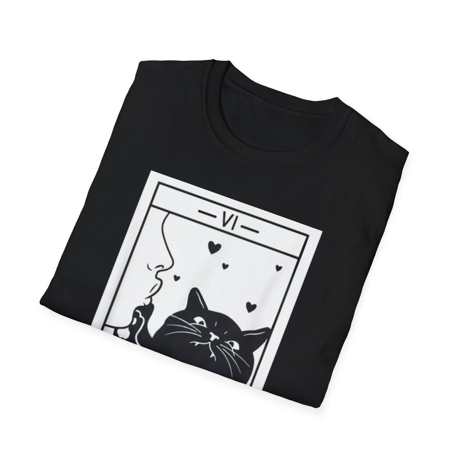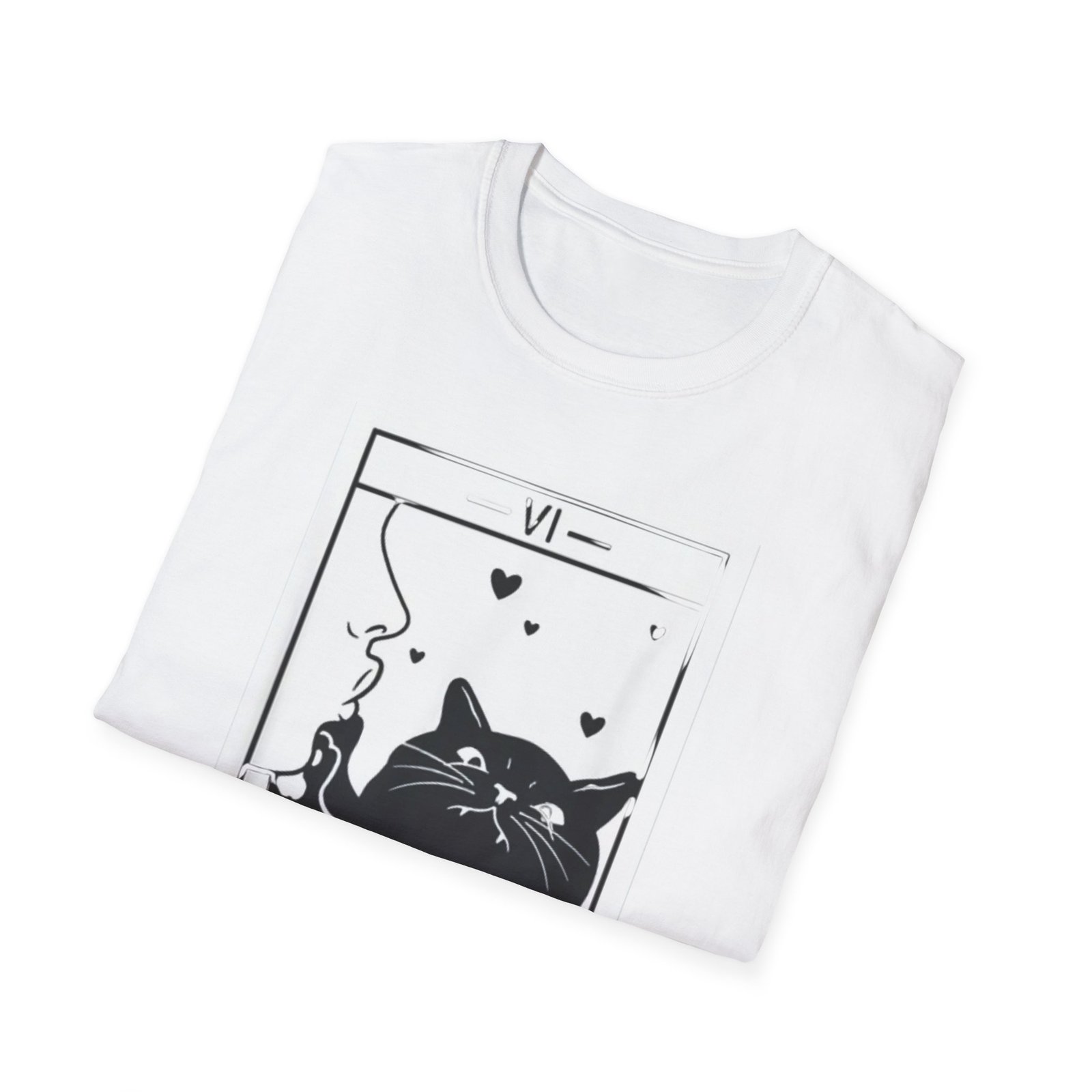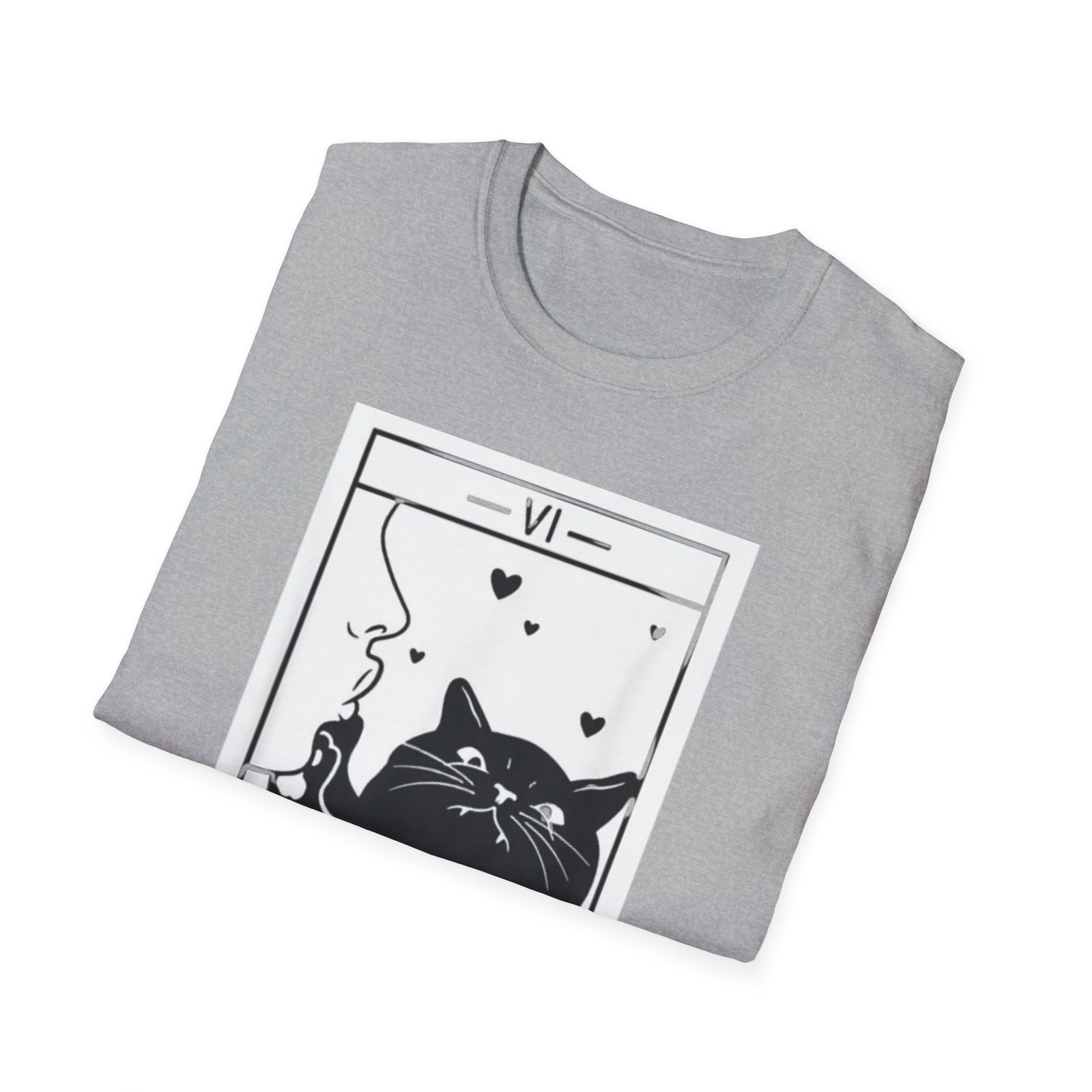 A soft, lightweight tee that reads like a little tarot story you can wear. The front shows a bold black-and-white “The Lovers” tarot card reimagined with a relaxed, whiskered cat blowing heart-shaped smoke — playful, mysterious, and quietly romantic. The fabric feels smooth against the skin and drapes cleanly thanks to its classic crew neckline and timeless fit. Wear it on slow mornings with coffee, to low-key meetups with fellow mystic-cat fans, or layered under a jacket for evenings at tarot nights and small gatherings. This shirt keeps the focus on the illustration: simple lines, high-contrast printing, and a thoughtful mood that invites smiles and double-takes.